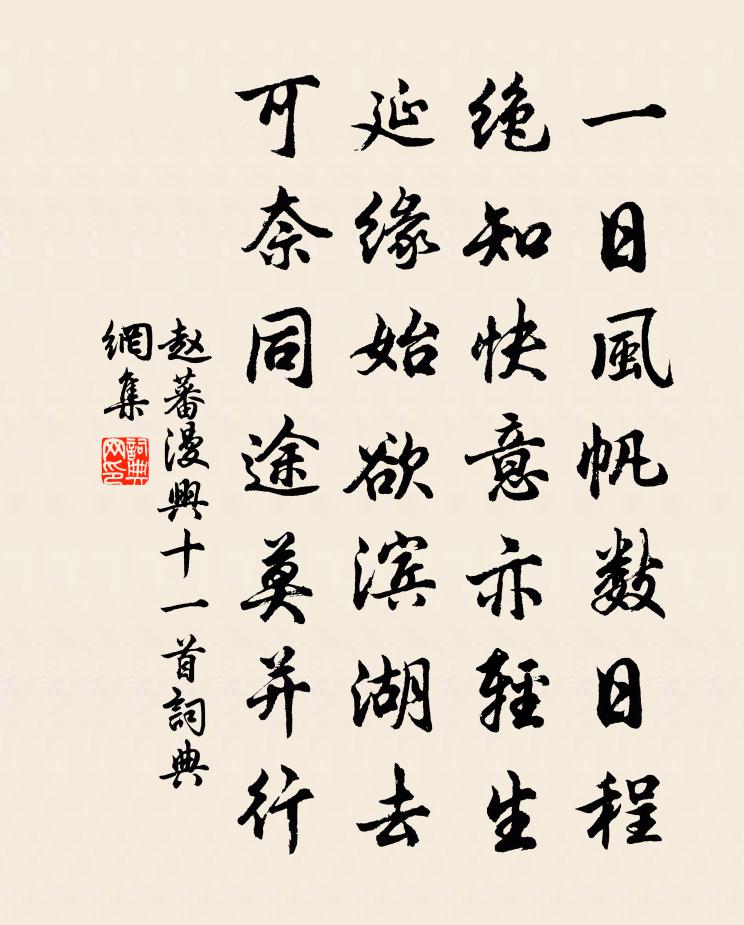 詩詞名句歷史字典書法欣賞書法字典國語詞典說文解字康熙字典古漢語字典標 題 作 者 詩 句 漫興十一首作者:趙蕃 朝代:宋代漫興十一首原文一日風帆數日程,絕知快意亦輕生。延緣始欲濱湖去,可奈同途莫並行。詩詞問答問:漫興十一首的作者是誰?答:趙蕃問:漫興十一首寫於哪個朝代?答:宋代趙蕃漫興十一首書法欣賞漫興十一首書法作品詩詞推薦秋霖中奉裴令公見招早出赴會馬上先寄六韻白居易〔唐代〕雨暗三秋日,泥深一尺時。老人平旦出,自問欲何之。不是尋醫藥,非乾送別離。素書傳好語,絳帳赴佳期。續借次韻答宗汝為初夏見寄黃庭堅〔宋代〕宮蛙無時休,不知憂復樂。夕暉半規黃,冉冉納暮壑。鳥栖松隕花,風下竹解籜。南箕與北斗,磊磊貫纓絡。懷我蕙蘭芳方千里〔宋代〕庭院雨晴,倚斜照、睡余雙鶩。正學染修蛾,官柳細勻黛綠。繡簾半卷,透笑語、瑣窗華屋。帶脆聲咽韻,遠近時避亂司空圖〔唐代〕離亂身偶在,竄跡任浮沉。虎暴荒居迥,螢孤黑夜深。臨洮泛舟,趙仙舟自北庭罷使還京岑參〔唐代〕白 * 台使,邊功竟不成。雲沙萬里地,孤負一書生。池上風回舫,橋西雨過城。醉眠鄉夢罷,東望羨歸程。依韻和希深立春後祀風伯雨師畢過午橋莊梅堯臣〔宋代〕青郊誰駐馬,謝客思池塘。野水微波綠,江梅嫩蕊黃。初從奠風雨,遂此樂壺觴。已愛幽禽語,園林即日芳。旅行(一作金陵道中)殷堯藩〔唐代〕煙樹寒林半有無,野人行李更蕭疏。堠長堠短逢官馬,山北山南聞鷓鴣。萬里關河成傳舍,五更風雨憶呼盧。寂寥雜述林泳〔宋代〕唐士有非國語,漢人曾反離騷。依本定非筆傑,愛奇自是人豪。題耕織圖二十四首奉懿旨撰趙孟頫〔元代〕四月夏氣清,蠶大已屬眠。高首何昂昂,蛾眉復娟娟。不憂桑葉少,遍野如綠煙。相呼攜筐去,迢遞立遠阡。梯空迎享送神馬光祖〔宋代〕長江兮淙淙,踞虎兮蟠龍。秀群英兮禮樂,覽千古兮焉窮。蹇誰留兮青溪,穆將愉兮壽宮。思至德兮肇蒼姬,避聖還自伊山過金城宿覺慧寺贈始寧禪師王洋〔宋代〕家山三百里,處處逐流水。舟行鑒影中,塵埃不須洗。人言田間苦,我言田舍好。濁醪三兩杯,沈憂積如掃。昨與徐季節輓詞樓鑰〔宋代〕公府推徐穉,山陽薦仲車。盛時遺此老,沒世竟窮廬。行道嗟無命,傳家幸有書。魯山終不識,撫卷倍欷歔。折柳篇許景先〔唐代〕春色東來度渭橋,青門垂柳百千條。長楊西連建章路,漢家林苑紛無數。縈花始遍合歡枝,遊絲半罥相思樹。春樓夔州旱李復〔宋代〕夔人耕山灰作土,散火滿山龜卜雨。春日不知秋有飢,下種計粒手中數。七月八月旱天紅,日腳散血龍似鼠。汙邪扇子詩李石〔宋代〕隱几今昔兩個,臥床左右一邊。正要腳根著地,莫教火焰燒天。滿庭芳(壽通判七月二十二日)方岳〔宋代〕星昴呈祥,山川鍾秀,果然生此真賢。精神瑩澈,秋水共長天。況值西風初起,中元過、七日涼先庭院爽,稱觴賀臨江仙尹志平〔元代〕參透全真清靜法,何勞相上經求。好於此處覓蹤由。莫生迷執見,休要不回頭。真性如何能寂滅,真空空外閒搜。高陽台(和巽吾韻)劉辰翁〔宋代〕雨枕鶯啼,露班燭散,御街人賣花窠。過眼無情,而今魂夢年多。百錢曳杖橋邊去,問幾時、重到明河。便人問,送吳秀才曾鞏〔宋代〕一年過臘已十日,余日到春能有幾。春來遠近不可問,冷碧先歸在流水。梅花向今獨已繁,玉艷都占春風間。草萌水龍吟(登吳江橋作)毛並〔宋代〕渺然震 * 來,太湖望極平無際。三吳風月,一江煙浪,古今絕致。羽化蓬萊,胸吞雲夢,不妨如此。看垂虹千丈名句推薦凡所有相。皆是虛妄。若見諸相非相。則見如來。鳩摩羅什譯《金剛經·如理實見》 隨侯之珠,國寶也,然用之彈,曾不如泥丸劉向《說苑·雜言》 出其東門,有女如雲。佚名《出其東門》 日長唯鳥雀,春遠獨柴荊。杜甫《春遠 / 春運》 風吹芳蘭折,日沒鳥雀喧。李白《送裴十八圖南歸嵩山二首》 催成清淚,驚殘孤夢,又揀深枝飛去。陸游《鵲橋仙·夜聞杜鵑》 惜恐鏡中春。不如花草新。張先《菩薩蠻·憶郎還上層樓曲》 只言啼鳥堪求侶,無那春風欲送行。高適《夜別韋司士》 圖未就之功,不如保已成之業洪應明《菜根譚·概論》 青山隱隱水迢迢,秋盡江南草未凋。杜牧《寄揚州韓綽判官》