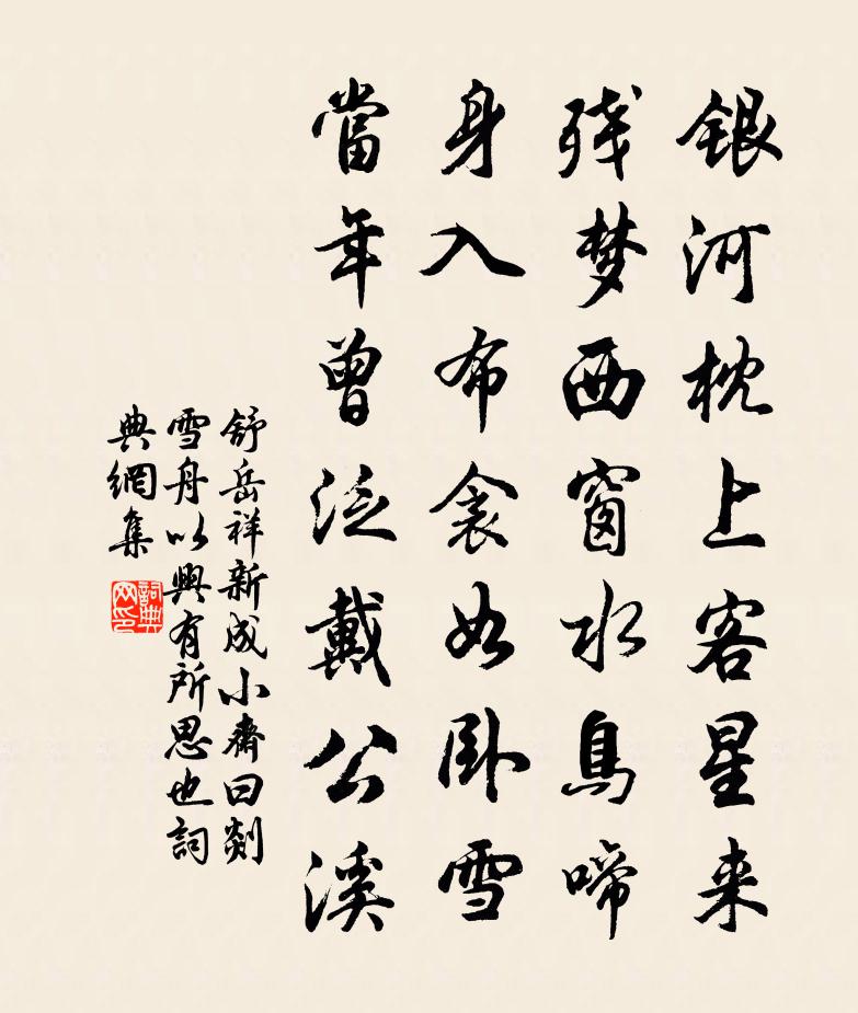詩詞名句歷史字典書法欣賞書法字典國語詞典說文解字康熙字典古漢語字典標 題 作 者 詩 句 新成小齋曰剡雪舟以興有所思也作者:舒岳祥 朝代:宋代原文銀河枕上客星來,殘夢西窗水鳥啼。身入布衾如臥雪,當年曾泛戴公溪。詩詞問答問:《新成小齋曰剡雪舟以興有所思也》的作者是誰?答:舒岳祥問:該詩寫於哪個朝代?答:宋代書法欣賞新成小齋曰剡雪舟以興有所思也書法作品詩詞推薦奉和經略龐龍圖延州南城入詠迎薰亭司馬光〔宋代〕華館壓清波,坐待南風至。須知明牧賢,善達吾君意。青杏兒周權〔元代〕兩鬢點霜花,漢南柳、心事蹉跎。幼輿只合居岩谷,繩床近竹,柴門臨水,任我婆娑。詩老日相過。愛蒼苔、屐齒山泉(一作李才江詩)楊發〔唐代〕半空飛下水,勢去響如雷。靜徹啼猿寺,高陵坐客台。耳同經劍閣,身若到天台。濺樹吹成凍,鄰祠觸作灰。深中虎丘六絕句點頭石范成大〔宋代〕當年揮塵講何經,賺得堅頑側耳聽。我自吟詩無法說,石頭莫作定盤星。送周六赴濠州戶曹二首張耒〔宋代〕老顒有婦何妨道,一室蕭然尚愧君。但恐小喬來丈室,卻須射虎作將軍。送司空曙之蘇州苗發〔唐代〕盤門吳舊地,蟬盡草秋時。歸國人皆久,移家君獨遲。廣陵經水宿,建鄴有僧期。若到西霞寺,應看江總碑。中元夜李郢〔唐代〕江南水寺中元夜,金粟欄邊見月娥。紅燭影回仙態近,翠鬟光動看人多。香飄彩殿凝蘭麝,露繞輕衣雜綺羅。湘水按部至潮州題大顛堂壁周敦頤〔宋代〕退之自謂如夫子,原道深排釋老非。不識大顛何似者,數書珍重更留衣。新回車院筵上作劉兼〔唐代〕回車院子未回車,三載疲民詠袴襦。借寇已承英主詔,乞骸須上老臣書。黃金蜀柳籠朱戶,碧玉湘筠映綺疏。因問宮人斜吳龍翰〔宋代〕碧石重重鎖墓門,蘭膏點火照黃昏。春風幾度生芳草,還似君王舊日恩。題聳寒圖二絕周必大〔宋代〕浪傳魁梧越滄溟,過譽清夷得好銘。今見畫圖寒乞甚,心聲心畫果難形。華亭百詠石獸許尚〔宋代〕刻鑿知何謂,彌年亦有神。宵行無足怪,一吼已驚人。書竄梅堯臣〔宋代〕皇佑辛卯冬,十月十九日。御史 * 方,危言初造膝。曰朝有巨奸,臣介所憤嫉。願條一二事,臣職非妄率。巨奸頌古十首釋慧空〔宋代〕尀耐溈山老鬼精,垂鉤便要釣鯤鯨。幾多頭多為龍去,蝦蟹依前努眼睛。和黃執禮六首胡寅〔宋代〕文才久合步蟾宮,未肯爭搏九萬風。剩欲論詩宗典樂,故應憐我隸司空。高山宛在綠琴里,白髮從多清鏡中。要識寧宗郊祀二十九首學士院〔宋代〕帝登初觴,禮岩再興。精明滿昭,齊顒洞貫。靈娭留俞,神光炳煥。我宋受福,永壽於萬。次韻元發弟秋日德余庵書事二首王之道〔宋代〕飽諳世事轉疏慵,投老猶能向佛宮。危坐遂移桑蔭日,清談仍對菊花風。憑君為我追歡伯,自此游山作醉翁。聞說句勾台符〔宋代〕胚渾鑿開元精結,三十六峰排截嶭。送乾康禪師入山過夏齊己〔唐代〕由來喧滑境,難駐寂寥蹤。逼夏搖孤錫,離城入亂峰。雲門應近寺,石路或穿松。知在棲禪外,題詩寄北宗。南豐先生輓詞陳師道〔宋代〕早棄人間事,真從地下游。丘原無起日,江漢有東流。身世從違里,功名取次休。不應須禮樂,始作後程仇。名句推薦明年此會知誰健?醉把茱萸仔細看。杜甫《九日藍田崔氏莊》 春陽如昨日,碧樹鳴黃鸝。李白《秋思》 疏是枝條艷是花,春妝兒女競奢華。曹雪芹《詠紅梅花得“花”字》 言不中,行不謹,辱也。王通《中說·卷一·王道篇》 讀書不下苦功,妄想顯榮,豈有此理?王永彬《圍爐夜話·第一一四則》 換我心,為你心,始知相憶深。顧夐《訴衷情·永夜拋人何處去》 不足於行者,說過;不足於信者,誠言。荀子《荀子·大略》 夢後樓台高鎖,酒醒簾幕低垂。晏幾道《臨江仙·夢後樓台高鎖》 今日斗酒會,明旦溝水頭。卓文君《白頭吟》 林表明霽色,城中增暮寒。祖詠《終南望余雪》