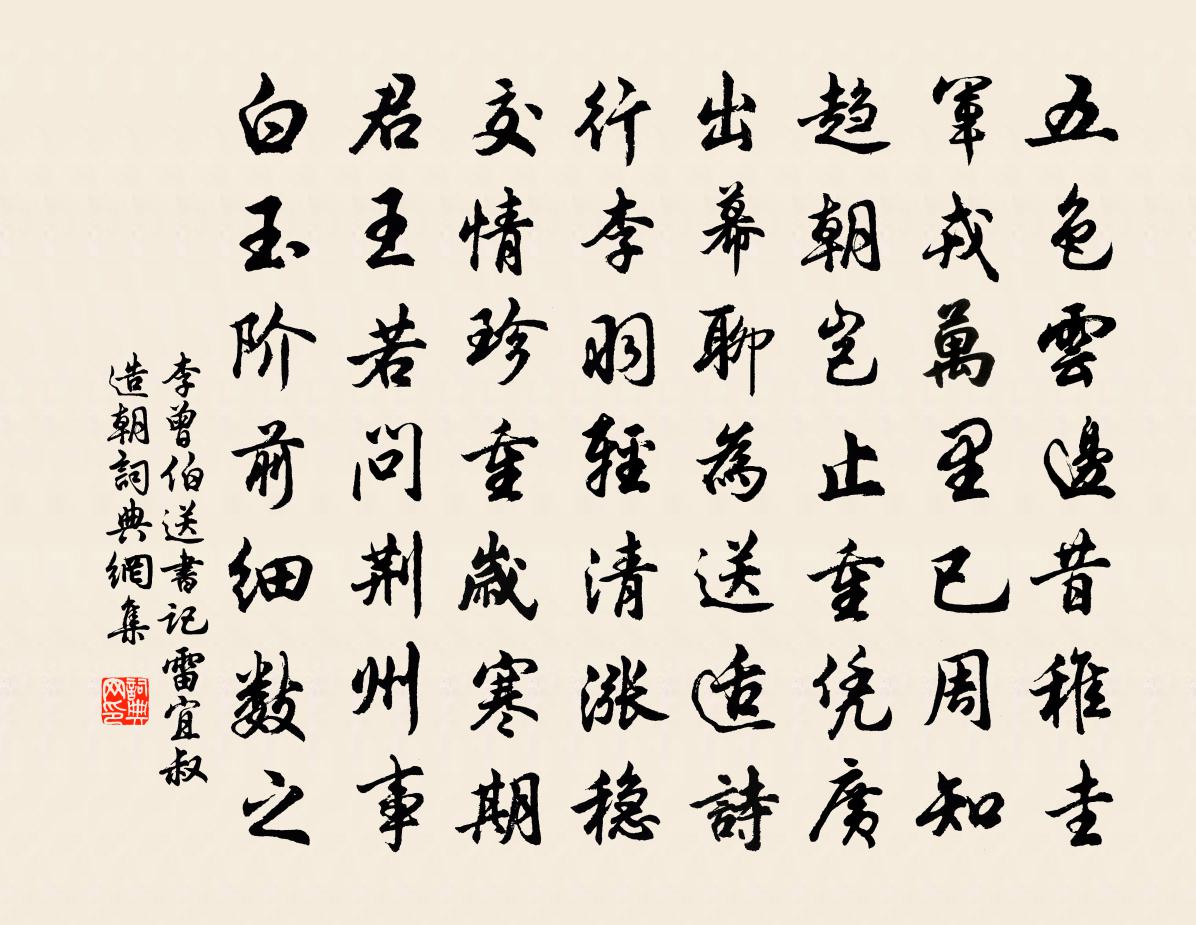 詩詞名句歷史字典書法欣賞書法字典國語詞典說文解字康熙字典古漢語字典標 題 作 者 詩 句 送書記雷宜叔造朝作者:李曾伯 朝代:宋代送書記雷宜叔造朝原文五色雲邊昔稚圭,軍戎萬里已周知。趨朝豈止重憑廣,出幕聊為送適詩。行李羽輕清漲穩,交情珍重歲寒期。君王若問荊州事,白玉階前細數之。詩詞問答問:送書記雷宜叔造朝的作者是誰?答:李曾伯問:送書記雷宜叔造朝寫於哪個朝代?答:宋代李曾伯送書記雷宜叔造朝書法欣賞送書記雷宜叔造朝書法作品詩詞推薦菩薩蠻(梅)謝薖〔宋代〕相思一夜庭花發。窗前忽認生塵襪。曉起艷寒妝。雪肌生暗香。佳人縴手摘。手與花同色。插鬢有誰宜。惟應潘玉若耶溪上陸游〔宋代〕九月霜風吹客衣,溪頭紅葉傍人飛。村場酒薄何妨醉,菰正堪烹蟹正肥。劉叔茂及第後往廣德拜親過吳江新治強至〔宋代〕今歲同升客,如君有幾人。青年登一第,白首具雙親。喜氣生軍壘,歡迎聚邑民。諸兄在天祿,勉去繼清塵。落花嚴肅〔宋代〕片片落花飛,隨風去不歸。如何臨欲別,不得傍君衣。次韻超然與折桂覺大師兼簡方丈老釋正覺〔宋代〕束肚三條篾,恬然臥家林。機深大仰寂,用捷長沙岑。空壑溪鳴玉,疏筠月漏金。東山師叔在,此道未浮沈。句高似孫〔宋代〕蟳肥和雪鱠,梅早夾春篘。蝶戀花·庭院深深深幾許歐陽修〔宋代〕庭院深深深幾許,楊柳堆煙,簾幕無重數。玉勒雕鞍遊冶處,樓高不見章台路。雨橫風狂三月暮,門掩黃昏,無計密庵題柱二首劉學箕〔宋代〕五更清夢雞喚醒,八月好景詩為催。秋蟲夜靜野禽語,風木天寒山雨來。菩薩蠻蘇軾〔宋代〕碧紗微露纖纖玉。朱唇漸暖參差竹。越調變新聲。龍吟徹骨清。夜來殘酒醒。惟覺霜袍冷。不見斂眉人。胭脂覓舊烏夜啼·春思趙令畤〔宋代〕樓上縈簾弱絮,牆頭礙月低花。年年春事關心事,腸斷欲棲鴉。舞鏡鸞衾翠減,啼珠鳳蠟紅斜。重門不鎖相思夢,蝶戀花佚名〔宋代〕海角芳菲留不住。筆下風生,飛入青雲去。仙籙有名天賜與。致君事業安排取。要識世間平坦路。當使人人,各有贈丘先生鄭巢〔唐代〕雲泉心不爽,垂日坐柴關。硯取檐前雨,圖開異國山。原僧招過宿,沙鳥伴長閒。地與中峰近,殘陽獨不還。辛亥元日游聞人省庵園和陳藥房韻林尚仁〔宋代〕倚欄吟未穩,把酒問溪山。今日又添歲,一冬無此閒。梅花依竹靜,雪意避春慳。次第燈期近,重逢一解顏。郡齋水閣閒書相如文同〔宋代〕相如何必稱病,靖節奚須去官。就下其誰不許,如愚是處皆安。公館文同〔宋代〕公館書沈沈,煙雲晚作陰。琴軒冰沼淨,書閣火爐深。默坐自有得,閒行誰可尋,還應上高閣,看雪一千岑。春日雜興陸游〔宋代〕出仕常騎禿尾驢,歸休自駕折轅車。今朝偶遇林夫子,借得齊民一卷書。周濤權宰大冶以湖光亭詩見寄因和之金君卿〔宋代〕面揖清光萬頃陂,滿簾秋色曙陰微。迴環遠岫煙中辯,片段閒雲鏡里飛。富冶地饒民訟簡,洞庭風便客舟稀。知君題朝陽亭程珌〔宋代〕暉暉朝陽亭,亭前鍾阜青。岩險尚積雪,光彩浮初晴。亭下清溪水,滑流新泮冰。雙鳧知隨陽,亦逐流澌行。亭中懷舊第一百八文天祥〔宋代〕故人入我夢,相視涕闌乾。四海一塗炭,焉用身獨完。落花鄭昈〔唐代〕早春見花枝,朝朝恨發遲。直看花落盡,卻意未開時。以此方人世,彌令感盛衰。始知山簡繞,頻向習家池。名句推薦不教而誅,則刑繁而邪不勝;教而不誅,則奸民不懲。荀子《荀子·富國》 無限傷心夕照中,故國淒涼,剩粉余紅。夏完淳《一剪梅·詠柳》 人生百年有幾,念良辰美景,休放虛過。元好問《驟雨打新荷》 古人學問無遺力,少壯工夫老始成。陸游《冬夜讀書示子聿》 君子多知而擇焉,博學而算焉,多言而慎焉。戴聖《大戴禮記·曾子立事第四十九》 足國之道:節用裕民,而善臧其餘。荀子《荀子·富國》 風急桃花也似愁,點點飛紅雨。如晦《楚天遙過清江引·有意送春歸》 強自取柱,柔自取束。荀子《荀子·勸學》 落葉他鄉樹,寒燈獨夜人。馬戴《灞上秋居》 金河秋半虜弦開,雲外驚飛四散哀。杜牧《早雁》