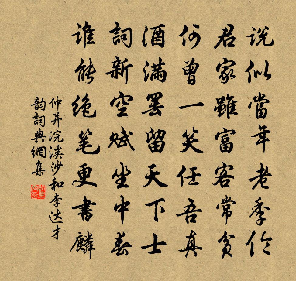 詩詞名句歷史字典書法欣賞書法字典國語詞典說文解字康熙字典古漢語字典標 題 作 者 詩 句 浣溪沙(和李達才韻)作者:仲並 朝代:宋代浣溪沙(和李達才韻)原文說似當年老季倫。君家雖富客常貧。何曾一笑任吾真。酒滿罷留天下士,詞新空賦坐中春。誰能絕筆更書麟。詩詞問答問:浣溪沙(和李達才韻)的作者是誰?答:仲並問:浣溪沙(和李達才韻)寫於哪個朝代?答:宋代問:浣溪沙(和李達才韻)是什麼體裁?答:詞仲並浣溪沙(和李達才韻)書法欣賞浣溪沙(和李達才韻)書法作品詩詞推薦上耿泉生朝楊簡〔宋代〕是司九府,爰總數路。爰究爰度,阜豐化布,國用是裕。寄王尚書陳造〔宋代〕一昨家庭拜帝綸,熊轓催去不逡巡。小遲繡袞升元輔,復向蓬萊作主人。竹馬未迎歡意浹,蒲鞭重試教條新。詩賡蝶戀花佚名〔宋代〕海角芳菲留不住。筆下風生,飛入青雲去。仙籙有名天賜與。致君事業安排取。要識世間平坦路。當使人人,各有黃雀食新二首楊萬里〔宋代〕侯門信口總稱珍,只見陳人不見新。三日荔投香味變,況開醬瓿柫蛛塵。長別離吳邁遠〔南北朝〕生離不可聞,況復長相思。如何與君別,當我盛年時。蕙華每搖盪,妾心長自持。榮乏草木歡,悴極霜露悲。富貴菩薩蠻蘇軾〔宋代〕濕雲不動溪橋冷。嫩寒初透東風影。橋下水聲長。一枝和月香。人憐花似舊。花比人應瘦。莫憑小欄乾。夜深花正同象之方叔過淨因璉上人韓維〔宋代〕二十年來野逸身,懶能奔走傍埃塵。偶逢閭里閒遊伴,同過叢林燕坐人。世事糾紛寧有盡,勞生蕭散不妨頻。晴陽句曾惇〔宋代〕家貧只舊醅,不辦樽中醁。但煮官焙香,炊飯膾魚腹。刺巴郡守詩佚名〔兩漢〕狗吠何喧喧,有吏來在門。披衣出門應,府記欲得錢。語窮乞請期,吏怒反見尤。旋步顧家中,家中無可為。思往乙未歲除二首方回〔宋代〕五十五時官早休,即今七十復何求。亦思稍為兒孫計,政恐深貽祖父羞。豈不憶家良有說,偶然得酒更無憂。諸公浪淘沙仇遠〔宋代〕芍藥小紗窗。唾碧茸長。粉香猶涴舊時妝。玉佩丁東仙步遠,好處難忘。草草賦高唐。終是荒涼。涼蟾飛入合歡床句王安石〔宋代〕乞米助(疒加辛)鎦。劉正之宜樓四章黃榦〔宋代〕山以靜故高,水以靜故深。福祿豈外求,萬感皆人心。減字木蘭花沈瀛〔宋代〕且安汝止。快活心中惟法喜。一處通風。萬別千差處處通。腐腸是酒。伐性蛾眉徒損壽。詩到陰何。剗地亂絲頭緒感皇恩陸游〔宋代〕小閣倚秋空,下臨江渚。漠漠孤雲未成雨。數聲新雁,回首杜陵何處。壯心空萬里,人誰許。黃閣紫樞,築壇開府送茶與陳霆用賈閣老韻胡寅〔宋代〕閩相渺天涯,新苟誰與促。對茲火雲候,漫說酒千斛。要須臨水榭,滿啜一甌玉。泠然生兩腋,萬里那更仆。想君九日杜牧〔唐代〕金英繁亂拂欄香,明府辭官酒滿缸。還有玉樓輕薄女,笑他寒燕一雙雙。還東野詩王令〔宋代〕吾於古人少所同,惟識韓家十八翁。其辭浩大無崖岸,有似碧海吞浸秋晴空。此老頗自負,把人常常看。於時未嘗法曲歌頭/法曲曹勛〔宋代〕柱史乘車,青牛駕軛,紫雲覆頂,函關令已前知。西升稍駐,尹喜虔恭誓。求老子。親談道德微旨。五千餘言,俱又三絕文天祥〔宋代〕世事蒙蒙醉不知,南山秋意滿東籬。黃花何故無顏色,應為元嘉以後詩。名句推薦音塵遠,楚天危樓獨倚。陸游《月上海棠·斜陽廢苑朱門閉》 君子將說富貴,必勉於仁也。戴聖《大戴禮記·曾子制言中第五十五》 女蘿發馨香,菟絲斷人腸。李白《古意》 明朝寒食了,又是一年春。顧太清《臨江仙·清明前一日種海棠》 看破的,遁入空門;痴迷的,枉送了性命。曹雪芹《紅樓夢·第五回》 碧玉妝成一樹高,萬條垂下綠絲絛。賀知章《詠柳 / 柳枝詞》 綠池落盡紅蕖卻,荷葉猶開最小錢。楊萬里《秋涼晚步》 浮生長恨歡娛少。宋祁《玉樓春·春景》 思其艱以圖其易佚名《尚書·周書·君牙》 把吳鉤看了,欄桿拍遍,無人會,登臨意。辛棄疾《水龍吟·登建康賞心亭》