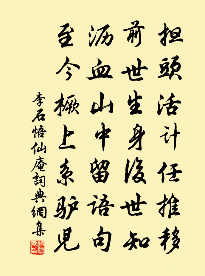 詩詞名句歷史字典書法欣賞書法字典國語詞典說文解字康熙字典古漢語字典標 題 作 者 詩 句 悟仙庵作者:李石 朝代:宋代悟仙庵原文擔頭活計任推移,前世生身後世知。瀝血山中留語句,至今橛上系驢兒。詩詞問答問:悟仙庵的作者是誰?答:李石問:悟仙庵寫於哪個朝代?答:宋代李石悟仙庵書法欣賞悟仙庵書法作品詩詞推薦春貼子詞皇太后閣六首司馬光〔宋代〕裁縫大練成春服,慈儉由來性所鍾。肯使外家矜侈靡,車如流水馬如龍。西江月郭應祥〔宋代〕不但酴醿芍藥,此花亦殿餘春。麝囊初破酒初醺。恰有這般風韻。斕坼真成絕倒,半開猶帶輕顰。不知抵死笑何人臨江仙(壽六十二)彭子翔〔宋代〕佛說波斯王此歲,衰顏羞見河流此首楞嚴。翁今丹臉發光浮。毗盧金 * ,爛熳菊花秋。七個明朝方九日,年年稅勝勝慢(家妓榮奴既出有感)晁補之〔宋代〕朱門深掩,擺盪春風,無情鎮欲輕飛。斷腸如雪,撩亂去點人衣。朝來半和細雨,向誰家、東館西池。算未肯、似二疊劉克莊〔宋代〕環子麗華皆已美,謫仙狎客兩堪悲。懸知千載難湔洗,留下沉香結綺詩。訴衷情吳文英〔宋代〕柳腰空舞翠裙煙。盡日不成眠。花塵浪卷清晝,漸變晚陰天。吳社水,系遊船。又經年。東風不管,燕子初來,一清江引喬吉〔元代〕鳳酥不將肋斗兒勻,巧倩含嬌俊。紅鐫玉有痕,暖嵌花生暈。旋窩兒粉香都是春。金丹詩四十八首張繼先〔宋代〕勞生擾擾疾如風,急殺三彭及五蟲。不使狐狸侵藥灶,須教龍虎守真空。鼎中寶物時添火,腹內嬰貌轉豐。善女善二月初七日壽溪十絕劉克莊〔宋代〕□□寬裁領,蓬頭亂插花。相呼挈牲酒,再拜禱桑麻。山居十首方岳〔宋代〕我愛山居好,新篁綠上竿。草蕃侵路狹,地闊占雲寬。山響棋聲濕,常深樹影寒。柴門底須掩,非意不相干。桂林李商隱〔唐代〕城窄山將壓,江寬地共浮。東南通絕域,西北有高樓。神護青楓岸,龍移白石湫。殊鄉竟何禱,簫鼓不曾休。清平樂 詠雨王夫之〔清代〕歸禽響暝。隔斷南枝徑。不管垂楊珠淚迸。滴碎荷聲千頃。 隨波賺殺魚兒。浮萍乍滿清池,誰信碧雲深處,夕陽醉高歌·感懷姚燧〔元代〕十年燕月歌聲,幾點吳霜鬢影。西風吹起鱸魚興,已在桑榆暮景。榮枯枕上三更,傀儡場頭四並。人生幻化如泡影思遠人王建〔唐代〕妾思常懸懸,君行復綿綿。征途向何處,碧海與青天。歲久自有念,誰令長在邊。少年若不歸,蘭室如黃泉。悼朝雲詩(並引)蘇軾〔宋代〕紹聖元年十一月,戲作《朝雲詩》。三年七月五日,朝雲病亡於惠州,葬之棲禪寺松林中東南,直大聖塔。予既銘慶元二年皇后冊寶十三首佚名〔宋代〕帟施雲舒,金秀棄庭。璇術鑒華,蒨佩垂{左糹右呈}。皇容熙德,柔德順承。三宮齊歡,萬福昭膺。太皇太后閣六首蘇軾〔宋代〕不獨清心能省事,應緣克已自銷兵。傳聞塞外千君長,欲趁新年賀太平。偈頌一百零四首釋紹曇〔宋代〕統御金輪四十年,拱垂衣化育黎元。萬機休罷升遐去,四海無思不斷魂。林間衲子,感戴深恩。合掌迎歸兜率院,江漲徐寶之〔宋代〕萬里吳江湘浦圖,一春摹在小村隅。南山欲霽北山雨,昨日平濤今日湖。荻岸出時知水減,桐花過後有寒無。老漁上平西(惜春)程垓〔宋代〕愛春歸,憂春去,為春忙。旋點檢、雨障雲妨。遮紅護綠,翠帷羅幕任高張。海棠明月杏花天,更惜濃芳。喚鶯吟名句推薦永豐柳,無人盡日飛花雪。張先《千秋歲·數聲鶗鴂》 夸而有節,飾而不誣劉勰《文心雕龍·誇飾》 風裡落花誰是主?思悠悠。李璟《攤破浣溪沙·手卷真珠上玉鉤》 已覺逝川傷別念,復看津樹隱離舟。王勃《秋江送別二首》 露清枕簟藕花香,恨悠揚。顧敻《虞美人·觸簾風送景陽鍾》 指點江山,激揚文字,糞土當年萬戶侯 * 《沁園春·長沙》 紛紛紅紫已成塵,布穀聲中夏令新。陸游《初夏絕句》 明年豈無年,心事恐蹉跎。蘇軾《守歲》 德不孤,必有鄰。孔子弟子《論語·里仁篇》 以正治國,以奇用兵,以無事取天下。老子《老子·德經·第五十七章》