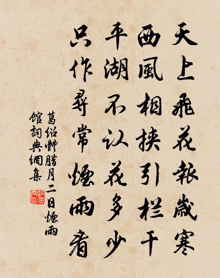 詩詞名句歷史字典書法欣賞書法字典國語詞典說文解字康熙字典古漢語字典標 題 作 者 詩 句 臘月二日煙雨館作者:葛紹體 朝代:宋代臘月二日煙雨館原文天上飛花報歲寒,西風相挾引欄乾。平湖不認花多少,只作尋常煙雨看。詩詞問答問:臘月二日煙雨館的作者是誰?答:葛紹體問:臘月二日煙雨館寫於哪個朝代?答:宋代葛紹體臘月二日煙雨館書法欣賞臘月二日煙雨館書法作品詩詞推薦監利話知縣見示詩卷項安世〔宋代〕喔君五十四篇詩,燃盡青藜杖一枝。長韻屈平經里思,短章介甫集中辭。只因雲夢曾游耳,便把江山盡得之。割我元石吳文震〔宋代〕卷石之中有道存,岩岩氣象峻於天。巍乎近取舜為法,早爾如群孔在前。跨六鰲頭觀戴極,出群龍首要承乾。聖門十二月十七日歸故園酌紅梅花下舒岳祥〔宋代〕今年剩有冬一月,今冬先得半月春。留春借冬皆樂事,但苦世上無閒人。平皋梅花如雪浪,夜色晨光迷滉漾。就中送張王叔孝曾二首趙蕃〔宋代〕接壤渠陽郡,鹹歌別駕賢。薦書曾列上,除日聽爭傳。水疾山危處,風高木落邊。棲棲憐倦客,渺渺送歸船。和葛德遠姚勉〔宋代〕脫兔驚罝逸,潛魚畏餌逃。山林聊復爾,湖海可曾豪。藥笑多方誤,棋嗟不著高。且須隨野鹿,共此食苹蒿。句馮載〔宋代〕荊軻一去不復返,易水東流無盡期。岩叟用前韻相留踐雲岩之約和韻以謝陳文蔚〔宋代〕屢陪軒騎過橫溪,每想雲岩望眼西。酬約再尋山下路,賦詩留與石間題。吟風弄月計為上,競利爭名著總低。明日茶縻許月卿六〔宋代〕玉質清綃愛道裝,不嫌春暮越芬芳。宋□□□□風麝,空使微材恨海棠。酬答二首·其二李賀〔唐代〕雍州二月梅池春,御水鵁鶄暖白苹。試問酒旗歌板地,今朝誰是拗花人。寄謝湯司諫二首趙蕃〔宋代〕十往九不報,好辭開幾番。誇張示朋友,問訊異寒溫。豈必待傾蓋,何時真掃門。絕勝東閣下,布粟對公孫。三橋詩右飛蓋歐陽修〔宋代〕鳴騶入遠樹,飛蓋渡長橋。水闊鷺雙起,波明魚自跳。謝張四居士惠紙衾謝枋得〔宋代〕何年搗玉楮,瑩潔無滓坌。清興厭純綿,安有塵可振。夜臥白晝中,冰雪心不紊。夢覺梅花香,爐紅絕煙熅。疑到二疊劉克莊〔宋代〕晚作園翁自荷鋤,春風那肯到吾廬。且須憐意著芳潔,才說和羹俗了渠。百年舒岳祥〔宋代〕流水故人盡,荒村落葉多。空餘老矍鑠,全是病維摩。齒落不知味,眼花應有魔。百年聊爾爾,千載欲如何。月窗以所畫觀音見遺為賦一篇喻良能〔宋代〕白衣仙人云海上,肉眼欲看唯想像。月窗道人心孔開,貌得人天行道相。吾聞伯時晚畫佛,妙處不減王摩詰。龍眠乙巳邵武建寧夜坐書呈諸公陳普〔宋代〕父母何曾使我瘉,自將身去狥塵埃。孔顏思孟老莊釋,萬語千言喚不回。瑞鷓鴣王哲〔元代〕冬季裁量十四郎。百端*瘁早粘床。五藏受寒內結積,三焦發熱外生瘡。一息不來四假*。兒孫掇出臥丘荒。七魄李秀實生日周必大〔宋代〕泰陵耆舊日衰槁,白也胡為顏色好。何曾山林采大藥,更說方書試鴻寶。千年鼻祖翔太清,至言八千授長生。坐令舟行即事夏竦〔宋代〕微陽下江樹,秋葉泛殘紅,雁背寒塘雨,帆爭晚渡風。寺橋人倒影,漁徑菊分叢。正是承平日,輕艘萬派通。初夏喜事陸游〔宋代〕箕潁元非爭奪場,瀟湘自古水雲鄉。採茶歌里春光老,煮繭香中夏景長。歛版早知遊宦惡,署門晚悟世情常。茹芝名句推薦愛向竹欄騎竹馬,懶於金地聚金沙。金地藏《送童子下山》 慮澹物自輕,意愜理無違。謝靈運《石壁精舍還湖中作》 其山水揀乳泉、石池漫流者上;其瀑涌湍漱,勿食之。陸羽《茶經·五之煮》 松雪飄寒,嶺雲吹凍,紅破數椒春淺。周密《獻仙音·吊雪香亭梅》 金絡青驄白玉鞍,長鞭紫陌野遊盤。萬楚《驄馬》 良馬難乘,然可以任重致遠;良才難令,然可以致君見尊。墨子《墨子·01章 親士》 恰似春風相欺得,夜來吹折數枝花。杜甫《絕句漫興九首·其二》 君寵益嬌態,君憐無是非。王維《西施詠》 梧桐半死清霜後,頭白鴛鴦失伴飛。賀鑄《半死桐·重過閶門萬事非》 江上晚來堪畫處,釣魚人一蓑歸去。馬致遠《壽陽曲·江天暮雪》