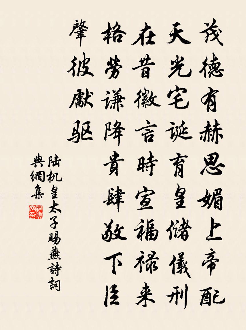 詩詞名句歷史字典書法欣賞書法字典國語詞典說文解字康熙字典古漢語字典標 題 作 者 詩 句 皇太子賜燕詩作者:陸機 朝代:魏晉皇太子賜燕詩原文茂德有赫。思媚上帝。配天光宅。誕育皇儲。儀刑在昔。徽言時宣。福祿來格。勞謙降貴。肆敬下臣。肇彼先驅。詩詞問答問:皇太子賜燕詩的作者是誰?答:陸機問:皇太子賜燕詩寫於哪個朝代?答:魏晉問:皇太子賜燕詩是什麼體裁?答:四古陸機皇太子賜燕詩書法欣賞皇太子賜燕詩書法作品詩詞推薦春殘陸游〔宋代〕石鏡山前送落暉,春殘回首倍依依。時平壯士無功老,鄉遠征人有夢歸。苜蓿苗侵官道合,蕪菁花入麥畦稀。倦遊幽事陸游〔宋代〕老境俗緣減,閒居幽事多。去沙通斷澗,插援護新荷。棋罷看山臥,釣歸搖楫歌。餘年端有幾,風月且婆娑。灩澦堆范成大〔宋代〕灩澦之石誰劖鐫?惡駭天下形眇然。客行五月潦始漲,但見匹馬浮黃湍。時時吐沫作濆淖,灂灂有聲如粥煎。蜀江訪楊才叔不遇留偈齋舍釋正覺〔宋代〕呼筇起寂下雲居,寒麓回春尋友於。煙染草芒三徑暗,雪晞麥腳一鉏濡。欲求真語滌塵想,那畏峭風生粟膚。不見和叔夏田舍三絕胡寅〔宋代〕作堨辛勤雨更遲,桔槔誰語漢陰知。不嫌機事侵純白,一日何妨灌百畦。武陵路司空圖〔唐代〕橘岸舟間罾網掛,茶坡日暖鷓鴣啼。女郎指點行人笑,知向花間路已迷。子上持豫章畫扇,其上牡丹三株,黃白相間盛楊萬里〔宋代〕暄風暖景政春遲,開盡好花人未知。輪與狸奴得春色,牡丹香里弄雙兒。恩制賜食於麗正殿書院宴賦得林字張說〔唐代〕東壁圖書府,西園翰墨林。誦詩聞國政,講易見天心。位竊和羹重,恩叨醉酒深。緩歌春興曲,情竭為知音。題王右丞山水障二首張祜〔唐代〕精華在筆端,咫尺匠心難。日月中堂見,江湖滿座看。夜凝嵐氣濕,秋浸壁光寒。料得昔人意,平生詩思殘。右丞感皇恩(彥逢弟生日)王之道〔宋代〕宿霧霽晨霜,江山明秀。照眼黃花亂晴晝。當年今日,正是懸弧時候。一杯聊獻祝,同親舊。莫問窮通,休論貧富貞婦詞楊維楨〔元代〕皎日常持信,倉皇不改貞。君王符不到,水長漸台傾。南鄉子·關鎖自周天蕭廷之〔宋代〕關鎖自周天。升降循環三寸田。不在噓呵並數息,天然。九轉無虧火力全。胎息漫流傳。要在陰陽不可偏。呼吸吹送人至邊寨穆修〔宋代〕豈憚河湟遠,男兒效主恩。窮邊人不到,孤戌自分屯。馬放胡沙暖,烽傳塞日昏。軍前初謁帥,戎服走轅門。淮上遇洛陽李主簿韋應物〔唐代〕結茅臨古渡,臥見長淮流。窗里人將老,門前樹已秋。寒山獨過雁,暮雨遠來舟。日夕逢歸客,那能忘舊遊。題汪水雲詩卷蕭灼〔宋代〕朔風卷雨東南昏,銅仙淚灑辭吳門。間關萬里踏燕月,埃沙撲面愁人魂。攜琴早晚隨王母,不似瑤池舊歌舞。南冠和張祜韻傅宏〔宋代〕遠望陽城湖, * 雲夢吞。白雲宿殿罅,青蘚埋松根。樵唱林間路,漁歌寺外村。避喧嗜飛閣,未若叩禪門。送劉進士游邊祖無擇〔宋代〕朔風動地雪花明,去去從知指戍城。場藿未縻千里驥,食魚翻嗜五侯鯖。征途望斷河冰合,旅館吟殘海月生。且共竺澗梅葛天民〔宋代〕龍脊橋邊鶴膝幽,一枝斜亞水橫流。自從識破胡笳曲,吹徹黃昏不解愁。西江月(春晚)辛棄疾〔宋代〕勝欲讀書已懶,只因多病長閒。聽風聽雨小窗眠。過了春光太半。往事如尋去鳥,清愁難解連環。流鶯不肯入西園擬古董嗣杲〔宋代〕河漢金氣老,海月光陸離。蟠蟀鳴我床,聲聲有餘悲。美人天之涯,言旋杳無期。西風吹脫葉,撫時傷所思。名句推薦綠葉青跗映丹萼,與君裴回上金閣。王勃《落花落》 守節自誓,親誨之學。歐陽修《畫地學書》 民力盡於無用,財寶虛於待客。墨子《墨子·05章 七患》 況屬高風晚,山山黃葉飛。王勃《山中》 接天蓮葉無窮碧,映日荷花別樣紅。楊萬里《曉出淨慈寺送林子方》 不充詘於富貴,不遑遑於所欲。姚察、姚思廉《梁書·列傳·卷五十》 寒燈思舊事,斷雁警愁眠。杜牧《旅宿》 封侯非我意,但願海波平。戚繼光《韜鈐深處》 三春白雪歸青冢,萬里黃河繞黑山。柳中庸《征人怨 / 征怨》 已是懸崖百丈冰,猶有花枝俏。 * 《卜運算元·詠梅》