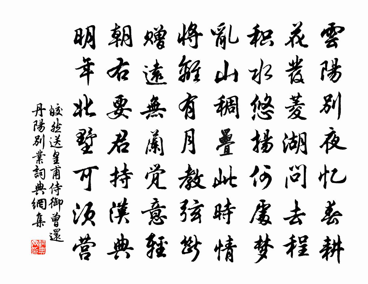 詩詞名句歷史字典書法欣賞書法字典國語詞典說文解字康熙字典古漢語字典標 題 作 者 詩 句 送皇甫侍御曾還丹陽別業作者:皎然 朝代:唐代送皇甫侍御曾還丹陽別業原文雲陽別夜憶春耕,花發菱湖問去程。積水悠揚何處夢,亂山稠疊此時情。將離有月教弦斷,贈遠無蘭覺意輕。朝右要君持漢典,明年北墅可須營。詩詞問答問:送皇甫侍御曾還丹陽別業的作者是誰?答:皎然問:送皇甫侍御曾還丹陽別業寫於哪個朝代?答:唐代問:送皇甫侍御曾還丹陽別業是什麼體裁?答:七律皎然送皇甫侍御曾還丹陽別業書法欣賞送皇甫侍御曾還丹陽別業書法作品注釋全唐詩:卷818-36詩詞推薦清心鏡 因何先生往寧海,作詞以寄鄉人馬鈺〔元代〕勸鄉人,當省悟。浮利浮名,不堅不固。妻男是、走骨行屍,自身是臭腐。早因頭,投真趣。學取馬風,樂然歸去傷柘枝妓李群玉〔唐代〕曾見雙鸞舞鏡中,聯飛接影對春風。今來獨在花筵散,月滿秋天一半空。山行即事二首黃公度〔宋代〕落石奔沙岸,頹雲擁樹根。牛羊千古道,雞犬數家村。風遞鄰舂急,春歸農事繁。生涯隨處樂,翁嫗話柴門。題秋霜閣後山泉尤袤〔宋代〕誰把機關引石泉,穿崖一溜響濺濺。爭如廬阜香爐頂,坐看銀河落九天。五月十有八夜與審知同宿塔山次審知韻趙蕃〔宋代〕初期半山來,已止輒復上。山游更同君,兼取魚熊掌。向來觀極南,屢作此山想。那知有今日,談笑得縱賞。謝公和楊團練元韻馮時行〔宋代〕此生渾褦襶,秋鬢漸鬅鬙。跂德山徒仰,雄談壘更增。奇謀閒袖手,佳句老傳燈。起我棲遲意,寒鳩欲化鷹。賈客愁楊凌〔唐代〕山水路悠悠,逢灘即殢留。西江風未便,何日到荊州。碧雲洞蔣燮〔宋代〕漢室真人已駕鴻,空留洞府舊山中。暮雲凝合元非鏁,俗骨腥膻自不通。束火杖藜深杳杳,袖椎敲石喜{降阝換音又寄介然吳則禮〔宋代〕寄聲吾黨阿介,米賤惟有譽同。更無一語不契,前身定是同參。春思張玉孃〔宋代〕玉勒雕鞍燕北春,閒愁空自惜芳塵。楊花入戶還飛去,應笑虛幃翠被新。賦黃香梅絕句八首正月二十三作時築樓居將就李壁〔宋代〕姑射仙人爾匹儕,若為塗額效宮娃。從來定價須平子,速剪繁枝送郡齋。哭郴州王使君李群玉〔唐代〕銀章朱紱照雲驄,六換魚書惠化崇。瑤樹忽傾滄海里,醉鄉翻在夜台中。東山妓逐飛花散,北海尊隨逝水空。曾是紀頌陳天麟〔宋代〕宅家圖任久虛懷,鎮撫三年輟弼諧。鵷鷺傾心望歸洛,貔貅賈勇待平淮。已擎天柱旋坤軸,會正杓衡拱泰階。多少冬日有懷李白杜甫〔唐代〕寂寞書齋里,終朝獨爾思。更尋嘉樹傳,不忘角弓詩。短褐風霜入,還丹日月遲。未因乘興去,空有鹿門期。十月三日相公花下小飲賦四題殘菊梅堯臣〔宋代〕零落黃金蕊,雖枯不改香。深叢隱孤秀,猶得奉清觴。柳梢青楊無咎〔宋代〕屋角牆隅。占寬閒處,種兩三株。月夕煙朝,影侵窗牖,香徹肌膚。群芳欲比何如。癯儒豈、膏梁共途。因事順心段秀才溪居送從弟游涇隴李洞〔唐代〕抱疾寒溪臥,因循草木青。相留開夏蜜,辭去見秋螢。朔雪痕侵雍,邊烽焰照涇。煙沈隴山色,西望涕交零。鳧李嶠〔唐代〕颯沓睢陽涘,浮游漢水隈。錢飛出井見,鶴引入琴哀。李陵賦詩罷,王喬曳舄來。何當歸太液,翱集動成雷。瑞鷓鴣姚述堯〔宋代〕半,桃杏皆飄零,惟此花獨芳,尤不可孤。因索再賦司花著意惜春光。桃杏飄零此獨芳。一抹霞紅勻醉臉,惱人情雪後尋梅偶得絕句十首陸游〔宋代〕雪裡芬芳亦偶然,世人便謂占春前。飽知桃李俗到骨,何至與渠爭著鞭。名句推薦千載休談南渡錯,當時自怕中原復。文徵明《滿江紅·拂拭殘碑》 行宮見月傷心色,夜雨聞鈴腸斷聲。白居易《長恨歌》 砌下落花風起,羅衣特地春寒。馮延巳《清平樂·雨晴煙晚》 堤上遊人逐畫船,拍堤春水四垂天。歐陽修《浣溪沙·堤上遊人逐畫船》 浮雲遮月不分明,誰挽長江一洗放天青?董士錫《虞美人·韶華爭肯偎人住》 銀箭金壺漏水多,起看秋月墜江波。李白《烏棲曲》 水繞陂田竹繞籬,榆錢落盡槿花稀。張舜民《村居·水繞陂田竹繞籬》 南陵水面漫悠悠,風緊雲輕欲變秋。杜牧《南陵道中 / 寄遠》 是以知天欲人相愛相利,而不欲人相惡相賊。墨子《墨子·04章 法儀》 牆角數枝梅,凌寒獨自開。王安石《梅花 / 梅》