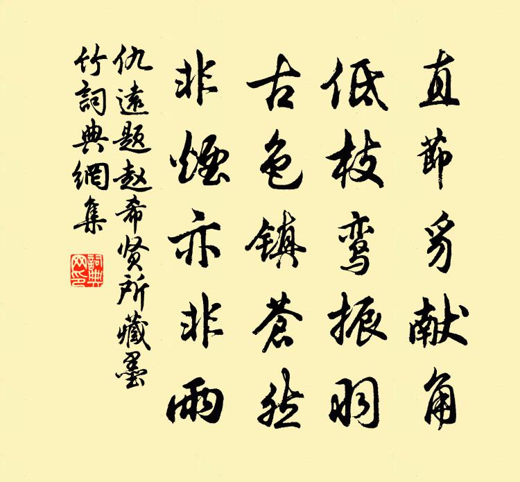詩詞名句歷史字典書法欣賞書法字典國語詞典說文解字康熙字典古漢語字典標 題 作 者 詩 句 題趙希賢所藏墨竹作者:仇遠 朝代:宋代題趙希賢所藏墨竹原文直節豸獻角,低枝鸞振羽。古色鎮蒼然,非煙亦非雨。詩詞問答問:題趙希賢所藏墨竹的作者是誰?答:仇遠問:題趙希賢所藏墨竹寫於哪個朝代?答:宋代仇遠題趙希賢所藏墨竹書法欣賞題趙希賢所藏墨竹書法作品詩詞推薦養家苦馬鈺〔元代〕養家苦,戀塵緣。鋪謀活計望千年。奈凡軀,不久堅。修行好,結良緣。功成行滿不排年。做神仙,因志堅。折山道中六言寄涌翠道人朱槔〔宋代〕雲暖綱橫危磴,日沉舟泊平沙。欸乃一聲歸去,炊煙遙起蘆花。夜雨吳錫疇〔宋代〕漠漠春陰未肯晴,空階滴點到平明。應知不入笙歌耳,來作愁人枕畔聲。清平令破子/清平樂佚名〔宋代〕滿庭羅綺流粲。清朝畫樓開宴。似初發芙蓉正爛熳。金尊莫惜頻勸。近看柳腰似折。更看舞回流雪。是歡樂、宴遊周宗廟歌 皇夏庾信〔南北朝〕若水逢降君。窮桑屬惟政。不哉馭帝籙。郁矣當天命。方定五雲官。先齊八風令。文昌氣似珠。太史河如鏡。南宮古豪俠行贈魏鄰幾黃庭堅〔宋代〕翩翩魏公子,恐是信陵君。高義動衰俗,孤標對層雲。風吹棠棣花,一枝落夷門。俯仰少顏色,蕭蕭煙景昏。已朽庾嶺舊傳有梅往往詩人藉此為江南春信予到此張九成〔宋代〕詩人常說嶺頭梅,往往春風自此來。我到嶺頭都不見,空將春夢又空回。齊民歌先秦無名〔先秦〕公胡不復遺其冠乎。送黃介夫李覯〔宋代〕短亭車馬地,送子一盤恆。不畏離群久,所嗟行路難。曬衣雲日薄,撲面水風酸。聖有中庸訓,時時著意看。岩下觀瀑旦晚異狀子文有詩輒次其韻何麒〔宋代〕瀑色清明氣猶雄,非煙非雲非白虹。兜羅綿光秀罘罳,瑠璃□影搖簾櫳。風吹銀潢漬蒼壁,日照玉柱驚青空。誰言行部有日喜雨楊萬里〔宋代〕一雨天良苦,連霄釀不成。強摩昏睡眼,來看滴階聲。環細開來大,珠跳滅又生。稻花知我出,噴雪待相迎。行次下渚湖二首張鎡〔宋代〕野童綠草牧鵝群,詩料今朝得幾分。俯仰縱橫皆合律,雲如層樹樹如雲。石城懷古劉洞〔唐代〕石城古岸頭,一望思悠悠。幾許六朝事,不禁江水流。答陳進士謂之憶江東舊遊見贈司馬光〔宋代〕客路今東去,亭皋木葉飛。居然不堪恨,況與賞心違。顧渚煙波闊,長洲草樹微。江邊好春色,行望錦標歸。題玄同先生草堂三首羅隱〔唐代〕杳杳諸天路,蒼蒼大滌山。景輿留不得,毛節去應閒。相府舊知己,教門新啟關。太平匡濟術,流落在人間。先生句余湜〔宋代〕西母已回金殿冷,綠珠一墜玉樓空。呈趙常德四首趙蕃〔宋代〕豐年易為政,凶年易為德。政本拙催科,德乃足民食。蠻貊忠信行,田裡愁嘆息。德政只如斯,何用求赫赫。晨起出門姜特立〔宋代〕水繞芳堤雲繞山,數椽茅屋住中間。神仙更自足官府,世上誰如此老閒。雪中會孫洙舍人飲王氏西堂戲成三絕蘇轍〔宋代〕傾盡香醪雪亦晴,東齋醉臥已三更。佳人不慣生疏客,不盡清歌宛轉聲。李都尉古劍白居易〔唐代〕古劍寒黯黯,鑄來幾千秋。白光納日月,紫氣排鬥牛。有客借一觀,愛之不敢求。湛然玉匣中,秋水澄不流。至寶名句推薦義膽包天,忠肝蓋地,四海無人識。施耐庵《念奴嬌·天南地北》 鞭撲之子,不從父之教劉向《說苑·雜言》 愁無限,消瘦盡,有誰知?閒教玉籠鸚鵡念郎詩。納蘭性德《相見歡·落花如夢淒迷》 總把春山掃眉黛,不知供得幾多愁?李商隱《代贈二首》 金風飄菊蕊,玉露泫萸枝。韋安石《奉和九日幸臨渭亭登高應制得枝字》 明月黃河夜,寒沙似戰場。李流芳《黃河夜泊》 春朝秋夜思君甚,愁見繡屏孤枕。魏承班《滿宮花·雪霏霏》 夫因兵死守蓬茅,麻薴衣衫鬢髮焦。杜荀鶴《山中寡婦 / 時世行》 人犯一苟字,便不能振;人犯一俗字,便不可醫。王永彬《圍爐夜話·第一二九則》 宿醉離愁慢髻鬟,六銖衣薄惹輕寒,慵紅悶翠掩青鸞韓偓《浣溪沙·宿醉離愁慢髻鬟》