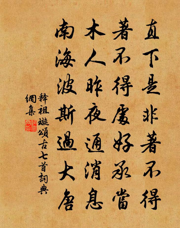 詩詞名句歷史字典書法欣賞書法字典國語詞典說文解字康熙字典古漢語字典標 題 作 者 詩 句 頌古七首作者:釋祖璇 朝代:宋代頌古七首原文直下是非著不得,著不得處好承當。木人昨夜通訊息,南海波斯過大唐。詩詞問答問:頌古七首的作者是誰?答:釋祖璇問:頌古七首寫於哪個朝代?答:宋代釋祖璇頌古七首書法欣賞頌古七首書法作品詩詞推薦奉陪黃帥機訪問元夕戰場歸途見人家園池花木曹彥約〔宋代〕並轡遊人任往來,透牆春色已安排。花時卻記梅前事,秀水如何不永懷。晚春詣蘇州敬贈武員外王灣〔唐代〕蘇台憶季常,飛棹歷江鄉。持此功曹掾,初離華省郎。貴門生禮樂,明代秉文章。嘉郡位先進,鴻儒名重揚。爰從和梅邊汪提乾釋道璨〔宋代〕我夢稽山陰,茂林映修竹。鑑湖八百里,眼乍不盈掬。管領天下清,此樂梅邊獨。幾欲驅車去,雲根夜同宿。山空雨張嵲〔宋代〕冥冥雲出溪,浩浩風薄木。濕煙驅不散,映岫森雨足。場功既雲畢,麥隴望已綠。矧予無一事,屏處謝追逐。霜空黎盤雲謝紫壺〔宋代〕黎盤雲,與白玉蟾有聯句。事見《海瓊玉蟾先生文集》卷六。施翔父掌教長沙葉適〔宋代〕著蔡羲前識,蕭韶舜後音。追回賈誼貶,喚起屈原沉。湘水汀煙闊,梅花署雪深。余行陳跡久,因子一微吟。病中聞子由得告不赴商州三首蘇軾〔宋代〕辭官不出意誰知,敢向清時怨位卑。萬事悠悠付杯酒,流年冉冉入霜髭。策曾忤世人嫌汝,易可忘憂家有師。此外臨皋閒題蘇軾〔宋代〕臨皋亭下八十數步,便是大江,其半是峨眉雪水,吾飲食沐浴皆取焉,何必歸鄉哉!江山風月,本無常主,閒者便擬詠懷詩 二三庾信〔南北朝〕鬬麟能食日。戰水定驚龍。鼓鞞喧七萃。風塵亂九重。鼎湖去無返。蒼梧悲不從。徒勞銅雀妓。遙望西陵松。立秋夕涼風忽至炎暑稍消即事詠懷寄汴州…尚書白居易〔唐代〕裊裊檐樹動,好風西南來。紅缸霏微滅,碧幌飄颻開。披襟有餘涼,拂簟無纖埃。但喜煩暑退,不惜光陰催。河秋三月二十日張君輗約飲王子由紫霞道院酒字為方回〔宋代〕城中殘春未識春,城外心賞無不有。今年春寒晚乃暖,尚余飛絮忘高柳。西湖孰謂西子老,雖老絕勝登徒醜。刺水郊廟歌辭。五郊樂章。肅和魏徵〔唐代〕金行在節,素靈居正。氣肅霜嚴,林凋草勁。豺祭隼擊,潦收川鏡。九穀已登,萬箱流詠。送黃竹磵劉宰〔宋代〕湘流不盡恨,楚客賦離騷。世已殊於古,君奚罕所遭。羈懷便酒聖,野興挾詩豪。醉里抬詩眼,山空月色高。杭州一百五日水心亭留題張詠〔宋代〕湖邊三月百花紅,湖上遊人處處通。莫怪此渠來便去,都緣心地似虛空。和姜元哲中秋有感韻柴元彪〔宋代〕烏飛兔走兩悠悠,世事驚心易白頭。月影空餘圓缺恨,人心不盡古今愁。江流東去波濤險,王氣南收草樹秋。回首夜賦陳與義〔宋代〕抱病喜清夜,形羸心獨開。不知藥鼎沸,錯認雨聲來。歲晚燈燭麗,天長鴻雁哀。書生惜日月,欹枕意茫哉。別天台趙企〔宋代〕攜家隱青山,青山不我留。遣我出山去,再拜辭丹丘。王命急星火,駕言促西遊。朝游白雲城,暮宿黃花洲。佳人山居三首(一作鄭遨詩)杜光庭〔唐代〕悶見有人尋,移庵更入深。落花流澗水,明月照松林。醉勸頭陀酒,閒教孺子吟。身同雲外鶴,斷得世塵侵。冥心醉落魄/一斛珠蔡伸〔宋代〕霜華搖落。亭亭皓月侵朱箔。夢回敧枕聽殘角。一片寒聲,風送入寥廓。眼前風月都如昨。獨眠無奈情懷惡。憑肩送張殿丞吉甫知資陽梅堯臣〔宋代〕單騎欲之蜀,彩衣初過秦。王喬鳧是舄,陶令酒名巾。灞上愁逢雪,褎中喜見春。兩川風物美,不似走京塵。名句推薦男兒何不帶吳鉤,收取關山五十州。李賀《南園十三首·其五》 軍合力不齊,躊躇而雁行。曹操《蒿里行》 回日樓台非甲帳,去時冠劍是丁年溫庭筠《蘇武廟》 秋風萬里動,日暮黃雲高。岑參《鞏北秋興寄崔明允》 東風有恨致玄都,吹破枝頭玉,夜月梨花也相妒。周文質《小桃紅·詠桃》 庭樹不知人去盡,春來還發舊時花。岑參《山房春事二首》 霧柳暗時雲度月,露荷翻處水流螢。張元乾《浣溪沙·山繞平湖波撼城》 戰陣之間,不厭詐偽。韓非及後人《韓非子·難一》 教人無處寄相思,落花芳草過前期,沒人知。孫光憲《虞美人·好風微揭簾旌起》 芳樹無人花自落,春山一路鳥空啼。李華《春行即興》