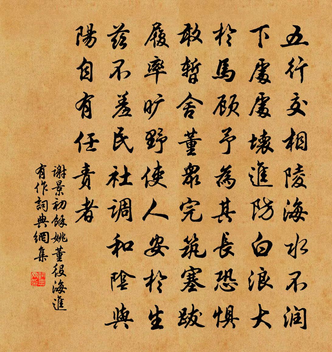 詩詞名句歷史字典書法欣賞書法字典國語詞典說文解字康熙字典古漢語字典標 題 作 者 詩 句 餘姚董役海進有作作者:謝景初 朝代:宋代餘姚董役海進有作原文五行交相陵,海水不潤下。處處壞進防,白浪大於馬。顧予為其長,恐懼敢暫舍。董眾完築塞,跋履率曠野。使人安於生,茲不羞民社。調和陰與陽,自有任責者。詩詞問答問:餘姚董役海進有作的作者是誰?答:謝景初問:餘姚董役海進有作寫於哪個朝代?答:宋代謝景初餘姚董役海進有作書法欣賞餘姚董役海進有作書法作品詩詞推薦五月九日甲子至月望庚午大雨水不已十首方回〔宋代〕夜半觀天象,無星定肯晴。河流兼市沒,船勢與樓平。未殺漂搖意,仍添颯灑聲。人膏飫魚鱉,真宰忍忘情。寧宗朝享三十五首真宗〔宋代〕[應鐘為羽]文以謨吉,武以烈承。聖訓人保,祖國統一武之繩。有肅孝假,式嚴稈孫。神其來兮,以宜以寧。將之湖州戲贈莘老蘇軾〔宋代〕餘杭自是山水窟,仄聞吳興更清絕。湖中桔林新著霜,溪上苕花正浮雪。顧渚茶牙白於齒,梅溪木瓜紅勝頰。吳兒早春滻水送友人溫庭筠〔唐代〕青門煙野外,渡滻送行人。鴨臥溪沙暖,鳩鳴社樹春。殘波青有石,幽草綠無塵。楊柳東風裡,相看淚滿巾。二(一作寒食遣懷)趙嘏〔唐代〕折柳城邊起暮愁,可憐春色獨懷憂。傷心正嘆人間事,回首更慚江上鷗。鶗鴂聲中寒食雨,芙蓉花外夕陽樓。憑高詩阮瑀〔魏晉〕臨川多悲風。秋日苦清涼。客子易為戚。感此用哀傷。攬衣起躑躅。上觀心與房。三星守故次。明月未收光。雞鳴坐池上看水偶成五絕句宋庠〔宋代〕冰解初分竇,波平便泛舟。岸花紅弔影,沙鴨綠昂頭。擬寒山拾得二十首王安石〔宋代〕我曾為牛馬,見草豆歡喜。又曾為女人,歡喜見男子。我若真是我,祗合長如此。若好惡不定,應知為物使。堂堂假日書事呈院中司徒姚合〔唐代〕十日公府靜,巾櫛起清晨。寒蟬近衰柳,古木似高人。學佛寧憂老,為儒自喜貧。海山歸未得,芝朮夢中春。點絳唇(仙呂)周邦彥〔宋代〕征騎初停,酒行莫放離歌舉。柳汀蓮浦。看盡江南路。苦恨斜陽,冉冉催人去。空回顧。淡煙橫素。不見揚鞭處。浪淘沙(次韻史東美洛中作)趙鼎〔宋代〕歸計信悠悠。歸去誰留。夢隨江水繞沙洲。沙上孤鴻猶笑我,萍梗飄流。與世且沈浮。要便歸休。一杯消盡一生愁依韻和王介甫兄弟舟次蕪江懷寄吳正仲梅堯臣〔宋代〕楚客連檣泊晚風,吳人江畔醉無窮。少陵失意詩偏老,子厚因遷筆更雄。貫口信潮千里至,平沙落日一時紅。知君歲晚感事宋庠〔宋代〕積水千陂會,孤城一角存。鳥烏喧畫霽,蛇虺喜冬溫。地敻荒民屋,天高思國門。楚優歌舞拙,何處強持樽。春夜二首劉子翬〔宋代〕葉葉風鳴幕,梢梢雨打窗。煙銷寒寶鴨,膏淺側銀缸。次韻練定祥符聽法晁補之〔宋代〕彌天一滴水,何處是曹溪。若作聲來解,還成瞪發迷。白雲遮剎遠,翠竹向檐低。是物元非物,莊周未可齊。題友人養素軒胡宏〔宋代〕少時情意在滄洲,壯歲還知學孔丘。萬事只嫌心有病,百年不作夢中游。紫泥詔下人須在,黃卷人開我自收。恥向送崔遏孟浩然〔唐代〕片玉來夸楚,治中作主人。江山增潤色,詞賦動陽春。別館當虛敞,離情任吐伸。因聲兩京舊,誰念臥漳濱?都作院楊冠卿〔宋代〕天子除戎戒不虞,修車備器會東都。羽林憶昨厭弓矢,剡木弦弧兒戲爾。我公號令何精明,武庫森嚴耀五丘。威震緩歌行謝靈運〔南北朝〕飛客結靈友。凌空萃丹丘。習習和風起。采采彤雲浮。娥皇發湘浦。霄明出河洲。宛宛連螭轡。裔裔振龍旒。秋思陸游〔宋代〕黃落梧桐覆井床,莎根日夜泣寒螿。老生窺鏡鬢成雪,俊鶻掣韝天欲霜。破虜誰持白羽扇?從軍曾擁綠沈槍。壯心名句推薦沽酒清陰時系馬,招涼短檻幾留題。許德溥《西橋柳色》 故國梅花歸夢,愁損綠羅裙。孔夷《南浦·旅懷》 佇聽寒聲,雲深無雁影。周邦彥《關河令·秋陰時晴漸向暝》 知者行之始。行者知之成。王陽明《傳習錄·卷上·門人陸澄錄》 忽聞歌古調,歸思欲沾巾。杜審言《和晉陵陸丞早春遊望》 忽然更作漁陽摻,黃雲蕭條白日暗。李頎《聽安萬善吹觱篥歌》 蘭陵美酒鬱金香,玉碗盛來琥珀光。李白《客中行 / 客中作》 蓮朝開而暮合,至不能合,則將落矣王永彬《圍爐夜話·第六九則》 止凡人之斗鬩,則堯舜之道,不如寡妻之誨諭。顏之推《顏氏家訓·序致篇》 昨夜秋風入漢關,朔雲邊月滿西山。嚴武《軍城早秋》