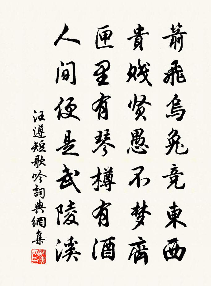 詩詞名句歷史字典書法欣賞書法字典國語詞典說文解字康熙字典古漢語字典標 題 作 者 詩 句 短歌吟作者:汪遵 朝代:唐代短歌吟原文箭飛烏兔競東西,貴賤賢愚不夢齊。匣里有琴樽有酒,人間便是武陵溪。詩詞問答問:短歌吟的作者是誰?答:汪遵問:短歌吟寫於哪個朝代?答:唐代問:短歌吟是什麼體裁?答:樂府汪遵短歌吟書法欣賞短歌吟書法作品注釋全唐詩:卷602-20詩詞推薦夜與仲嚴叔倚季成三弟同坐聞笛各賦一絕潘良貴〔宋代〕西北干戈撥不開,今宵聞笛更清哀。高堂親老發垂白,與子買舟歸去來。賀聖朝佚名〔宋代〕太平宮無事,四宮邊寧靜狼宮煙眇。國泰民安,謾說堯舜禹湯好。萬民翹望彩都門,龍燈鳳燭相照。只聽得教坊雜頌古一百二十一首釋宗杲〔宋代〕青州七斤衫,盡力提不起。打破趙州關,總是自家底。宴清都·連理海棠吳文英〔宋代〕繡幄鴛鴦柱。紅情密,膩雲低護秦樹。芳根兼倚,花梢鈿合,錦屏人妒。東風睡 * 枝,正夢枕、瑤釵燕股。障灩送鄭書記錢起〔唐代〕決勝無遺策,辭天便請纓。出身唯殉死,報國且能兵。受命麒麟殿,參謀驃騎營。短簫催別酒,斜日駐前旌。義勇次韻杜安行嘉陵春日書事十首郭印〔宋代〕誰念疲民瘠,空令戰士肥。羽書傳警急,花院鎖芳菲。冠屨將身誤,山林與願違。兩途俱不遂,衰鬢綠毛稀。回程泗州道中虞儔〔宋代〕淮北燕南昔混同,相望卻恨馬牛風。往來未省誰為伴,言語從來自不通。百歲遺民悉緒外,數聲羌笛夢魂中。徑須別離情所鍾十二章章四句送定叟弟之官嚴陵張栻〔宋代〕自昔謹交際,人情易因循。敬始以念終,君子貴守身。清話堂詩李覯〔宋代〕釋子相延暫解冠,一宵清話到更蘭。漆盤香燼死蚯蚓,紙瓦雨聲鳴彈丸。往事莫將閒口笑,勞生誰在定中看。明朝得周畏知書病久不報以詩寄之趙蕃〔宋代〕莫道寒溫只素書,也於朋友見親疏。自從一反南昌役,無復能安古寺居。憔悴直為人所棄,殷勤獨肯問何如。缺然浣溪沙毛滂〔宋代〕本是青門學灌園。生涯渾在亂山前。一犁春雨種瓜田。別後倩雲遮鶴帳,來時和月寄漁船。旁人莫做長官看。謁金門盧祖皋〔宋代〕間院宇。獨自行來行去。花片無聲簾外雨。峭寒生碧樹。做弄清明時序。料理春酲情緒。憶得歸時停棹處。畫橋看送惠思上人王安石〔宋代〕黃鶴撫四海,翻然落中州。一聽笙與鏞,低回如有求。飛鳴阿閣上,好與鳳皇游。顧憐魯東門,無事反悲愁。歲晏臨終作王隨〔宋代〕畫堂燈已滅,彈指向誰說。去住本尋常,春風掃殘雪。五月中連夕風雨氣候如高秋枕上有賦陸游〔宋代〕擁被微吟短鬢秋,孤燈殘漏共悠悠。雨聲不貣三更夢,酒力寧禁萬里愁?身寄湖山鄰剡曲,心遊河岳過關頭。世間處州月夜穆中丞席和主人劉言史〔唐代〕羌竹繁弦銀燭紅,月光初出柳城東。忽見隱侯裁一詠,還須書向郡樓中。修真院訪崔道士真山民〔宋代〕竹扉蒼蘚牆,林下小丹房。風定香菸直,月斜簾影長。瀹茶泉味別,點易露痕香。安得棲塵外,求師卻老方。奉招吉甫王安石〔宋代〕經綸無地委蓬蒿,凜凜胸懷且自韜。誰奮長謀平嶺海,猶將餘力寄風騷。名慚隨俗分中役,恨未收身恨外高。永夜鵲橋仙 寄汪南軒謝應芳〔元代〕青年去了。青衫破了。舊日青氈無了。一時清興未能除,說與故人知道。春花春好。秋花秋好。每日看花尤好。人皇太后閣六首蘇軾〔宋代〕上林珍木暗池台,蜀產吳包萬里來。不獨盤中見盧橘,時於粽里得楊梅。名句推薦紗窗日落漸黃昏,金屋無人見淚痕。劉方平《春怨》 疾雷不及塞耳,疾霆不暇掩目。劉安及其門客《淮南子·兵略訓》 平明日出東南地,滿磧寒光生鐵衣。李益《度破訥沙二首·其二 / 塞北行次度破訥沙》 苔深不能掃,落葉秋風早。李白《長干行二首》 命將征西極,橫行陰山側。李白《塞上曲》 煙霏霏。雪霏霏。雪向梅花枝上堆。吳淑姬《長相思令·煙霏霏》 江深竹靜兩三家,多事紅花映白花。杜甫《江畔獨步尋花七絕句》 情人怨遙夜,竟夕起相思。張九齡《望月懷遠》 山中何所有,嶺上多白雲。陶弘景《詔問山中何所有賦詩以答》 秋菊有佳色,裛露掇其英。陶淵明《飲酒·其四》
