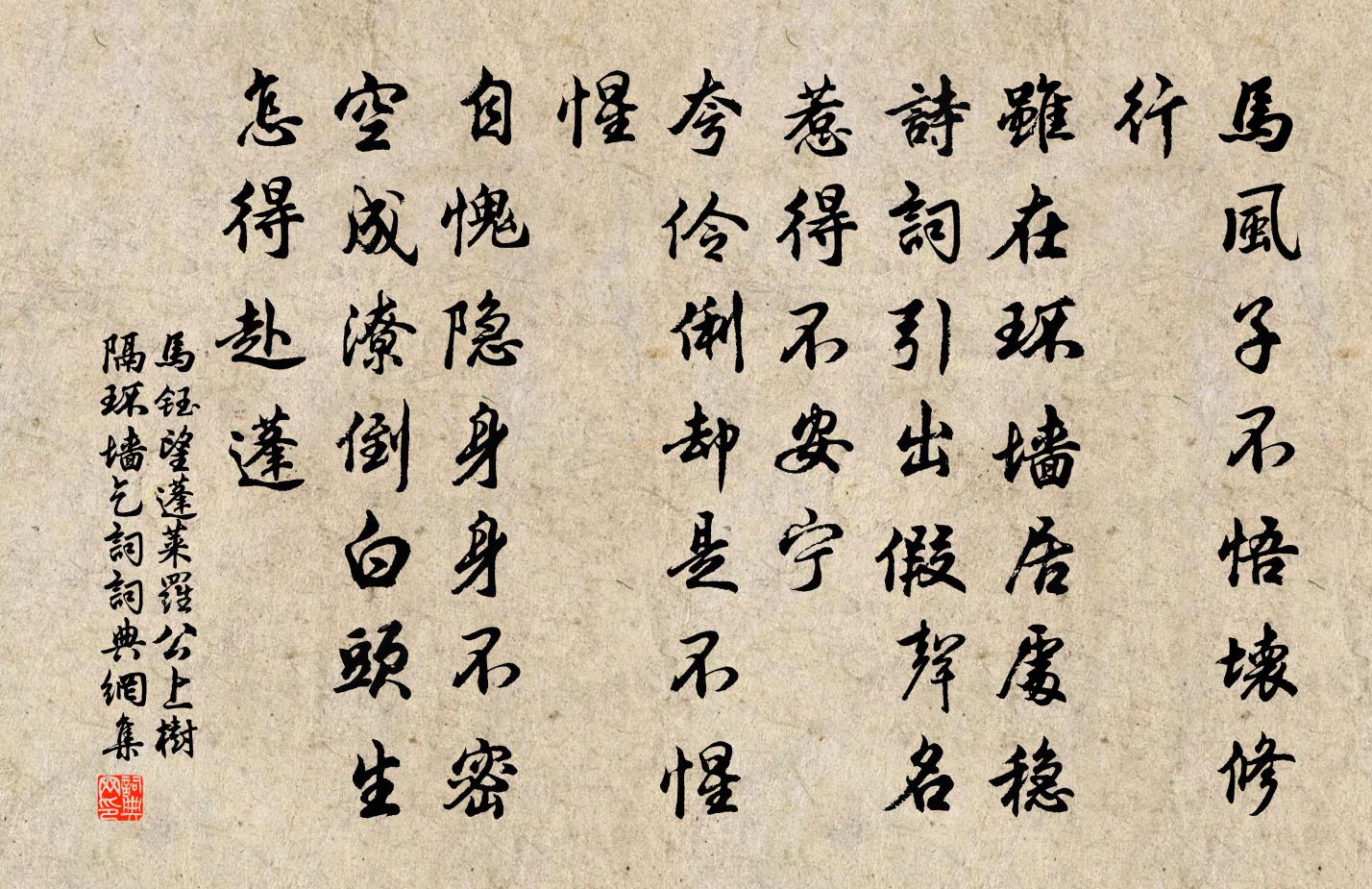 詩詞名句歷史字典書法欣賞書法字典國語詞典說文解字康熙字典古漢語字典標 題 作 者 詩 句 望蓬萊 羅公上樹隔環牆乞詞作者:馬鈺 朝代:元代原文馬風子,不悟壞修行。雖在環牆居處穩,詩詞引出假聲名。惹得不安寧。夸伶俐,卻是不惺惺。自愧隱身身不密,空成潦倒白頭生。怎得赴蓬詩詞問答問:《望蓬萊 羅公上樹隔環牆乞詞》的作者是誰?答:馬鈺問:該詩寫於哪個朝代?答:元代問:該詩是什麼體裁?答:詞書法欣賞望蓬萊 羅公上樹隔環牆乞詞書法作品詩詞推薦古意劉商〔唐代〕達曉寢衣冷,開帷霜露凝。風吹昨夜淚,一片枕前冰。已亥雜詩 93龔自珍〔清代〕金鑾並硯走龍蛇,無分同探閬苑花。十一年來春夢冷,南遊且吃玉川茶。和秦奉之題蘄春驛浸月軒王之道〔宋代〕千山初過雨,萬籟不鳴風。寶鑑沉寒水,冰輪上太空。竹梢低蘸碧,楓葉冷浮紅。終欲金沙去,經營一畝宮。今日何夕曾豐〔宋代〕今夕何夕,袢暑其蒸。於後之旦,維槿始榮。有綽其聲,我後中興。我公協成,有功有能。我後顯旌,不伐不矜。浣溪沙 方城仙翁山北水莊成,而良佐以事系元好問〔金代〕百折清泉繞舍鳴。隔年楊柳綠陰成。藕花多處一舟輕。行處自由皆樂事,得來無用是虛名。等閒榮辱不須驚。奉酬路五郎中院長新除工部員外見簡李嘉祐〔唐代〕一門同秘省,萬里作長城。問絹蓮花府,揚旗細柳營。詞鋒偏卻敵,草奏直論兵。何幸新詩贈,真輸小謝名。立春晚會呈經父孔武仲〔宋代〕侍史新從天下歸,相逢忻喜著春衣。萱芽刺土占芳節,蘭醑傾觴亂夕暉。兄弟幾人華萼聚,歲時經眼羽翰飛。東風宮詞宋白〔宋代〕月殿聞隨羽客過,桂宮門外近天河。常娥裝束還何似,潛問君王記得么。陸羽井司馬允中〔宋代〕百尺寒泉浸崖腹,蘚蝕題名不堪讀。只今此味屬誰論,自把銅瓶汲新淥。憶洛中所居白居易〔唐代〕忽憶東都宅,春來事宛然。雪銷行徑里,水上臥房前。厭綠栽黃竹,嫌紅種白蓮。醉教鶯送酒,閒遣鶴看船。幸是殊聖寺和孟我幕韻吳詠〔宋代〕院靜僧疑少,門幽客自稀。山寒雲近屋,徑狹石侵衣,松鬣蒼髯古,姜芽紫筍肥。騷人詩戰罷,踏月夜深歸。頌古八首釋雲〔宋代〕家人卦變作明夷,爻象分明不待推。無動無謀終吉慶,有求有用即迍危。上已日舍舟豐城曹彥約〔宋代〕路出豐奪縣,籃輿了夕陽。何人共列坐,勝事憶流觴。帝裡衣冠近,家山念慮長。殷勤樓下水。今夜到吾鄉。游九曲方岳〔宋代〕掀蓬仰看玉崢嶸,借得漁船一日晴。九曲水窮山雨急,老仙於我豈無情。和蘇養直題孫郎中扶疏堂二首曹勛〔宋代〕白項鴉兒趁曉啼,梢梢寒柳出疏籬。未飛臘雪連天白,且看江雲四面垂。送史同叔司直造朝孫應時〔宋代〕天壤王郎子,芝蘭謝傅家。班行想風采,詩禮倍光華。萬里鞭先著,連城玉未瑕。中朝呂范氏,端的有餘師。為圃張舜民〔宋代〕前人厭膏粱,志欲服賤事。若論區別功,為圃亦不易。次韻漢卿舅即事范成大〔宋代〕風卷南枝一夜休,孤芳寧肯為人留?淡妝素服真成夢,落月橫參各自愁。頌古一百則釋正覺〔宋代〕百草頭上無邊春,信手拈來用得親。丈六金身功德聚,等閒攜手入紅塵。塵中能作主,化外自來賓。觸處生涯隨分句馮去非〔宋代〕茶疏緣睡少。名句推薦鬧里掙錢,靜處安身。佚名《增廣賢文·上集》 江山如有待,花柳自無私。杜甫《後游》 相送情無限,沾襟比散絲韋應物《賦得暮雨送李胄/賦得暮雨送李曹》 旌旆夾兩山,黃河當中流。李白《經亂離後天恩流夜郎憶舊遊書懷贈江夏韋太守良宰》 為者敗之,執者失之。老子《老子·道經·第二十九章》 相逢喚醒京華夢,吳塵暗斑吟發。詹玉《齊天樂·送童瓮天兵後歸杭》 粗繒大布裹生涯,腹有詩書氣自華。蘇軾《和董傳留別》 燕子飛時,綠水人家繞。蘇軾《蝶戀花·春景》 嘆息聊自思,此生豈我情。王績《石竹詠》 何處是歸程?長亭連短亭。李白《菩薩蠻·平林漠漠煙如織》