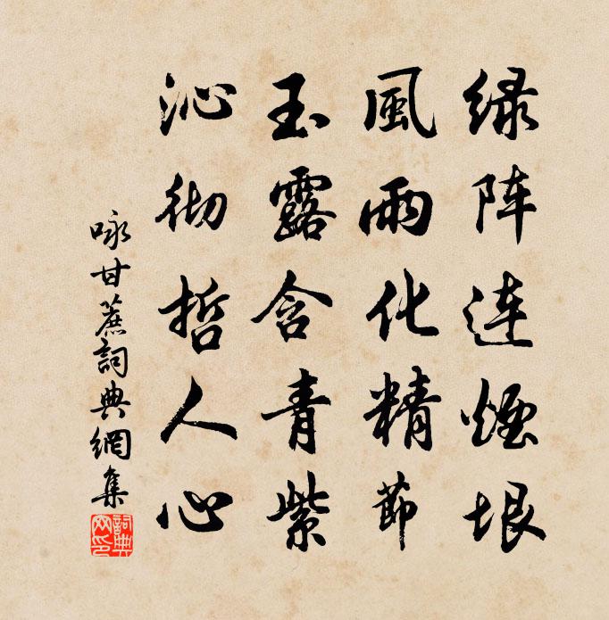 詩詞名句歷史字典書法欣賞書法字典國語詞典說文解字康熙字典古漢語字典標 題 作 者 詩 句 詠甘蔗作者:佚名 朝代:清代詠甘蔗原文綠陣連煙垠,風雨化精節。玉露含青紫,沁徹哲人心。詩詞問答問:詠甘蔗的作者是誰?答:佚名問:詠甘蔗寫於哪個朝代?答:清代問:佚名的名句有哪些?答:佚名名句大全佚名詠甘蔗書法欣賞詠甘蔗書法作品注釋綠陣:甘蔗林廣袤狀.。煙垠:雲霧邊際。青紫:蔗皮青綠與紫紅色澤,甘甜蔗漿蘊其中。哲人:人詩意地棲居於世為真哲。標籤:詠物詩詞推薦摸魚兒·觀潮上葉丞相辛棄疾〔宋代〕望飛來半空鷗鷺,須臾動地鼙鼓。截江組練驅山去,鏖戰未收貔虎。朝又暮。誚慣得、吳兒不怕蛟龍怒。風波平步夾竹桃花·詠題曹勛〔宋代〕絳彩嬌春,蒼筠靜鎖,掩映夭姿凝露。花腮藏翠,高節穿花遮護。重重蕊葉相憐,似青帔艷妝神仙侶。正武陵溪暗詠燕 / 歸燕詩張九齡〔唐代〕海燕雖微渺,乘春亦暫來。豈知泥滓賤,只見玉堂開。繡戶時雙入,華堂日幾回。無心與物競,鷹隼莫相猜。詠木槿樹題武進文明府廳劉庭琦〔唐代〕物情良可見,人事不勝悲。莫恃朝榮好,君看暮落時。杏花天·詠湯吳文英〔宋代〕蠻姜豆蔻相思味。算卻在、春風舌底。江清愛與消殘醉。悴憔文園病起。停嘶騎、歌眉送意。記曉色、東城夢裡。浪淘沙·楊花李雯〔清代〕金縷曉風殘,素雪晴翻,為誰飛上玉雕闌?可惜章台新雨後,踏入沙間。沾惹忒無端,青鳥空銜,一春幽夢綠萍間詠零陵歐陽修〔宋代〕畫圖曾識零陵郡,今日方知畫不如。城郭恰臨瀟水上,山川猶是柳侯余。驛亭幽絕堪垂釣,岩石虛明可讀書。欲買五歲詠花陳知玄〔唐代〕花開滿樹紅,花落萬枝空。唯餘一孕在,明日定隨風。撼庭秋·別來音信千里晏殊〔宋代〕別來音信千里。悵此情難寄。碧紗秋月,梧桐夜雨,幾回無寐。樓高目斷,天遙雲黯,只堪憔悴。念蘭堂紅燭,心山花子·林下荒苔道韞家納蘭性德〔清代〕林下荒苔道韞家,生憐玉骨委塵沙。愁向風前無處說,數歸鴉。半世浮萍隨逝水,一宵冷雨葬名花。魂是柳綿吹欲望江南 詠弦月納蘭性德〔清代〕初八月,半鏡上青霄。斜倚畫闌嬌不語,暗移梅影過紅橋,裙帶北風飄。無衣佚名〔先秦〕豈曰無衣七兮?不如子之衣,安且吉兮!豈曰無衣六兮?不如子之衣,安且燠兮!一萼紅 盆梅朱唏顏〔元代〕玉堂深。正重簾護暝,窗色試新晴。苔暖鱗生,泥融脈起,春意初破瓊英。夜深後、寒消絳蟻,誤碎月、和露落空汴京紀事二十首 其十六劉子翬〔宋代〕盤石曾聞受國封,承恩不與幸臣同。時危運作高城砲,猶解捐軀立戰功。蟾宮曲·詠西湖奧敦周卿〔元代〕西湖煙水茫茫,百頃風潭,十里荷香。宜雨宜晴,宜西施淡抹濃妝。尾尾相銜畫舫,盡歡聲無日不笙簧。春暖花香芙蕖李漁〔清代〕 芙蕖與草本諸花似覺稍異,然有根無花,一歲一生,其性同也。譜云:“產於水者曰草芙蓉,產於陸者曰旱蓮雙雙燕·小桃謝後吳文英〔宋代〕小桃謝後,雙雙燕,飛來幾家庭戶。輕煙曉暝,湘水暮雲遙度,簾外余寒未卷,共斜入、紅樓深處。相將占得雕梁喜遷鶯·暑風涼月辛棄疾〔宋代〕謝趙晉臣敷文賦芙蓉詞見壽,用韻為謝。暑風涼月。愛亭亭無數,綠衣持節。掩冉如羞,參差似妒,擁出芙蓉花發姑孰十詠。慈姥竹李白〔唐代〕野竹攢石生,含煙映江島。翠色落波深,虛聲帶寒早。龍吟曾未聽,鳳曲吹應好。不學蒲柳凋,貞心嘗自保。綿州巴歌佚名〔隋代〕豆子山,打瓦鼓。揚平山,撒白雨。下白雨,取龍女。織得絹,二丈五。一半屬羅江,一半屬玄武。名句推薦夜來南風起,小麥覆隴黃。白居易《觀刈麥》 兩人對酌山花開,一杯一杯復一杯。李白《山中與幽人對酌》 三年遇寒食,盡在洛陽城。白居易《洛橋寒食日作十韻》 情由憶生,不憶故無情。房玄齡《晉書·列傳·第六十四章》 不聞不若聞之,聞之不若見之,見之不若知之,知之不若行之。荀子《荀子·儒效》 不是一番寒徹骨,怎得梅花撲鼻香!馮夢龍《醒世恆言·卷十七》 惆悵南朝事,長江獨至今。劉長卿《秋日登吳公台上寺遠眺》 不愁屋漏床床濕,且喜溪流岸岸深曾幾《蘇秀道中》 寧為雞口,無為牛後。劉向《戰國策·韓一·蘇秦為楚合從說韓王》 四百年來成一夢,堪愁。王安石《南鄉子·自古帝王州》