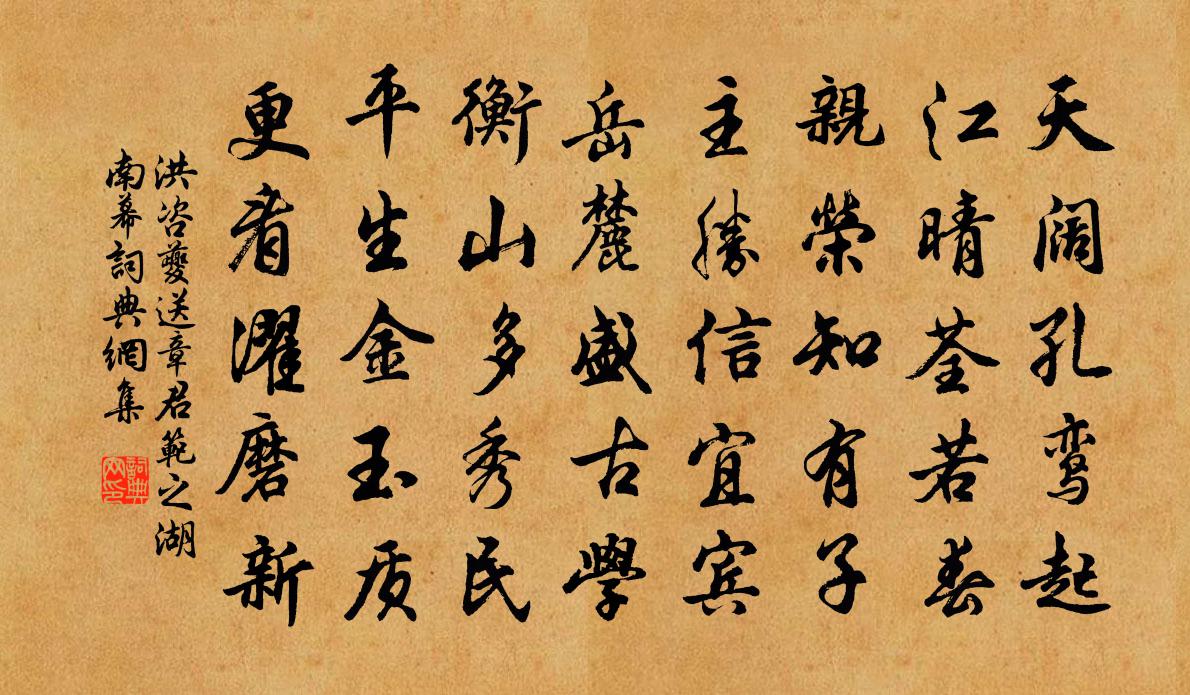 詩詞名句歷史字典書法欣賞書法字典國語詞典說文解字康熙字典古漢語字典標 題 作 者 詩 句 送章君范之湖南幕作者:洪咨夔 朝代:宋代送章君范之湖南幕原文天闊孔鸞起,江晴荃若春。親榮知有子,主勝信宜賓。嶽麓盛古學,衡山多秀民。平生金玉質,更看濯磨新。詩詞問答問:送章君范之湖南幕的作者是誰?答:洪咨夔問:送章君范之湖南幕寫於哪個朝代?答:宋代洪咨夔送章君范之湖南幕書法欣賞送章君范之湖南幕書法作品詩詞推薦二月十九日席上賦四首魏了翁〔宋代〕野荼醾發雪堆牆,草牡丹開月照梁。世眼都隨人毀譽,不知底處是真香。頌古三十八首釋從瑾〔宋代〕古帆未掛時,後園驢吃草。日短苦夜長,行人須及早。虞美人蘇軾〔宋代〕持杯遙勸天邊月。願月圓無缺。持杯復更勸花枝。且願花枝長在、莫離披。持杯月下花前醉。休問榮枯事。此歡能上元日紫極宮門觀州民然燈張樂羊士諤〔唐代〕山郭通衢隘,瑤壇紫府深。燈花助春意,舞綬織歡心。閒似淮陽臥,恭聞樂職吟。唯將聖明化,聊以達飛沉。周氏東山草堂翁卷〔宋代〕城隅古謝村,博士草堂存。唯見煙霞起,全無市井喧。鵲來巢木末,龜出戲蒲根。消得吟詩客,憑欄看幾番。頌古二首釋曇瑩〔宋代〕百結襴衫破幞頭,年年落第出神州。卻因一隻穿楊箭,臨老來封馬上侯。謝應之黃庭堅〔宋代〕昨夜風雷震海隅,天心急擬活焦枯。去年席上蛟龍語,未委先生記得無。海棠晏殊〔宋代〕輕盈千結亂櫻叢,占得年芳近碧櫳。逐處間勻高下萼,幾番分破淺深紅。煙晴始覺香纓綻,日極猶疑蠟蔕融。數夕行旅圖唐寅〔明代〕十年行李憶關山,紈褲何堪遣路艱。今日酒杯歌袖畔,竟忘門外到長安。對酒陸游〔宋代〕 * 色爽如秋,一榼燈前自獻酬。百萬愁魔降未得,故套用爾作戈矛。送嚴上舍並寄諸公十首寄張次夔縣丞陳造〔宋代〕自昔金陵幕,周旋未盡能。淒涼論閥閱,突兀擅聲稱。直己堪從事,公言不負丞。嗣當蜚鶚牘,留眼看依乘。泊舟兜率寺呈王承可黃彥平〔宋代〕龍用中宵壯,風揚廣岸波。不堪簉鴛鷺,合作傍黿鼉。寂寂靈妃瑟,滔滔孺子歌。微君澄練手,如我布帆何。三吳漫遊集唐方鳳〔宋代〕不堪惆悵滿離杯,水碧沙明兩岸苔。無限塞鴻飛不度,二陵風雨自東來。八十四盤范成大〔宋代〕冥鴻無伴鶴孤飛,回首塵籠一笑嬉。八十四盤新拄杖,萬三千乘舊牙旗。石梯碧滑雲生後,木葉紅斑雪霽時。說與題立上舍草意方回〔宋代〕萬派江河盡向東,秋風搖落又春風。性靈根本元相似,軀殼胚胎偶不同。螻蟻階前藏窟穴,蜘蛛檐 * 虛空。家中和晚菊三首廖行之〔宋代〕何事秋光老更清,故應有菊占秋榮。後來漢陛知薪積,晚出商山嘆翼成。三徑惟將松比操,東籬那為酒含英。紛紛挽縣尉陳元圭喻良能〔宋代〕平生自負氣雄豪,落筆文詞涌怒濤。蚤歲賢關幾雁塔,暮年花縣未牛刀。凜然風義誰能並,偉甚衣冠眾所高。我欲蟬葉茵〔宋代〕柳外聲殘日未殘,棲身未穩擇枝安。不須過有螳螂慮,黃雀從傍冷眼看。浯溪曹一龍〔宋代〕行樂乘陰好,誰能困墨朱。重陽激數客,盡日款三吾。煙慘江山古,風清竹木癯。漫郎如可作,分酒酹茱萸。居茅山作劉誼〔宋代〕曾跨江西使者鞍,直言才上便休官。三茅得夢全清瘦,頭髮鬅鬙布襖寬。名句推薦猶余雪霜態,未肯十分紅。王十朋《紅梅》 此時相望不相聞,願逐月華流照君。張若虛《春江花月夜》 桃今百餘尺,花落成枯枝。李白《獨不見》 善操理者不能有全功,善處身者不能無過失。薛居正《舊五代史·後周·世宗紀二》 善用兵者不以短擊長,而以長擊短。司馬遷《史記·淮陰侯列傳》 回看射鵰處,千里暮雲平。王維《觀獵》 相望試登高,心隨雁飛滅。孟浩然《秋登蘭山寄張五》 大難不死,必有後祿。馮夢龍《喻世明言·卷二十一》 待到秋來九月八,我花開後百花殺。黃巢《不第後賦菊》 渡頭餘落日,墟里上孤煙。王維《輞川閒居贈裴秀才迪》