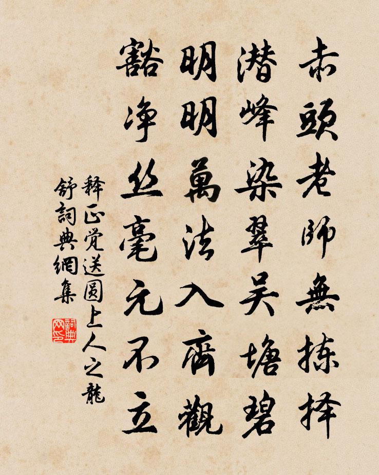 詩詞名句歷史字典書法欣賞書法字典國語詞典說文解字康熙字典古漢語字典標 題 作 者 詩 句 送圓上人之龍舒作者:釋正覺 朝代:宋代送圓上人之龍舒原文赤頭老師無揀擇,潛峰染翠吳塘碧。明明萬法入齊觀,豁淨絲毫元不立。詩詞問答問:送圓上人之龍舒的作者是誰?答:釋正覺問:送圓上人之龍舒寫於哪個朝代?答:宋代釋正覺送圓上人之龍舒書法欣賞送圓上人之龍舒書法作品詩詞推薦杏為梁-刺居處僭也白居易〔唐代〕右為梁,桂為柱,何人堂室李開府。碧砌紅軒色未乾,去年身歿今移主。高其牆,大其門,誰家第宅盧將軍。素泥過三十六洞鄭獬〔宋代〕草深樹密不見溪,但聞地底溪聲回。忽從山口渡流水,始知此溪山北來。孤寢怨崔珪〔唐代〕征戍動經年,含情拂玳筵。花飛織錦處,月落搗衣邊。燈暗愁孤坐,床空怨獨眠。自君遼海去,玉匣閉春弦。念奴嬌趙善括〔宋代〕於嵐光亭。思恭蔣丈寵和寄示,醉中操筆,對月再用前韻揚輝璧月,照層台縹緲,蓬萊雲氣。玉宇清明仙語近,多雪樓程御史次方山房韻見寄用韻答賦三首何夢桂〔宋代〕思君隔山陂,矢心誓白水。夔蚿各自憐,人生貴適意。馬頭黃金羈,不易牛背睡。白髮難再玄,百子空自許。南山菩薩蠻趙彥端〔宋代〕繡羅裙上雙鴛帶。年年長系春心在。梅子別時青。如今渾已成。美人書幅幅。中有連環玉。不是只催歸。要情無斷偈頌四十一首釋慧暉〔宋代〕皋月今朝初旭光,玉輝破暗露堂堂。日日分明久遠事,威音那畔是時祥。歸田賦張衡〔兩漢〕游都邑以永久,無明略以佐時。徒臨川以羨魚,俟河清乎未期。感蔡子之慷慨,從唐生以決疑。諒天道之微昧,追叢祠樹木尤岑蔚宋祁〔宋代〕祠憑怪神樹不伐,樹得岑陰神托威。鄉人奠酒女巫醉,祠樹不知誰是非。甘露歌王安石〔宋代〕折得一枝香在手。人間應未有。疑是經春雪未消。今日是何朝。高陽台李萊老〔宋代〕門掩香殘,屏搖夢冷,珠細糝綴芳塵。臨水搴花,流來疑是行雲。蘚梢空掛淒涼月,想鶴歸、猶怨黃昏。黯消凝。冬十月百卉盡勞楊冠卿〔宋代〕淳熙戊戌冬十月,恰似東風三月詩。冰霜不變沍寒色,溪壑次第回春姿。花情柳意已無耐,紅英粉艷爭紛披。道傍奉和賜曹美人詩庾信〔南北朝〕月光如粉白。秋露似珠圓。絡緯無機織。流螢帶火寒。何年迎弄玉。今朝得夢蘭。訝許能含笑。芙蓉宜熟看。送陸鴻漸棲霞寺採茶皇甫冉〔唐代〕採茶非采菉,遠遠上層崖。布葉春風暖,盈筐白日斜。舊知山寺路,時宿野人家。借問王孫草,何時泛碗花。次韻謝察院田寺丞倡酬之作喻良能〔宋代〕兩翁辭采偶同時,春草還應夢謝池。出月穿天端有意,掀雷抉電豈無期。推門不作孤吟苦,擊缽猶嫌得句遲。顧我寄題韓勉夫枝巢王洋〔宋代〕萬物各有性,逍遙即自安。均鳩得巢易,躁蟹寄身難。莫羨高頭樹,須防靜處丸。如今洛陽第,誰以子孫看。郡事多冗命繩翁拉彥翔則明德素游趙園彥翔歸程公許〔宋代〕浮生何適非寄,百慮非言可宣。誰參尋訪樂土,籲天僑立西川。泉上雨後作元季川〔唐代〕風雨盪繁暑,雷息佳霽初。眾峰帶雲雨,清氣入我廬。颯颯涼飆來,臨窺愜所圖。綠蘿長新蔓,褭褭垂坐隅。流水九月於東逢雪李商隱〔唐代〕舉家忻共報,秋雪墮前峰。嶺外他年憶,於東此日逢。粒輕還自亂,花薄未成重。豈是驚離鬢,應來洗病容。送何起岩之江東陳傅良〔宋代〕苦吟海內知音少,獨往江東問政頻。我亦他山於此別,世無吾黨更誰親。六朝胡實皆新句,一代風流尚幾人。話次名句推薦殘霞夕照西湖好,花塢苹汀,十頃波平,野岸無人舟自橫。歐陽修《採桑子·殘霞夕照西湖好》 天行有常,不為堯存,不為桀亡。荀子《荀子·天論》 低花樹映小妝樓,春入眉心兩點愁。白居易《春詞》 病骨支離紗帽寬,孤臣萬里客江乾。陸游《病起書懷》 外亂而內整,示飢而實飽,內精而外鈍。姜子牙《六韜·文韜·兵道》 美惡既殊,情貌不一,有溫良而為詐者,有外恭而內欺者,有外勇而內怯者,有盡力而不忠者。諸葛亮《將苑·卷一·知人性》 師也者,教之以事而喻諸德者也戴聖《禮記·文王世子》 天迥雲垂草,江空雪覆沙劉基《古戍》 九曲黃河萬里沙,浪淘風簸自天涯。劉禹錫《浪淘沙·九曲黃河萬里沙》 晨起動征鐸,客行悲故鄉。溫庭筠《商山早行》