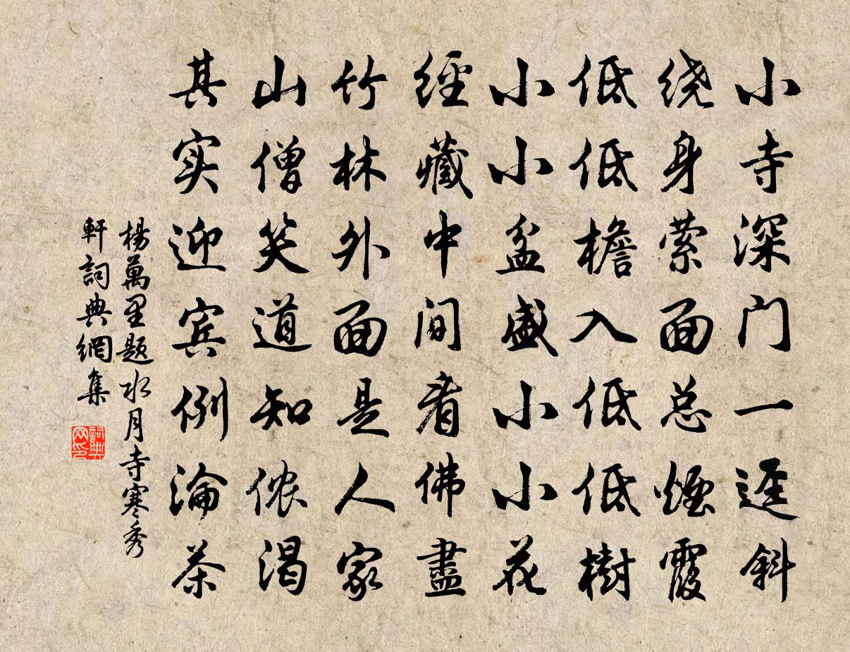 詩詞名句歷史字典書法欣賞書法字典國語詞典說文解字康熙字典古漢語字典標 題 作 者 詩 句 題水月寺寒秀軒作者:楊萬里 朝代:宋代題水月寺寒秀軒原文小寺深門一逕斜,繞身縈面總煙霞。低低檐入低低樹,小小盆盛小小花。經藏中間看佛盡,竹林外面是人家。山僧笑道知儂渴,其實迎賓例淪茶。詩詞問答問:題水月寺寒秀軒的作者是誰?答:楊萬里問:題水月寺寒秀軒寫於哪個朝代?答:宋代問:楊萬里的名句有哪些?答:楊萬里名句大全楊萬里題水月寺寒秀軒書法欣賞題水月寺寒秀軒書法作品詩詞推薦過臨淮故里韓偓〔唐代〕交遊昔歲已凋零,第宅今來亦變更。舊廟荒涼時饗絕,諸孫飢凍一官成。五湖竟負他年志,百戰空垂異代名。榮盛送僧中孚南歸譚用之〔唐代〕琵琶峽口月溪邊, * 頭佗憶舊川。一錫冷涵蘭徑路,片帆香掛橘洲煙。苔封石錦棲霞室,水迸衣珠噴玉蟬。莫道鵲橋仙(安仁道中雪)趙師俠〔宋代〕同雲冪冪,狂風浩浩,激就六花飛下。山川滿目白模糊,更茅舍、溪橋瀟灑。玉田銀界,瑤林瓊樹,光映乾坤不夜緣識宋太宗〔宋代〕蠻夷未必盡無知,上聖功成亦化之。大道須歸真見性,灰心達善即為師。社鼓陸游〔宋代〕酒旗三家市,菸草十里陂。林間鼓冬冬,迨此春社時。飲福父老醉,嵬峨相扶持。君勿輕此聲,可配豐年詩。夜讀傳燈雜書六言八首劉克莊〔宋代〕麟經之筆既絕,蠶室之書遂行。聃非二子同傳,齊魯兩生失名。得江西報六言十首劉克莊〔宋代〕巧發過如蠆毒,困鬥尤防獸窮。老種有騎河語,小姚無劫寨功。趙主簿護貢篚至吳下有詩見示用詩為謝晁公溯〔宋代〕軸艫千里薄樅陽,未數當年漢省方。勿為催歸啼望帝,且看奉引駕乘黃。四邊每報風塵靜,萬國同瞻日月光。我願失調名樓采〔宋代〕珠蹙花輿,翠翻蓮額。尋真夕對趙崇鉘〔宋代〕春雲弄月黃金絲,春山草木皆仙姿。松根對坐日西夕,群峰當前列青壁。鏗鏗虛壑含古音,靜聽宛是商山吟。洞石喜遷鶯蔣捷〔宋代〕晴天寥廓。被孤雲畫出,離愁消索。玉局彈棋,金釵翦燭,芳思可勝搖落。鏡妝為慵遲晚,笙曲緣愁差錯。倒纖指二月十七日馬上鄭剛中〔宋代〕愁多發白惟知老,病起花飛不見春。我得此生真偶爾,休貪畫餅作痴人。山中喜得友生書齊己〔唐代〕柴門關樹石,未省夢塵埃。落日啼猿里,同人有信來。自成為拙隱,難以謝多才。見說相思處,前峰對古台。梅花十絕句趙蕃〔宋代〕梅花佳處是孤影,月落參橫真見之。幾欲煩我為摹寫,卻愁才盡不能支。和御製上元觀燈曾鞏〔宋代〕翠幰霓旌夾露台,夜涼宮扇月中開。龍銜燭抱金門出,鰲負山趨玉座來。碭極戲添夷客喜,柏梁篇較從臣材。共知春雨劉子翬〔宋代〕暝色春朝雨,滋榮喜及時。雲昏遙莫辨,地渴久方知。柳岸游畫歇,濤江釣舸移。拒寒須把酒,病骨況支離。偈頌一百二十三首釋普度〔宋代〕麵皮上颳得霜,枯骨里敲出髓。轉得身,吐得氣。不是不是。送中書潘舍人省上二首蘇籀〔宋代〕紫微雞省待論思,少作英辭寤柬奇。高浪駕天輸朗漢,紫霄即日奮長離。然明東里今同道,德裕封敖適此時。應笑代餞蜀閫赴召樂語口號李曾伯〔宋代〕自擁琱旗運閫籌,星霜四歷玉關秋。深培根本安全蜀,直用精神定遠陬。琴鶴公將離峽口,樵漁我亦訪吳頭。溪山九日登望仙台呈劉明府容崔曙〔唐代〕漢文皇帝有高台,此日登臨曙色開。三晉雲山皆北向,二陵風雨自東來。關門令尹誰能識,河上仙翁去不回。且欲名句推薦旦別河橋楊柳風,夕臥伊川桃李月。宋之問《寒食還陸渾別業》 愁一箭風快,半篙波暖,回頭迢遞便數驛周邦彥《蘭陵王·柳》 殷勤昨夜三更雨,又得浮生一日涼。蘇軾《鷓鴣天·林斷山明竹隱牆》 思爾為雛日,高飛背母時。白居易《燕詩示劉叟》 驅雞上樹木,始聞叩柴荊。杜甫《羌村三首·其三》 帶長劍兮挾秦弓,首身離兮心不懲。屈原《國殤》 子治世之能臣,亂世之奸雄也。羅貫中《三國演義·第一回》 誠者,不勉而中不思而得:從容中道,聖人也。子思《中庸·第二十章》 谷不熟為飢,蔬不熟為饉,果不熟為荒,仍飢為薦。佚名《爾雅·釋天》 有情不管別離久。情在相逢終有。晏幾道《秋蕊香·池苑清陰欲就》