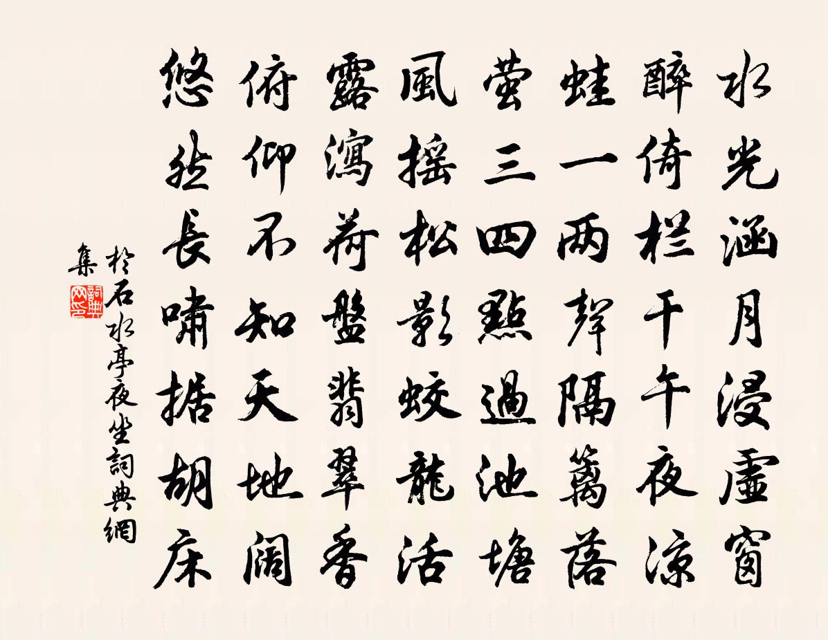 詩詞名句歷史字典書法欣賞書法字典國語詞典說文解字康熙字典古漢語字典標 題 作 者 詩 句 水亭夜坐作者:於石 朝代:宋代水亭夜坐原文水光涵月浸虛窗,醉倚欄乾午夜涼。蛙一兩聲隔籬落,螢三四點過池塘。風搖松影蛟龍活,露瀉荷盤翡翠香。俯仰不知天地闊,悠然長嘯據胡床。詩詞問答問:水亭夜坐的作者是誰?答:於石問:水亭夜坐寫於哪個朝代?答:宋代於石水亭夜坐書法欣賞水亭夜坐書法作品詩詞推薦阮郎歸辛棄疾〔宋代〕山前風雨欲黃昏。山頭來去雪。鷓鴣聲里數家村。瀟湘逢故人。揮羽扇,整綸巾。少年鞍馬塵。如今憔悴賦招魂。湖州歌九十八首 其七十八汪元量〔宋代〕第九筵開盡帝妃,三宮端坐受金卮。須臾殿上都酣醉,拍手高歌舞雁兒。閉門陳杰〔宋代〕閉門風雨九十日,生物趨新曾未休。適見桃枝暗明月,漸聞柳絮逐江流。呂尚書挽章王洋〔宋代〕四海咄伸勢,安危俯仰殊。犬戎蟠洛邑,晉鄙握兵符。楊李生同烈,高秦死異區。誰如雙劍化,義烈一門俱。留題友人郊居夏竦〔宋代〕卜築遠朝市,著書成歲功。長雲覆孤木,古道滿清風。地勝花房異,山靈雨氣通。綸巾不可戀,鶴版下關東。園櫻傷老也司馬光〔宋代〕個性泛舟,載縱載橫。白日淨傾,飄風載驚。嗟我老矣,發脫齒零。胡為百憂,勞此餘生。蘄春聽琵琶五首孔武仲〔宋代〕銀燭交光桂釀清,親朋相見苦多情。春宵萬籟俱澄絕,初試鵾弦驟雨聲。王寶謨輓詩魏了翁〔宋代〕昔我仕龜城,猶能友寧馨。記曾{左奭右斗}別酒,俄遽隔泉扃。頃刻成三世,淒涼隔九齡。魂兮誰與作,吾友許清平樂 張秀實芍藥詞劉敏中〔元代〕牡丹花落。夢裡東風惡。見說君家紅芍藥。盡把春愁忘卻。隔牆百步香來。數叢為我全開。拚向彩雲堆里,醉時同句呂希哲〔宋代〕獨抱遺經唐處士,差強人意漢將軍。銅雀硯梅堯臣〔宋代〕歌舞人已死,台殿棟已傾。舊基生黑棘。古瓦埋深耕。玉質先骨朽,松棟為埃輕。築緊風雨剝,埏和鉛膏精。不作思親五首謝枋得〔宋代〕九十萱親天下稀,人無容力荷天慈。衣冠禮樂江東聚,此是痴兒奉母時。隱淺挺之平甫來飲梅堯臣〔宋代〕泛淮忌水大,我行浩以漫。泝汴忌水淺,我行幾以乾。偶與困滯並,將獨為此難。窮堤有來客,芬芳可與言。共休宮詞四首吳百生〔宋代〕阿嬌金屋閉,群玉奉龍舉。夜色明光酒,春風長信裾。傳宣嚴伏合,應侍冶容虛。笑簇嫣然地,名花總不如。逍遙堂會宿二首蘇轍〔宋代〕秋來東閣涼如水,客去山公醉似泥。困臥北窗呼不起,風吹松竹雨淒淒。尚書筵中詠紅手帕徐夤〔唐代〕鶴綾三尺曉霞濃,送與東家二八容。羅帶繡裙輕好系,藕絲紅縷細初縫。別來拭淚遮桃臉,行去包香墜粉胸。無事虞美人馮延巳〔唐代〕碧波簾幕垂朱戶,簾下鶯鶯語。薄羅依舊泣青春,野花芳草逐年新,事難論。鳳笙何處高樓月,幽怨憑誰說?須臾題牧隱二首袁說友〔宋代〕年來厭索長安米,老去猶居大隱廛。豈是紅塵故相挽,枉令空愧牧牛篇。自宣溪過早禾渡劉過〔宋代〕雨後斜陽未見晴,曉看紅日報空明。筍輿十里宣溪路,劃地濃雲腳里行。秋思陸游〔宋代〕門巷蕭條秋色深,黃花始欲慰孤斟。久貧自笑不妨樂,過足固知非所欽。琴調已忘還漸省,詩聯未穩更長吟。吾兒名句推薦欺君為大,加諸罪無可免;枉法不容,縱其為禍方懲。來俊臣《羅織經·謀劃卷第九》 夫君子愛口,孔雀愛羽,虎豹愛爪,此皆所以治身法也。劉向《說苑·雜言》 滄海月明珠有淚,藍田日暖玉生煙。李商隱《錦瑟》 別浦今朝暗,羅帷午夜愁李賀《七夕》 流水落花春去也,天上人間。李煜《浪淘沙令·簾外雨潺潺》 孤客傷逝湍,徒旅苦奔峭。謝靈運《七里瀨》 海棠枝上立多時,飛向小橋西畔去。宋徵輿《玉樓春·燕雕樑畫棟原無數》 風雨送人來,風雨留人住。游次公《卜運算元·風雨送人來》 林花謝了春紅,太匆匆。無奈朝來寒雨晚來風。李煜《相見歡·林花謝了春紅》 漸秋闌、雪清玉瘦,向人無限依依。李清照《多麗·詠白菊》