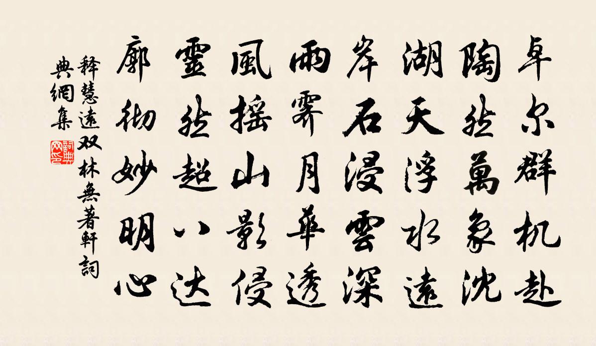 詩詞名句歷史字典書法欣賞書法字典國語詞典說文解字康熙字典古漢語字典標 題 作 者 詩 句 雙林無著軒作者:釋慧遠 朝代:宋代雙林無著軒原文卓爾群機赴,陶然萬象沈。湖天浮水遠,岸石浸雲深。雨霽月華透,風搖山影侵。靈然超八達,廓徹妙明心。詩詞問答問:雙林無著軒的作者是誰?答:釋慧遠問:雙林無著軒寫於哪個朝代?答:宋代釋慧遠雙林無著軒書法欣賞雙林無著軒書法作品詩詞推薦六橋閒步薛師傳〔宋代〕向晚西湖路,煙霞淡水汀。垂楊拂波綠,芳劃幔隄青。地僻漁樵聚,山深殿閣扃。平生卜投老,夢寐有南屏。和遁澤初夏韻二首王柏〔宋代〕深深陋巷更深藏,襪線曾無一寸長。學問不宜隨苟且,傳聞何敢喜張皇。一池科斗書千古,滿徑風騷竹萬章。此意句余洪道〔宋代〕著心計較般般錯,退步思量事事寬。和堯夫見寄司馬光〔宋代〕仁政如慈父,蒲人得所依。教條前後接,風亦古今稀。試郡纏書最,還朝必奮飛。西台舊班列,猶望繡衣歸。送行上人歸塔慧力空印和尚靈骨於西山釋慧空〔宋代〕古佛大塔廣,量廓虛空界。凡聖位其中,如光無雜壞。出生與入滅,一一得自在。眾生迷本心,當處自留礙。良哉次韻答友人四首仲並〔宋代〕久矣忘情豈用閒,已看要起示無還。自懷白髮蒼顏客,不墮黃花翠竹間,顧我分為方外友,如公合上道家山。暇時遇仇仁近出齋小飲次前韻五首方回〔宋代〕我詩市匠制錐觿,君集王朝粲璧圭。奇語時常欹枕詠,佳聯直欲遍窗題。猥思駑駕能追驥,終愧東顰敢效西。赤甲呈晁舅祖叔蘊趙蕃〔宋代〕輩行雖如祖,年齡僅可兄。經過得屢見,文字有同盟。門戶當深責,饑寒厭此生。良農務穮蔉,初不計秋成。晨興陳文蔚〔宋代〕書窗欲曙夢初還,起坐披衣百慮間。誰識斯時會心處,靜聽鳥語樂相關。雜曲歌辭。結客少年場行虞羽客〔唐代〕幽并俠少年,金絡控連錢。竊符方救趙,擊築正懷燕。輕生辭鳳闕,揮袂上祁連。陸離橫寶劍,出沒驚徂旃。蒙輪湖北提刑林寺丞赴召以書索詩魏了翁〔宋代〕鏦金伐鼓催行丹,攔街祖帳雲如稠。祥刑使者入奏事,詔書趣發不可留。居人爭門挽衣住,行人十步九回雇。公言千秋歲·水邊沙外秦觀〔宋代〕水邊沙外。城郭春寒退。花影亂,鶯聲碎。飄零疏酒盞,離別寬衣帶。人不見,碧雲暮合空相對。憶昔西池會。鵷括虞美人林正大〔宋代〕武昌七十龐眉叟。學備從年少。蕭蕭笛竹楚山秋。當日買林曾典、黑貂裘。一聲占盡秋江月。天外行雲絕。如今老三讓月成魄(不得泛說鄉飲之事)劉王曵〔唐代〕為禮依天象,周旋逐月成。教人三讓美,為客一宵生。初進輪猶暗,終辭影漸明。幸陪賓主位,取捨任虧盈。送陳日章秀才林逋〔宋代〕閒卻清尊掩縹囊,病來無故亦淒涼。江南春草舊行路,因送歸人更斷腸。江南歸附後不仕述懷艾可叔〔宋代〕舟在中流進退難,發雖種種此心丹。死為元亮終書晉,生是留侯本事韓。貧賤不憂知有道,亂離最幸是無官。歲寒和徐季功舒蘄道中二十首王之道〔宋代〕灊皖歸來麥已秋,相從時說白雲遊。八年不踐同安境,夢裡山溪記舊由。秋懷林逋〔宋代〕霏霏煙雨拂西窗,緗帙披殘臥縹缸。林木細分山去削,水波微動鶴丁樁。涼沈欲睡何妨縱,靜壯詩魔未易降。搔首西湖雨中同公懿諸君飲韓維〔宋代〕十月平湖上,繁霜藻荇空。柳枝橫墮雨,波白細生風。水鳥飛幽碧,寒花折淺紅。誰能盡一醉,燈火宿船篷。鷓鴣天·當日佳期鵲誤傳晏幾道〔宋代〕當日佳期鵲誤傳,至今猶作斷腸仙。橋成漢渚星波外,人在鸞歌鳳舞前。歡盡夜,別經年,別多歡少奈何天。情知名句推薦翅低白雁飛仍重,舌澀黃鸝語未成。白居易《南湖早春》 疏籬下、試覓重陽,醉擘青露菊。吳文英《一寸金·秋感》 鐘山抱金陵,霸氣昔騰發。李白《登梅岡望金陵贈族侄高座寺僧中孚》 牽牛織女遙相望,爾獨何辜限河梁。曹丕《燕歌行二首·其一》 下貧則上貧,下富則上富。荀子《荀子·富國》 張翰江東去,正值秋風時。李白《送張舍人之江東》 一畦春韭綠,十里稻花香。曹雪芹《菱荇鵝兒水》 愛子心無盡,歸家喜及辰。蔣士銓《歲暮到家》 物莫非指,而指非指。公孫龍《公孫龍子·指物論》 行一不義,殺一無罪,而得天下,仁者不為也。司馬光《資治通鑑·周紀·周紀四》