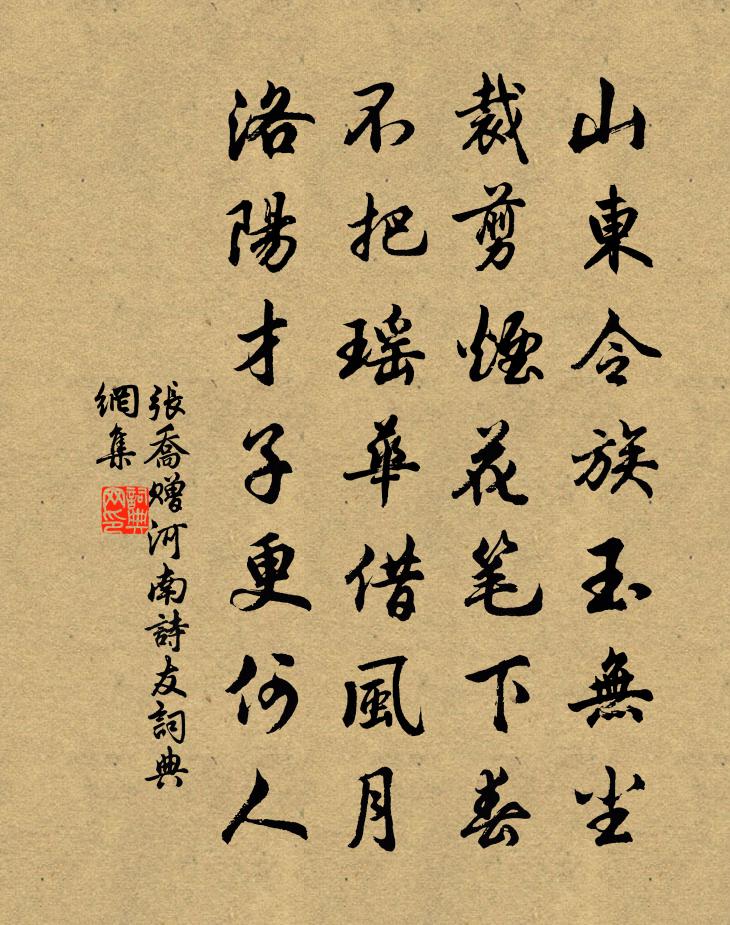 詩詞名句歷史字典書法欣賞書法字典國語詞典說文解字康熙字典古漢語字典標 題 作 者 詩 句 贈河南詩友作者:張喬 朝代:唐代贈河南詩友原文山東令族玉無塵,裁剪煙花筆下春。不把瑤華借風月,洛陽才子更何人。詩詞問答問:贈河南詩友的作者是誰?答:張喬問:贈河南詩友寫於哪個朝代?答:唐代問:贈河南詩友是什麼體裁?答:七絕張喬贈河南詩友書法欣賞贈河南詩友書法作品注釋全唐詩:卷639-32詩詞推薦用明發不寐有懷二人為韻寄李秉彝德叟黃庭堅〔宋代〕往在舅氏旁,獲拚堂上帚。六經觀聖人,明如夜占斗。索居廢舊聞,獨學無新有。羨子杞梓材,未曾離矯揉。垂虹亭觀打魚斫鱠四首楊萬里〔宋代〕六隻輕舠攪四旁,兩船不動水中央。網絲一撒還空舉,笑得倚欄人斷腸。奉酬洪景伯謝伋〔宋代〕屏居常恨造門疏,覿面真如得異書。昔年丹筆勘閣本,此日海邦題坐輿。幸接好音聞正始,豈惟妙句突黃初。道山釣翁(一作鄭谷詩)羅鄴〔唐代〕來往煙波非定居,生涯蓑褐外無餘。閒垂兩鬢任如鶴,只系一竿時得魚。月浦扣船歌皎潔,雨蓬隈岸臥蕭疏。行人讀天寶事楊萬里〔宋代〕日晚無煙起御廚,野人豆飯未嫌粗。問知雲子炊香日,政是梨花帶雨初。雞答宋祁〔宋代〕君園稻富非爭食,省樹枝深未許棲。但得齊蠅無亂響,不辭風雨五更啼。春日雜言李新〔宋代〕妖桃氣濃暖,蛾眉困風光。楊花撲羅帳,春夢自悠揚。愁心如碧草,隨春日益長。碧草逢秋歇,此恨何時忘。責睡魔馮時行〔宋代〕綠陰滿門春已還,黃鸝門外猶綿蠻。蕭蕭冷官無一事,高齋搔首兀痴頑。睡魔襲我意蕭散,直來眉睫揚神奸。須臾寄同年懷安曹守二首袁說友〔宋代〕我丈之賢今老成,題輿剖竹傍青城。從容官事一時了,莫忘蓴鱸秋日羹。山中王鎡〔宋代〕榮枯皆定數,枉作送窮吟。有色非真畫,無弦是古琴。青松秦世事, * 晉人心。塵外煙蘿客,相尋入遠林。和李子儀韻四首吳芾〔宋代〕我已成衰謝,傳家在此兒。俄然聞感疾,至欲別呼醫。愁緒渾無奈,憂心只自知。如今安樂也,有酒任盈卮。病中雜興五言十首劉克莊〔宋代〕鰲頂來差晚,龍髯去莫攀。不能從襄野,只合殉橋灣。次韻游龍門十絕洪咨夔〔宋代〕欲訪天池水發源,倒騎北斗挾飛仙。高低八節灘頭路,俯仰三生石上緣。高宗郊祀前廟朝享太廟三十首真宗〔宋代〕熙事既成,嘉籩告嚴。洋洋來臨,藹藹布列。配帝其功,在天對越。允集叢釐,萬邦和悅。玉笈齋書事陸游〔宋代〕莫笑新霜點鬢須,老來卻得少工夫。晨占上古連山易,夜對西真五嶽圖。叔夜曾聞高士嘯,孔賓豈待異人呼。眉間謝曹宗臣惠雙溪集楊萬里〔宋代〕君不見東陽沈隱侯,君不見宣城謝玄暉,兩處雙溪清徹底,二子詩句清於溪。千載卻有曹夫子,天借古人作詩地。監察十五叔東齋招李益端公會別孟郊〔唐代〕欲知惜別離,瀉水還清池。此地有君子,芳蘭步葳蕤。手掇雜英珮,意搖春夜思。莫作繞山雲,循環無定期。侍宴旋師喜捷應制韋安石〔唐代〕蜂蟻屯夷落,熊羆逐漢飛。忘軀百戰後,屈指一年歸。厚眷紓天藻,深慈解御衣。興酣歌舞出,朝野嘆光輝。種梅史文卿〔宋代〕呼僮耕雲種瑤樹,斗掛青冥下風露。隔林野鶴不知寒,為我飛來復飛去。居天柱山釋贊寧〔宋代〕四野豁家庭,柴門夜不扃。水邊成半偈,月下了殘經。雖逐諸塵轉,終歸一念醒。未知斯旨者,萬役盡勞形。名句推薦下馬登鄴城,城空復何見。岑參《登古鄴城》 任憑弱水三千,我只取一瓢飲。曹雪芹《紅樓夢·第九十一回》 春風旍旗擁萬夫,幕下諸將思草枯。黃庭堅《送范德孺知慶州》 臥看牽牛織女星,月轉過梧桐樹影。盧摯《沉醉東風·七夕》 苦心中常得悅心之趣;得意時便一失意之悲。洪應明《菜根譚·概論》 春雪滿空來,觸處似花開。東方虬《春雪》 芙蓉老秋霜,團扇羞網塵。李白《中山孺子妾歌》 繁霜儘是心頭血,灑向千峰秋葉丹。戚繼光《望闕台》 飢不擇食,寒不擇衣,慌不擇路,貧不擇妻。施耐庵《水滸傳·第三回》 道傍榆莢仍似錢,摘來沽酒君肯否。岑參《戲問花門酒家翁》