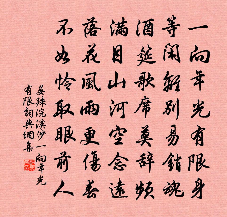 “ 一向年光有限身。”,劈空而來,語甚警煉。惜春光之易逝,感盛年之不再,有撼人心魄的效果。緊接“等閒”句,加厚一筆。詞中所寫的,不是生離,更不是死別,而只不過是尋常的離別而已。“等閒”二字,殊不等閒,具見詞人之深於情。在短暫的人生中,別離是不只一次會遇到的,而每一回離別,都占去有限年光的一部分,詞人唯有強自寬解:“ 酒筵歌席莫辭頻”。痛苦是無益的,不如對酒當歌, 自遣情懷吧。這句寫及時行樂,聊慰此有限之身。