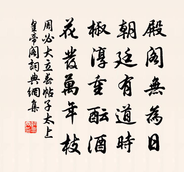 詩詞名句歷史字典書法欣賞書法字典國語詞典說文解字康熙字典古漢語字典標 題 作 者 詩 句 立春帖子太上皇帝閣作者:周必大 朝代:宋代立春帖子太上皇帝閣原文殿閣無為日,朝廷有道時。椒淳重醞酒,花發萬年枝。詩詞問答問:立春帖子太上皇帝閣的作者是誰?答:周必大問:立春帖子太上皇帝閣寫於哪個朝代?答:宋代周必大立春帖子太上皇帝閣書法欣賞立春帖子太上皇帝閣書法作品詩詞推薦荷花鄭剛中〔宋代〕美艷向人花灼灼,青圓如鑒葉田田。月明徙倚闌乾處,細得真香憶去年。傷仲永王安石〔宋代〕金溪民方仲永,世隸耕。仲永生五年,未嘗識書具,忽啼求之。父異焉,借旁近與之,即書詩四句,並自為其名。季弟黃岩任滿大人挈家眾先要作詩見示恭和元孫應符〔宋代〕心處中虛治五官,特來能應固非難。移忠益本居家孝,閱暑知曾歷歲寒。父子賡歌真內樂,弟兄分職賴居安。何妨送趙叔靜教授閩中四首陳傅良〔宋代〕百吏不可試,卷懷州校官。翩然落南閩,不為荔子丹。彫蟲妙經術,倚市多儒冠。吾道未必貴,政此良已難。聞虜人敗於柘皋作口號十首龐謙孺〔宋代〕戰伐無多生女真,人傳強半是簽軍。可憐盡死天兵手,但恐官家不得聞。閒居雜詠三十二首義維陳淳〔宋代〕義以維其心,在心常有制。惟為理所宜,不徇情所利。示智悟道人釋鹹傑〔宋代〕智悟悟自心,不在一切處。回首時觀瞻,便是佛國士。荔子丹佚名〔宋代〕鬥巧宮妝掃翠眉。相喚折花枝。曉來深入艷芳里,紅香散,露浥在羅衣。盈盈巧笑詠新詞。舞態畫嬌姿。裊娜文回次王待制維舟弄水亭韻喻良能〔宋代〕萬里浮江更絕湖,扁舟東人霅川圖。莫言舊菊荒三徑,須信中流待一壺。今日詩筒煩遠寄,昔年樽酒記相呼。立朝次韻孔平仲著作見寄四首蘇轍〔宋代〕昔在京城南,成均封茅屋。清晨屣履過,不顧車擊轂。時有江南生,能使多士服。同儕畏鋒銳,兄弟更馳逐。文成頌一百則釋重顯〔宋代〕祖域交馳天馬駒,化門舒捲不同途。電光石火存機變,堪笑人來捋虎鬚。離堆行范成大〔宋代〕殘山狠石雙虎臥,斧跡鱗皴中鑿破。潭淵油油無敢唾,下有猛龍跧鐵鎖。自從分流注石門,西州粳稻如黃雲。刲羊讀本朝史有感十首項安世〔宋代〕師道在三鳥可畔,友倫居五豈容虧。恰方譽瓘俄傾瓘,亦有尊頤不求頤。放翁坐上劉過〔宋代〕林霧霏霏曉意涼,野梔才放已傳香。幸哉世事日相遠,怪底時情老更狂。臘蟻三杯浮重碧,春膏一幅砑輕黃。何如孫抗寺丞宰晉陵宋祁〔宋代〕舊筆刑丹燥,新辭苑雪妍。一名遲上月,再擊始垂天。鷁首凌波穩,鳧翁賜綬鮮。邑歌豐暇日,擿句暮爭傳。登城陸游〔宋代〕簿領無時了,登臨亦快哉。樓危壓城起,硤迮束江來。病瘴拋書帙,思鄉泥酒杯。天寒水盡落,灩澦已崔嵬。送謝處士南歸宋祁〔宋代〕歲晏心無著,時清遁更肥。江蒪縈箸滑,海鳥傍帆飛。鄉思生閩霧,吟懷入楚霏。趨庭多令子,采服間荷衣。榕樹樓晚眺李秉禮〔清代〕高閣登臨快晚晴,好風吹送葛衣輕。 雲中古寺疏鍾動,樹里斜陽遠岫明。 被岸軟沙眠乳犢,蘸波垂柳囀流鶯。將至敘州范成大〔宋代〕亂山滿平野,漲水豪大川。仄徑無轍跡,疏林有炊煙。山農旦燒畲,蠻賈暑荷氈。窮鄉足荒怪,打鼓催我船。紹興以後時享二十五首真宗〔宋代〕炎基克蛩,赫赫英宗。紹休前烈,仁化彌隆。篤生聖子,堯湯比從。孫賞萬世,福祿來崇。名句推薦郭門臨渡頭,村樹連谿口。王維《新晴野望》 發言玄遠,口不臧否人物。房玄齡《晉書·列傳·第十九章》 冬夜兮陶陶,雨雪兮冥冥。王逸《九思》 清明時節出郊原,寂寂山城柳映門。楊徽之《寒食寄鄭起侍郎》 山桃紅花滿上頭,蜀江春水拍山流。劉禹錫《竹枝詞·山桃紅花滿上頭》 子不能治子之身,惡能治國政。墨子《墨子·48章 公孟》 淇園春竹美,軍宴日椎牛。司馬光《送龔章判官之衛州·新及第》 春來秋去相思在,秋去春來信息稀。魚玄機《閨怨》 雲移雉尾開宮扇,日繞龍鱗識聖顏。杜甫《秋興八首》 少小離家老大回,鄉音無改鬢毛衰。賀知章《回鄉偶書二首·其一》
