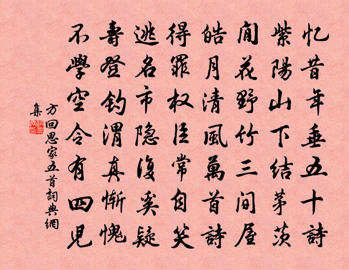 詩詞名句歷史字典書法欣賞書法字典國語詞典說文解字康熙字典古漢語字典標 題 作 者 詩 句 思家五首作者:方回 朝代:宋代思家五首原文憶昔年垂五十詩,紫陽山下結茅茨。閒花野竹三間屋,皓月清風萬首詩。得罪權臣常自笑,逃名市隱復奚疑。壽登釣渭真慚愧,不學空令有四兒。詩詞問答問:思家五首的作者是誰?答:方回問:思家五首寫於哪個朝代?答:宋代方回思家五首書法欣賞思家五首書法作品詩詞推薦烏棲曲張籍〔唐代〕西山作宮潮滿池,宮鳥曉鳴茱萸枝。吳姬採蓮自唱曲,君王昨夜舟中宿。定風波黃庭堅〔宋代〕把酒花前欲問溪。問溪何事晚聲悲。名利往來人盡老。誰道。溪聲今古有休時。且共玉人斟玉醑。休訴。笙歌一曲憶江南·歌起處王世貞〔明代〕歌起處,斜日半江紅。柔綠篙添梅子雨,淡黃衫耐藕絲風。家在五湖東。用前韻酬高仲貽見贈林季仲〔宋代〕杖藜谷口佇歸雲,生理蕭條一葛巾。未敢軒眉焚芰制,更期晚節伴霜筠。江山約我盟猶在,風月於人意自新。木落竹簟元稹〔唐代〕竹簟襯重茵,未忍都令卷。憶昨初來日,看君自施展。依韻和楊州許待制竹拄杖梅堯臣〔宋代〕楚竹翦霜叢,何慚漢使筇。鳩形殊用刻,馬箠不同功。挺特生難變,支離分已窮。輕肥思比鶴,短髮任如蓬。倚以奉和幸三會寺應制劉憲〔唐代〕岧嶢倉史台,敞朗紺園開。戒旦壺人集,翻霜羽騎來。下輦登三襲,褰旒望九垓。林披館陶榜,水浸昆明灰。網戶雞司馬光〔宋代〕羽短籠深不得飛,久留寧為稻粱肥。膠膠風雨鳴何苦,滿室高眠正掩扉。再次前韻胡寅〔宋代〕經年與花別,花意不相忘。綽約素情在,掃除時世妝。楚人輕剪伐,北客護垣牆。半樹竹亭亞,幾株溪水陽。可模宛陵道中楊萬里〔宋代〕溪繚雙衣帶,橋森百足蟲。傘聲松徑雨,巢影柳塘風。犬誤隨行客,牛偏識牧童。追程非要緩,路滑試匆匆。踏莎行向滈〔宋代〕萬水千山,兩頭三緒。憑高望斷迢迢路。錢塘江上客歸遲,落花流水青春暮。步步金蓮,朝朝瓊樹。目前都是傷心觀水上斜照張鎡〔宋代〕吹落天河入水中,分明金鍍晚來風。若非日腳流成汁,平楚青還染得紅。寄湘中鄭明府黃滔〔唐代〕縣與白雲連,滄洲況縣前。岳僧同夜坐,江月看秋圓。琴拂莎庭石,茶擔乳洞泉。莫耽雲水興,疲俗待君痊。風入松晏幾道〔宋代〕心心念念憶相逢。別恨誰濃。就中懊惱難拼處,是擘釵、分鈿匆匆。卻似桃源路失,落花空記前蹤。彩箋書盡浣溪玉樓春(至盱眙作)毛滂〔宋代〕長安回首空雲霧。春夢覺來無覓處。冷煙寒雨又黃昏,數盡一堤楊柳樹。楚山照眼青無數。淮口潮生催曉渡。西風明照坊對雨宋褧〔元代〕章台車馬去如流,白雨霏煙拂畫樓。九陌平鋪明似練,兩溝急瀉碧於油。美人虹見西山霽,少女風來北里秋。涼意山間孫岩〔宋代〕谷鳥鳴聲滑,山雲變態新。清渠不沒脛,亦有浣紗人。山陽韋中丞罷郡因獻趙嘏〔唐代〕笙歌只是舊笙歌,腸斷風流奈別何。照物二年春色在,感恩千室淚痕多。盡將魂夢隨西去,猶望旌旗暫一過。今日戊午元日讀書至夜分有感陸游〔宋代〕強戴羅旛怯歲增,光陰堪嘆捷飛騰。檐間點滴新春雨,窗下青熒半夜燈。傍架討尋書散亂,倚屏吟嘯發鬅鬙。極知答勸農李淵宗嘉州江行宋祁〔宋代〕嘉月嘉州路,軻峨按部船。山圍杜宇國,江入夜郎天。霽引溪樓望,涼供水館眠。愧君舟檝意,遂欲濟長川。名句推薦牆頭馬上遙相顧,一見知君即斷腸。白居易《井底引銀瓶·止淫奔也》 人閒桂花落,夜靜春山空。王維《鳥鳴澗》 一年之計在於春,一日之計在於寅。佚名《增廣賢文·上集》 風急天高猿嘯哀,渚清沙白鳥飛回。杜甫《登高》 追亡事、今不見,但山川滿目淚沾衣辛棄疾《木蘭花慢·席上送張仲固帥興元》 發號施令,若汗出於體,一出而不復也。吳兢《貞觀政要·卷八·論赦令》 陰陰溪曲綠交加,小雨翻萍上淺沙。晁沖之《春日·陰陰溪曲綠交加》 宜有詞仙,擁素雲黃鶴,與君遊戲。姜夔《翠樓吟·淳熙丙午冬》 江南可採蓮,蓮葉何田田。佚名《江南》 最傷情、送客鹹陽,佩結西風怨。吳文英《瑣窗寒·玉蘭》