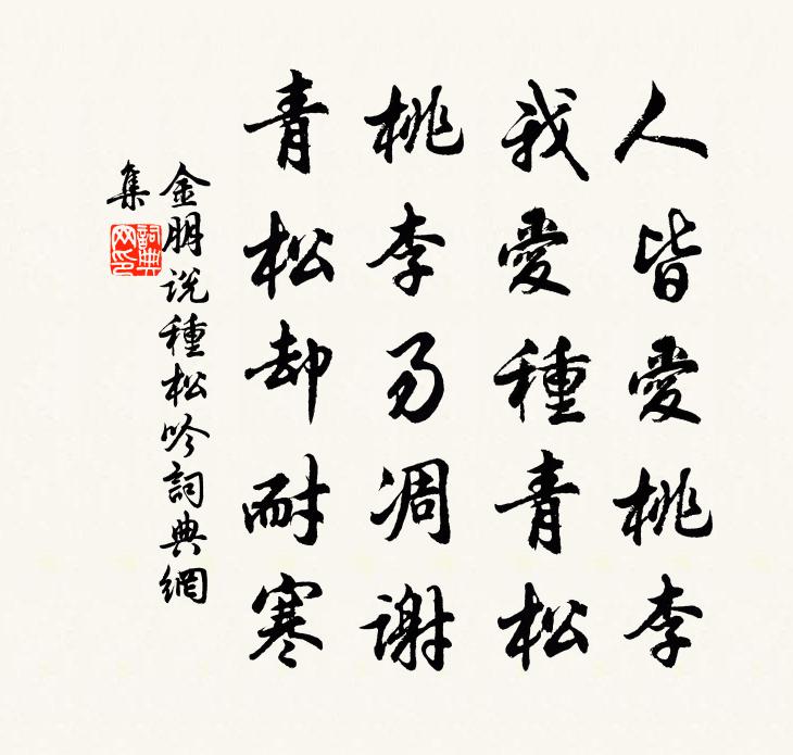 詩詞名句歷史字典書法欣賞書法字典國語詞典說文解字康熙字典古漢語字典標 題 作 者 詩 句 種松吟作者:金朋說 朝代:宋代種松吟原文人皆愛桃李,我愛種青松。桃李易凋謝,青松卻耐寒。詩詞問答問:種松吟的作者是誰?答:金朋說問:種松吟寫於哪個朝代?答:宋代金朋說種松吟書法欣賞種松吟書法作品詩詞推薦春日途中李若水〔宋代〕一川晴日破春容,柳絮桃紅赴望中。莫喜芳辰又來到,少年能耐幾東風。和王安撫六言十首項安世〔宋代〕脫腕流泉纚纚,忘懷大智閒閒。學蘇二李十二,笑山谷陳後山。始皇陵下作曹鄴〔唐代〕千金買魚燈,泉下照狐兔。行人上陵過,卻吊扶蘇墓。累累壙中物,多於養生具。若使山可移,應將秦國去。舜歿喜晴一首劉克莊〔宋代〕□尚紛言擾,燭龍深伏藏。金雞不能忍,騰出照扶桑。經墮淚碑任翻〔唐代〕羊公傳化地,千古事空存。碑已無文字,人猶敬子孫。峴山長閉恨,漢水自流恩。數處煙嵐色,分明是淚痕。道中題梅李處權〔宋代〕山家梅樹出疏籬,好客殷勤折一枝。直是老來風味薄,而今相遇可無詩。安陶舟中晁補之〔宋代〕繚繞春堤去欲窮,參差煙塢到還通。依依潤柳侵晨雨,細細吹花傍午風。送李秀才入軍李山甫〔唐代〕弱柳貞松一地栽,不因霜霰自難媒。書生只是平時物,男子爭無亂世才。鐵馬已隨紅旆去,同人猶著白衣來。到頭靜臥棲霞寺房望徐祭酒詩江總〔隋代〕絕俗俗無侶。修心心自齋。連崖夕氣合。虛宇宿雲霾。臥藤新接戶。欹石久成階。樹聲非有意。禽戲似忘懷。故人次楊監簿新癖小西湖韻姚勉〔宋代〕搜奇抉異三十載,此湖如玉韞而待。發源遠自錦江來,匯流近與柴門對。山川融結自古有,造物扃藏深意在。瘦筇晉謝玄孫元晏〔唐代〕百萬兵來逼合肥,謝玄為將統雄師。旌旗首尾千餘里,渾不消他一局棋。句吳光〔宋代〕一軸塵埃古澀體,十年燈火短長檠。戲贈勤長老范成大〔宋代〕從君揮塵演金乘,我已無心纏葛藤。第一圓通三鼓夢,大千世界一窗燈。罷參柏子庭前意,權作梅花樹下僧。飯飽次韻孔平仲著作見寄四首蘇轍〔宋代〕共居天地間,大類一間屋。推排出高下,何異車轉轂。死生本晝夜,禍福固倚伏。誰令塵垢昏,浪與紛華逐。譬如鄭北山之元孫扁其樓王適莊為書北山之英四字金履祥〔宋代〕高牙大纛,虎節銅符。東將寬民,乃公所餘。送諫官南遷貫休〔唐代〕危行危言者,從天落海涯。如斯為遠客,始是好男兒。瘴雜交州雨,犀揩馬援碑。不知千萬里,誰復識辛毗。括蒼胡經仲以經術授吾鄉子弟吳芾〔宋代〕窮冬萬木凍欲折,獨有松篁抱高節。貧交無可效殷勤,持此與君聊贈別。益壽美金花侯善淵〔元代〕默然內守。混里傾陽無中有。有里何如。獨體圓通照海珠。神清氣秀。游奕丹天明如晝。上下無拘。密布靈華滿太襄陽作崔湜〔唐代〕廟堂初解印,郡邸忽腰章。按節巡河右,鳴騶入漢陽。城臨南峴出,樹繞北津長。好學風猶扇,誇才俗未忘。江山初蟬舒岳祥〔宋代〕雨余山氣涼,高林發清樾。黃鸝百囀罷,初蟬始幽咽。獨繭曳長繰,既續還又絕。衰年感時節,坐久心寸折。夢歸名句推薦細腰爭舞君沉醉,白日秦兵天下來。李涉《楚宮怨二首·其一》 莫遣只輪歸海窟,仍留一箭射天山。李益《塞下曲》 涕零雨面毀形顏,誰能懷憂獨不嘆。曹丕《燕歌行二首·其二》 脈脈廣川流,驅馬歷長洲。上官儀《入朝洛堤步月》 留連戲蝶時時舞,自在嬌鶯恰恰啼。杜甫《江畔獨步尋花·其六》 人刑者非人也,罰人者非罰也。來俊臣《羅織經·刑罰卷第十一》 疾風知勁草,板蕩識誠臣。李世民《賜蕭瑀》 故園渺何處,歸思方悠哉。韋應物《聞雁》 親戚或余悲,他人亦已歌。陶淵明《擬輓歌辭三首》 邊雪藏行徑,林風透臥衣。賈島《送鄒明府游靈武》