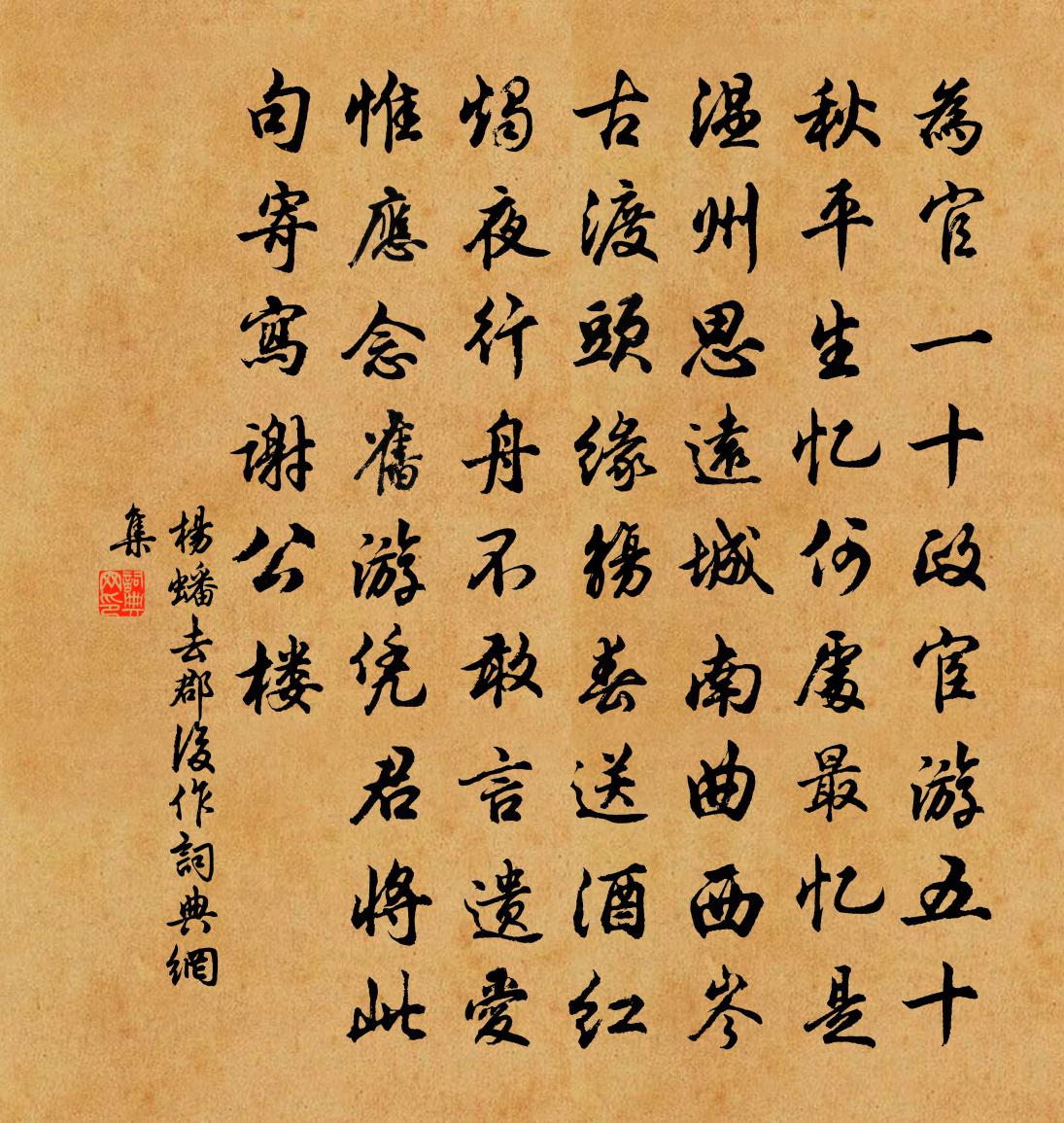 詩詞名句歷史字典書法欣賞書法字典國語詞典說文解字康熙字典古漢語字典標 題 作 者 詩 句 去郡後作作者:楊蟠 朝代:宋代去郡後作原文為官一十政,宦遊五十秋。平生憶何處,最憶是溫州。思遠城南曲,西岑古渡頭。緣觴春送酒,紅燭夜行舟。不敢言遺愛,惟應念舊遊。憑君將此句,寄寫謝公樓。詩詞問答問:去郡後作的作者是誰?答:楊蟠問:去郡後作寫於哪個朝代?答:宋代楊蟠去郡後作書法欣賞去郡後作書法作品詩詞推薦卓牌兒/卓牌子佚名〔宋代〕當年早梅芳,曾邂逅、飛瓊侶。肌雲瑩玉,顏開嫩桃,腰支輕裊,未勝金縷。佯羞整雲環,頻向人、嬌波寄語。湘送月上人南遊王灼〔宋代〕錦官東郭大蘭若,眼明見子長廊下。春風二月白帝城,一笑相逢手重把。羨子遠引如孤鵠,顧我低摧真病馬。碧山平床嶺劉克莊〔宋代〕一動非容易,三年議始成。倩人挑旅橐,買紙劄山程。下嶺峰如拜,登崖樹若迎。暫無塵事汩,便覺長吟情。粉蝶兒佚名〔宋代〕欲識還丹,認取自家宗祖。便不計、當初來處。是誰人,椿胎骨,誰人*塑捉住。這一靈性,元來是鉛結聚。既已頌古八首釋元聰〔宋代〕只知瞻禮紫金容,不覺腦門遭霹靂。平生心膽向人傾,相識還同不相識。魚歐陽修〔宋代〕秋水澄清見發毛,錦鱗行處水紋搖。岸邊人影驚還去,時向綠荷深處跳。不寐蘇泂〔宋代〕風露淒清入敝裘,月明偏照五更頭。無衣畢竟乾誰事,徹夜寒螿叫不休。田舍二首劉克莊〔宋代〕白布衫寬烏角巾,誰知曾扈屬車塵。行婆內翰共鄰曲,田父拾遺相主賓。設苜蓿盤殊菲薄,沽茅柴酒半漓淳。直令壽城凱還宴將帥樂語口號李曾伯〔宋代〕新墉屹屹解嚴圍,十萬全師破賊回。元帥擁旄朝授策,將軍畫箠夜銜枚。椎牛臠炙歡聲動,伐鼓傳觴哀拍催。盡道無題陳允平〔宋代〕鮫綃簾卷錦屏開,弱柳絲絲拂吹台。閒品琵琶不成調,落花飛趁曉風來。客裏釋文珦〔宋代〕客裏還驚節序還,倚闌搔首獨悽然。垂開柳眼如相看,落盡梅花又可憐。幻境自知如夢螘,離情幾欲托啼鵑。數聲寄令狐揆二首宋祁〔宋代〕楚山千疊隱南轅,漢渚風檣箭浪翻。流水東西俱怨別,離亭長短共銷魂。歌翻白雪知難和,注怯黃金故易昏。玉骨奉和御製龍圖等閣觀三聖御書詩司馬光〔宋代〕積厚丕丕業,重光鬱郁文。寶書長列宿,玉字切浮雲。散帙鳴鑾駐,充庭雜佩分。願移天縱藝,似續聖功勤。易州過郝逸人居賈島〔唐代〕每逢詞翰客,邀我共尋君。果見閒居賦,未曾流俗聞。也知鄰市井,宛似出囂氛。卻笑巢由輩,何須隱白雲。滕王閣感懷王安國〔宋代〕滕王平日好追游,高閣依然枕碧流。勝地幾經興廢事,夕陽偏照古今愁。城中樹密千家市,天際人歸一葉舟。極目依韻酬黃灝秀才范仲淹〔宋代〕再貶鄱川信不才,子規相愛勸歸來。客心但感江山助,天意難期日月回。白雪孤琴彌冷淡,浮雲雙闕自崔嵬。南方解字吟邵雍〔宋代〕人言為信,日月為明。止戈為武,羔美為羹。落梅風貫雲石〔元代〕新秋至,人乍別,順長江水流殘月。悠悠畫船東去也!這思量起頭兒一夜。哭呂大著至明招寺簡潘叔度陳傅良〔宋代〕小雨崇朝過,深秋薄海清。故人期不至,喬木眼偏明。欲往還何日,堪論久此情。侯芭幸無恙,應就太玄名。句文天祥〔宋代〕一片黃雲萬頃田,江南父老慶豐年。名句推薦才有淺深,無有古今;文有偽真,無有故新。王充《論衡·卷二十九·案書篇》 行盡江南,不與離人遇。晏幾道《蝶戀花·夢入江南煙水路》 季子正年少,匹馬黑貂裘。辛棄疾《水調歌頭·舟次揚州和人韻》 天清一雁遠,海闊孤帆遲。李白《送張舍人之江東》 霧失樓台,月迷津渡。秦觀《踏莎行·郴州旅舍》 狡兔死,走狗烹;飛鳥盡,良弓藏;敵國破,謀臣亡。司馬光《資治通鑑·漢紀三》 兩個黃鸝鳴翠柳,一行白鷺上青天。杜甫《絕句》 有福傷財,無福傷己。佚名《增廣賢文·上集》 度德而處之,量力而行之左丘明《左傳·隱公·隱公十一年》 西湖到日,重見梅鈿皺。吳文英《瑞龍吟·送梅津》