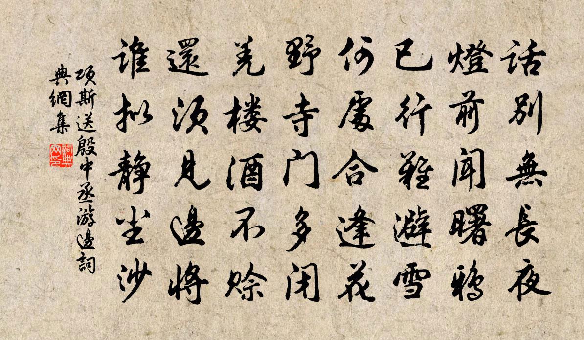 詩詞名句歷史字典書法欣賞書法字典國語詞典說文解字康熙字典古漢語字典標 題 作 者 詩 句 送殷中丞游邊作者:項斯 朝代:唐代送殷中丞游邊原文話別無長夜,燈前聞曙鴉。已行難避雪,何處合逢花。野寺門多閉,羌樓酒不賒。還須見邊將,誰擬靜塵沙。詩詞問答問:送殷中丞游邊的作者是誰?答:項斯問:送殷中丞游邊寫於哪個朝代?答:唐代問:送殷中丞游邊是什麼體裁?答:五律項斯送殷中丞游邊書法欣賞送殷中丞游邊書法作品注釋全唐詩:卷554-30詩詞推薦偈三首釋梵言〔宋代〕一生二,二生三,遏捺不住,廓周沙界。德靈直上妙峰,善財卻入樓閣。新婦騎驢阿家牽,山青水綠。桃華紅,李次韻和秀上人長安寺居言懷寄渚宮禪者鄭谷〔唐代〕舊齋松老別多年,香社人稀喪亂間。出寺只知趨內殿,閉門長似在深山。臥聽秦樹秋鍾斷,吟想荊江夕鳥還。唯恐睡起觀山楊萬里〔宋代〕過雨前汀未可登,搴篷小散睡瞢騰。船頭政好看山色,一點江風冷似冰。句高似孫〔宋代〕魚帶淞江月盈缶,雋處依稀開蟹斗。題李商叟半村壁徐照〔宋代〕一徑蒼苔合,連年不出門。風高松有韻,溪滿石無痕。不自知名重,令人覺有尊。更憂徵詔至,移室向深村。又用胡尉韻方岳〔宋代〕便覺尋春負一籌,老懷無復少年游。茶桑天似鵝黃酒,楊柳花飛狐白裘。試問獨醒觀眾醉,何如一笑失千憂。不知次韻曹實聽舅氏彈琴方岳〔宋代〕有客夜鼓龍門琴,風露漠漠侵秋庭。妙彈幽響落指外,此意難以兩耳聽。參橫斗轉四山寂,但聞別鶴之夜怨,離鸞詠梧桐詩沈約〔南北朝〕秋還遽已落。春曉猶未荑。微葉雖可賤。一剪或成珪。望後一日與客自水鄉登湘南月色佳甚翌日用鄉張栻〔宋代〕一雨五日余,南州三伏涼。喚客近方沼,笑潭引杯長。相將復登樓,月色在屋樑。念我懷百憂,忽忽發變蒼。及此雜興王冕〔元代〕蕭蕭白髮滿烏巾,不會趨時任客嗔。種菜每令除宿草,煮茶常自拾枯薪。屋頭流水濺濺響,溪上閒花樹樹春。寄語春雲韋莊〔唐代〕春雲春水兩溶溶,倚郭樓台晚翠濃。山好只因人化石,地靈曾有劍為龍。官辭鳳闕頻經歲,家住峨嵋第幾峰。王粲因痔痛徹心膂為詩李坤臣〔宋代〕吾道由來貫古今,纖毫不假外推尋。只因疾病呻吟切,識得平生第一心。酬刑部姚郎中馬戴〔唐代〕路歧人不見,尚得記心中。月憶瀟湘渚,春生蘭杜叢。鳥啼花半落,人散爵方空。所贈誠難答,泠然一榻風。浩歌吟邵雍〔宋代〕嘉善既難投,先生宜罷休。履霜猶可救,滅木更何求。獸困重來日,鴻飛遠去秋。民飢須是食,食外盡悠悠。憶金陵三首王安石〔宋代〕覆舟山下龍光寺,玄武湖畔五龍堂。想見舊時遊歷處,煙雲渺渺水茫茫。【正宮】黑漆弩_村居遣興長劉敏中〔元代〕村居遣興長巾闊領深村住,不識我喚作傖父。掩白沙翠竹柴門,聽徹秋來夜雨。閒將得失思量,往事水流東去。便頌十玄談塵異釋印肅〔宋代〕萬法泯時全體現,大似金剛經百練。定光溶爍絕纖埃,隻眼圓明何用見。送甥回崇仁李劉〔宋代〕萬里七年艱險同,我車西去子舟東。教兒強學先循理,嫁女隨宜莫諱窮。注就歐詩勤琢削,續成漢紀更磨礲。鄉人檉桐二首張明中〔宋代〕百花耐久說檉桐,選甚薰風秋雨中。誰道花無紅十日,此花日日醉潮紅。和耘老弟喜雪虞儔〔宋代〕天憐好景付君收,一笑春生紫綺裘。賦就兔園爭授簡,酒酣鯨海快吞舟。怪來柳絮穿簾額,舞上花裀襯襪鉤。畫餅名句推薦生怕見花開花落,朝來塞雁先還。辛棄疾《漢宮春·立春日》 聰明睿智,守之以愚李昉、李穆、徐鉉《太平御覽·文部·卷六》 堤上遊人逐畫船,拍堤春水四垂天。歐陽修《浣溪沙·堤上遊人逐畫船》 不知戒,後必有,恨後遂過不肯悔,讒夫多進荀子《荀子·成相》 危橋屬幽徑,繚繞穿疏林。柳宗元《巽公院五詠·苦竹橋》 英雄一去豪華盡,惟有青山似洛中。許渾《金陵懷古》 治國常富,而亂國常貧。管仲《管子·治國》 志以淡泊明,而節從肥甘喪矣。洪應明《菜根譚·概論》 尚憐終南山,回首清渭濱。杜甫《奉贈韋左丞丈二十二韻》 未羞他、雙燕歸來,畫簾半卷張炎《解連環·孤雁》
