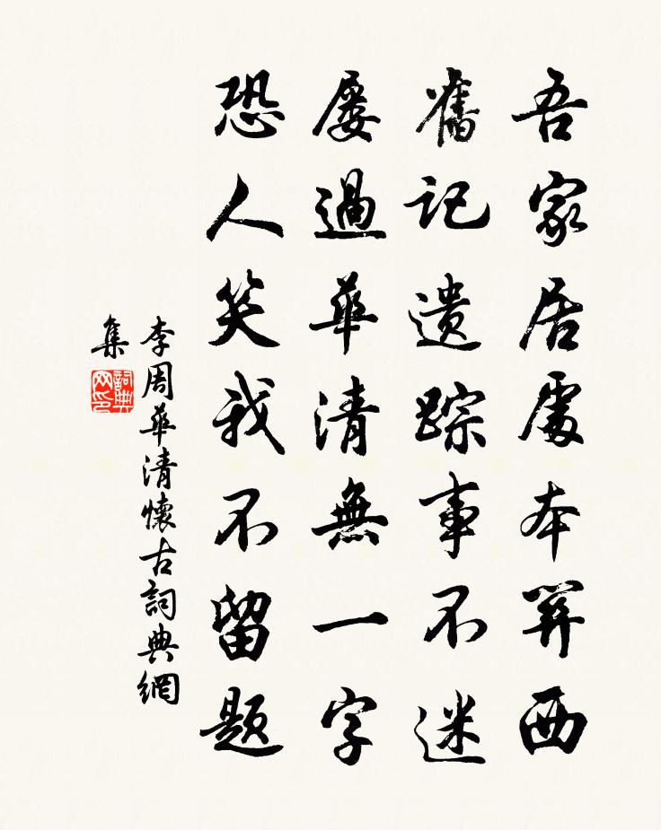 詩詞名句歷史字典書法欣賞書法字典國語詞典說文解字康熙字典古漢語字典標 題 作 者 詩 句 華清懷古作者:李周 朝代:宋代華清懷古原文吾家居處本關西,舊記遺蹤事不迷。屢過華清無一字,恐人笑我不留題。詩詞問答問:華清懷古的作者是誰?答:李周問:華清懷古寫於哪個朝代?答:宋代李周華清懷古書法欣賞華清懷古書法作品詩詞推薦西江月(以家事付兒曹,示之)辛棄疾〔宋代〕萬事雲煙忽過,一身浦柳先衰。而今何事最相宜。宜醉宜游宜睡。早趁催科了納,更量出入收支。乃翁依舊管些兒葉濤致遠見和二詩,複次其韻蘇軾〔宋代〕聞公少已悟,拄杖久倚床。笑我老而痴,負鼓欲求亡。庶幾東門子,柱史安敢望。嗜毒戲猛獸,慮患先不詳。囊破句鄭文寶〔宋代〕水暖鳧鷖和哺子,溪深桃李臥開花。題魚磯釋智愚〔宋代〕秋竿倚石台,沙鳥喑相猜。一草有時勸,幾朝魚不來。題武夷馬合麻〔宋代〕石鼓溪邊渡,門前一葉舟。雨滋千壑翠,風動萬岩秋。仙去雲常在。山空水自流,九天煩紫詔,借我此中游。演雅十章張至龍〔宋代〕飢鷹健搏兔,饞鷺勤捕魚。各為口腹累,不聞有騶虞。出郊再用韻賦三解吳潛〔宋代〕水聚山環旺氣連,榮華富貴各攙前。劫從無始認為我,數到有終還是天。曉月園林空唳鶴,晚風亭樹謾鳴蟬。寄言夜影黃庚〔宋代〕一池晴浸藕花月,午夜涼生菰葉風。風月無邊詩興動,品題收拾錦囊中。贈朱仁甫熊禾〔宋代〕吾宗賢叔父,窮壤一全人。欲義終取義,求仁果得仁。夜常形夢寐,晝亦想精神。寄語賢孫子,天知我一真。吳娘曲陸游〔宋代〕鏡奩蠶出千黑蟻,釵梁梅小雙青豆。吳娘十四未知愁,羅衣已覺傷春瘦。閒尋女伴過西家,鬥草歸來日未斜。睡睫丹霞忌日釋正覺〔宋代〕明月清風霽景涼,華鯨噴雪成茫茫。靈然一點誰人委,懷抱千年作夜光。聖人之孝十首顏子林同〔宋代〕返必展墓入,去當哭墓行。誰知顏氏子,事死乃如生。贈程君以忠楊君泰之方回〔宋代〕程君骨骼鼎鍾古,楊子精神霜月明。學海一針元自正,詞場百喙不能鳴。文潛雄渾開前路,無己深幽助晚成。老我吊靈均詞皎然〔唐代〕昧天道兮有無,聽汨渚兮躊躇。期靈均兮若存,問神理兮何如。願君精兮為月,出孤影兮示予。天獨何兮有君,君滿庭霜(再和)葛郯〔宋代〕歸去來兮,心空無物,亂山不鬥眉峰。夜禪久坐,窗曉日升東。已絕乘槎妄想,滄溪迥、不與河通。維摩室,從教題淨因院蘇軾〔宋代〕門外黃塵不見山,箇中草木亦常閒。履聲如渡薄冰過,催粥華鯨守夜蘭。城西射弓挺之以病不至簡示新詩有唯應欠我渭蔡襄〔宋代〕雪後西郊物外清,官閒乘興此閒行。出門疏樹無塵色,入內流渠帶野聲。近臘酒醪香更釅,得風弓箭力還生。知君驗漆趙蕃〔宋代〕好漆清如鏡,懸絲似釣鉤。撼動虎斑色,打著有浮漚。野籬仇遠〔宋代〕豆花小白槿花紅,野屋籬門處處同。無限春風桃李占,卻將顏色媚秋風。酒泉子·長憶觀潮潘閬〔宋代〕長憶觀潮,滿郭人爭江上望。來疑滄海盡成空。萬面鼓聲中。弄潮兒向濤頭立。手把紅旗旗不濕。別來幾向夢中看名句推薦唯仁者能好人,能惡人。孔子弟子《論語·雍也篇》 燕子欲歸時節,高樓昨夜西風。晏殊《破陣子·燕子欲歸時節》 殘日東風,不放歲華去。吳文英《祝英台近·除夜立春》 有真性情,須有真涵養:有大識見,乃有大文章。王永彬《圍爐夜話·第一六二則》 細草軟沙溪路、馬蹄輕。蘇軾《南歌子·寓意》 戒慎乎其所不睹,恐懼乎其所不聞。子思《禮記·中庸》 相顧無相識,長歌懷採薇。王績《野望》 深宮桃李無人問,舊愛玉顏今自恨。元好問《玉樓春·驚沙獵獵風成陣》 千嬌面、盈盈佇立,無言有淚,斷腸爭忍回顧。柳永《採蓮令·月華收》 居上不寬,為禮不敬,臨喪不哀,吾何以觀之哉?孔子弟子《論語·八佾篇》