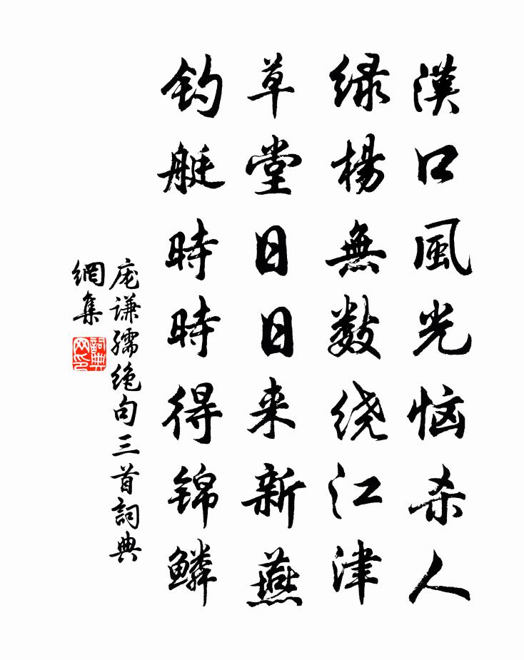 詩詞名句歷史字典書法欣賞書法字典國語詞典說文解字康熙字典古漢語字典標 題 作 者 詩 句 絕句三首作者:龐謙孺 朝代:宋代絕句三首原文漢口風光惱殺1/1人,綠楊無數繞江津。草堂日日來新燕,釣艇時時得錦鱗。詩詞問答問:絕句三首的作者是誰?答:龐謙孺問:絕句三首寫於哪個朝代?答:宋代龐謙孺絕句三首書法欣賞絕句三首書法作品詩詞推薦許國公生辰彭龜年〔宋代〕恭自內出,儉非外飾。恭儉而實,是之謂德。作德日休,心廣體逸。何以曰壽,由是而積。定風波(贈將)王質〔宋代〕問訊山東竇長卿。蒼蒼雲外且垂綸。流水落花都莫問,等取,榆林沙月靜邊塵。江面不如杯麵闊,捲起,五湖煙浪題達卿侄別墅劉克莊〔宋代〕吾門不幸去華亡,賴有高才出雁行。自擬退之稱稍黠,孰雲白也是陽狂。表阡鶴許儂歸老,飲硯虹為汝發祥。它日織婦釋智圓〔宋代〕九月風高未授衣,燈前軋軋夜鳴機。困來不覺支頤睡,鼠齧絲頭四散飛。次洪內相菊亭裘萬頃〔宋代〕詩仙種菊未多時,因菊名亭早有詩。欲為寒花標晚節,故將新句寄東籬。平生未省翻三峽,高處那能贊一辭。便得閶門初泛二十四韻范成大〔宋代〕好在馳煙路,平生載酒行。摧藏身久病,契闊歲頻更。昨夜燈花曉,今朝稻把晴。出門新夢境,觸目舊詩情。水遠頌古五十五首釋紹曇〔宋代〕苦戀京華一肯歸,行裝須待送窮時。茆舡寂寞煙汀月,別後何人更有詩。上元陳丞相宅觀燈有作方鳳〔宋代〕渴龍入夜吼百川,無數鮫珠迸地圓。星斗撼天半欲落,五花琪樹皆生煙。煙燈豈不勝花朵,踏歌何人增坎坷。風塵方氏墓廬扁曰白雲飛處薛嵎〔宋代〕諸峰互隱蔽,一望一增悲。觸目易成感,思親無盡時。松扉陰似雨,翁仲立如痴。出岫亦何意,悠然自不知。次韻題張氏耆逸堂汪炎昶〔宋代〕游左台天歲月深,人間又見謫仙人。鏡中商嶺飄蕭後,物外箕山自在身。安石沙徒輕冕紱,伏波老未厭風塵。輪君菩薩蠻(戲菱生)趙必〔宋代〕紅嬌翠溜歌喉急。舊弦撥斷新腔入。往事水東流。菱花曉帶秋。幃香雙鳳集。清淚層綃濕。殘夢五更頭。酒醒依舊梅梁歌周文璞〔宋代〕文命殿角東北左,上有梅梁鐵交鎖。傳聞舊時枝葉生,本質鱗身無不可。有時匹練離朱栱,歸帶濕萍光欲動。低頭又送陸潛夫茅山尋友皇甫冉〔唐代〕登山自補屐,訪友不齎糧。坐嘯青楓晚,行吟白日長。人煙隔水見,草氣入林香。誰作招尋侶,清齋宿紫陽。情詩其十八倉央嘉措〔清代〕仙羽如雪暫徘徊,欲將此身借翼載。不學令威控鶴去,理塘相見即歸來。和蕭伯和春輿楊萬里〔宋代〕只道韶華不到儂,不妨較日媚柔風。愁心自對春無味,老面可能花似紅。逢著詩狂兼酒聖,又忘人辰或天窮。聖人依韻釋道真〔宋代〕白壁雖然好丹青,無簡迷愚難悟醒。縱有百般僧氏巧,也有文徒書號名。空留佳妙不題宣,卻入五趣陷塵境。唯報代書抵筠守譚崧老求茶筍曾幾〔宋代〕問訊江南美,人推道院州。雨前收雀舌,雪底薦貓頭。有客同僧過,頻年遣仆求。故交今五馬,解送老龐不。次韻秋夜方岳〔宋代〕雨浥浮梁逗碧紗,短更催睡不停撾。一聲雁帶塞愁過,八月槎隨鄉信賒。別後故人頻入夢,秋來燕子已還家。相逢重九日登石閣三首邵雍〔宋代〕事出一時間,時過事莫還。當時深可愛,過後不堪看。夏去休言暑,冬來始講寒。人能知此理,憂患自難乾。詠史詩魯城胡曾〔唐代〕魯公城闕已丘墟,荒草無由認玉除。因笑臧孫才智少,東門鐘鼓祀鶢鶋。名句推薦圖未就之功,不如保已成之業洪應明《菜根譚·概論》 撩亂邊愁聽不盡,高高秋月照長城。王昌齡《從軍行七首》 賢能不待次而舉,罷不能不待須而廢,元惡不待教而誅,中庸民不待政而化荀子《荀子·王制》 幽蘭旋老,杜若還生,水鄉尚寄旅。吳文英《鶯啼序·春晚感懷》 露清枕簟藕花香,恨悠揚。顧敻《虞美人·觸簾風送景陽鍾》 四體不勤,五穀不分孔子弟子《論語·微子篇》 裊裊兮秋風,洞庭波兮木葉下。屈原《九歌·湘夫人》 兵不完利,與無操者同實管仲《管子·參患》 笑拈芳草不知名,乍凌波、斷橋西堍。吳文英《西子妝慢·湖上清明薄游》 雲山萬重兮歸路遐,疾風千里兮揚塵沙。蔡文姬《胡笳十八拍》