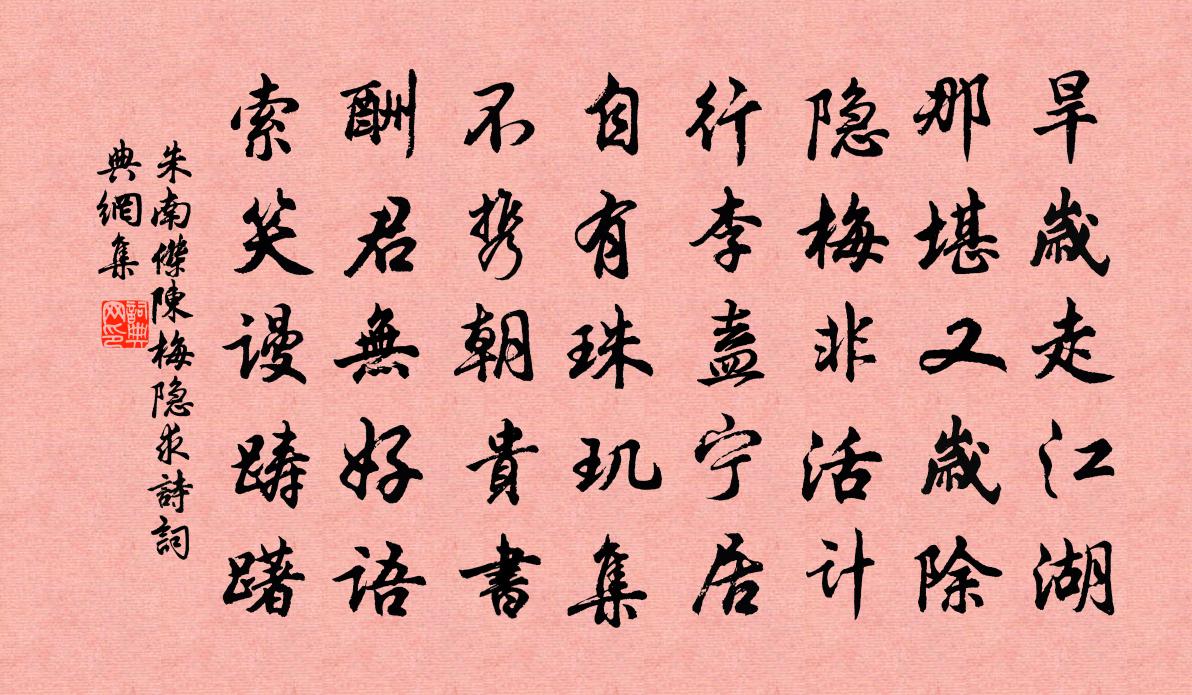 詩詞名句歷史字典書法欣賞書法字典國語詞典說文解字康熙字典古漢語字典標 題 作 者 詩 句 陳梅隱求詩作者:朱南傑 朝代:宋代陳梅隱求詩原文旱歲走江湖,那堪又歲除。隱梅非活計,行李盍寧居。自有珠璣集,不攜朝貴書。酬君無好語,索笑謾躊躇。詩詞問答問:陳梅隱求詩的作者是誰?答:朱南傑問:陳梅隱求詩寫於哪個朝代?答:宋代朱南傑陳梅隱求詩書法欣賞陳梅隱求詩書法作品詩詞推薦至後黃庚〔宋代〕道人坐茅宇,獨抱無弦琴。對此景物變,夕雲散還陰。雨氣一簾潤,雲意千山深。新陽暢微暄,疏花點孤林。芳時菩薩蠻毛滂〔宋代〕溪山不盡知多少。遙峰秀疊寒波渺。攜酒上高台。與君開壯懷。枉做悲秋賦。醉後悲何處。白髮幾黃花。官裘付酒書懷寄郭正宋祁〔宋代〕僑籍依三輔,愁顛遍二毛。星灰對遒盡,淚卷掩劬勞。並歡絲兼路,都捐筆與刀。思旌初不定,離緒僅堪繰。醜是泛富春江釋文珦〔宋代〕夢寐羊求客,清遊樂此邦。一篙殘臘雨,千古富春江。岸轉青螺合,煙明白鳥雙。洗除名利跡,灘瀨日春撞。送范仲訥往合肥三首 其一姜夔〔宋代〕壯志只便鞍馬上,客夢長到江淮間。誰能辛苦運河裡,夜與商人爭往還。一字至七字詩(賦得詩)白居易〔唐代〕詩。綺美,瑰奇。明月夜,落花時。能助歡笑,亦傷別離。調清金石怨,吟苦鬼神悲。天下只應我愛,世間唯有君建隆郊祀八首竇儼〔宋代〕在國南方,時維就陽。以祈帝祉,式致民康。豆邊鼎俎,金石絲簧。禮行樂奏,皇作無疆。彭澤山孔武仲〔宋代〕□磯環合辟鯨虬,白水如湯動地流。崖崿盡成斤斧跡,當年誰與化工謀。無題·昨夜星辰昨夜風李商隱〔唐代〕昨夜星辰昨夜風,畫樓西畔桂堂東。身無彩鳳雙飛翼,心有靈犀一點通。隔座送鉤春酒暖,分曹射覆蠟燈紅。嗟余襄陽寒食寄宇文籍竇鞏〔唐代〕煙水初銷見萬家,東風吹柳萬條斜。大堤欲上誰相伴,馬踏春泥半是花。十月初夢寄良嗣詩三句雲相思一載餘身共遠夢鄭剛中〔宋代〕武昌分別處,江岸倚籃輿。對飲三杯後,相思一載餘。身隨雲共遠,夢與汝同居。何日秋風夜,燈窗聽讀書。逢莊納因贈皇甫冉〔唐代〕世故還相見,天涯共向東。春歸江海上,人老別離中。郡吏名何晚,沙鷗道自同。甘泉須早獻,且莫嘆飄蓬。金剛隨機無盡頌法會因由分第一釋印肅〔宋代〕更上一層樓,清風似餌鉤。釺鱗吞不得,莫怪釣竿頭。次韻竹石亭陳著〔宋代〕卷收湖海入高懷,勘破人閒蛇影杯。老骨耐看寒後柏,古心相沃渴中梅。何妨風日同清美,不怕山雲礙往來。多少雨中葛天民〔宋代〕梅雨朝仍暮,蓮塘夏似秋。水高侵樹腳,屋漏滴人頭。歇書廚煙出,占晴礎汗收。群山思會面,扶病一登樓。偈頌七十六首釋子益〔宋代〕作家相見,啐啄尤乖。達士相逢,握鞭回首。撿點將來,已落第二。喜遷鶯·暑風涼月辛棄疾〔宋代〕謝趙晉臣敷文賦芙蓉詞見壽,用韻為謝。暑風涼月。愛亭亭無數,綠衣持節。掩冉如羞,參差似妒,擁出芙蓉花發三段石曾極〔宋代〕凜然皇象法書存,重屋應無野火焚。割據英雄餘一念,斷碑千載尚三分。陳平叔相從四年文行粹然臨分惠詩有立身行道周必大〔宋代〕好因輪斲悟觀書,莫守筌蹄覓兔魚。華岳登來卑步仞,滄溟浮罷眇支渠。命窮且戲娛親彩,道合須牽奉詔裾。此外題宇文叔昭閱齋名予所榜也有王正卿畫四時小李流謙〔宋代〕乾坤萍在江,日月蟻旋磨。吾生與化俱,反照若觀火。蠻觸鏖兩斗臼圈聽一簸。射鉤仍相國,嬖者死於餓。種瓜乃名句推薦遠與君別者,乃至雁門關。江淹《古離別》 微雨從東來,好風與之俱。陶淵明《讀山海經·其一》 凡人有疾,不時即治,隱忍冀差,以成痼疾。張仲景《傷寒論·傷寒例》 已訝衾枕冷,復見窗戶明。白居易《夜雪》 爭名者於朝,爭利者於市。劉向《戰國策·秦一·司馬錯與張儀爭論於秦惠王前》 漠漠秋雲起,稍稍夜寒生。白居易《微雨夜行》 窮不失義,達不離道。孟子《孟子·盡心章句上·第九節》 天無二日,人無二理。吳承恩《西遊記·第七十八回》 千里鶯啼綠映紅,水村山郭酒旗風。杜牧《江南春》 何人解賞西湖好,佳景無時。歐陽修《採桑子·何人解賞西湖好》