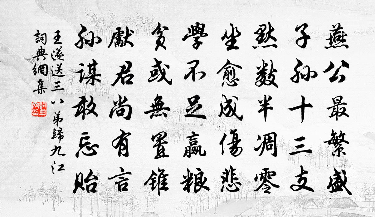 詩詞名句歷史字典書法欣賞書法字典國語詞典說文解字康熙字典古漢語字典標 題 作 者 詩 句 送三八弟歸九江作者:王遂 朝代:宋代送三八弟歸九江原文燕公最繁盛,子孫十三支。默數半凋零,坐愈成傷悲。學不足贏糧,貧或無置錐。先君尚有言,孫謀敢忘貽。詩詞問答問:送三八弟歸九江的作者是誰?答:王遂問:送三八弟歸九江寫於哪個朝代?答:宋代王遂送三八弟歸九江書法欣賞送三八弟歸九江書法作品詩詞推薦會稽頌嗣王諸葛興〔宋代〕肇三聖兮傳一中,建人極兮參洪蒙。元圭錫兮汝績,昭華歸兮汝躬。大道公兮均嬗繼,家天下兮繇姒氏。嵩石兮發東武吟曹鄴〔唐代〕心如山上虎,身若倉中鼠。惆悵倚市門,無人與之語。夜宴李將軍,欲望心相許。何曾聽我言,貪謔邯鄲女。獨上閏月李賀〔唐代〕帝重光,年重時。七十二候迴環推,天官玉管灰剩飛。今歲何長來歲遲,王母移桃獻天子,羲氏和氏迂龍轡。定風波(四·沈內翰宅百花堆)仲殊〔宋代〕南徐好,溪上百花堆。宴罷歌聲隨水去,夢回春色入門來。芳草遍池台。文彩動,奎璧爛昭回。玉殿儀刑推舊德,送鄭尚書守建安十首彭龜年〔宋代〕春來苦雪夏來寒,南去愁霖北去乾。又報豐年無一事,乞身遠去可能安。張兗下第隨桂陽喬監使之湘中楊億〔宋代〕建溪曾共聽猿聲,十載文場未策名。流落祇因孤劍在,窮愁已有二毛生。荊州暫去依劉表,漢殿無由薦馬卿。一路依韻李密學合流河口見懷梅堯臣〔宋代〕二水交流抱閭井,清潭幾曲自淵回。已浮畫舸遙遙去,更愛雙鷖泛泛來。瑞鶴仙哀長吉〔宋代〕天基佳節後。又詩詠嵩生,賢歌天佑。千齡運非偶。慶一堂風虎,雲龍感召,相門華胄。盛少屈、一錢太守。聽吏季永和詩索酒用韻送酒二首趙蕃〔宋代〕我貧無酒為君歡,渴夢相從碾鳳團。薄暮白衣才有饋,試令分減愧酸寒。偈六十三首釋道寧〔宋代〕遍界不曾藏,通身無影像。相逢莫訝太愚痴,曠劫至今無伎倆。無伎倆,少人知,大體還他肌骨好,何須照鏡畫娥楊花落楊巨源〔唐代〕北斗南回春物老,紅英落盡綠尚早。韶風澹蕩無所依,偏惜垂楊作春好。此時可憐楊柳花,滎盈艷曳滿人家。人家妻兄張伯高來訪橫河感舊與拜先君墓下有作次孫應時〔宋代〕衰年回首少年事,尚喜初心炯自如。俗態可憐人厚簿,交情那問勢親疏。懶陪康樂登山屐,且醉淵明採菊廬。一笑霜角 即霜天曉角 新安八景花屏春曉張可久〔元代〕初日滄涼。海霞搖曙光。幾折好山如畫,晴靄靄、郁蒼蒼。眾芳。雲景香。道人眠石床。喚起南華夢蝶,鶯啼在、詠史詩云夢胡曾〔唐代〕漢祖聽讒不可防,偽游韓信果罹殃。十處辛苦平天下,何事生擒入帝鄉?滄浪閣為王憲使賦劉黻〔宋代〕獨得蕭台趣,心清不受塵。我多臨水屋,誰是濯纓人。波渺涵天闊,沙渟印月真。忘機有鷗鷺,渾不厭相親。松阜弟於寶成寺祖墓之側營創別業為賦得閒亭薛嵎〔宋代〕陟巘心已清,復此風雨蔽。高人疏鑿余,理道頗超詣。卜築諧素志,緇侶欣共濟。修竹尚無恙,巢鶴亦數世。空山偈頌一百五十首釋心月〔宋代〕頻頻喚汝不歸家,貪向門前撮土沙。每天年年三月里,滿城開盡牡丹花。頌證道歌證道歌釋印肅〔宋代〕何表無生慈忍力,洞庭撞倒虛空吃。不留絲髮與人知,摩訶般若波羅蜜。裒集詩藁釋文珦〔宋代〕吾學本經論,上之契無為。書生習未忘,有時或吟詩。興到即有言,長簡訊所施。盡忘工與拙,往往不修辭。唯覺送鄱陽復道者釋智愚〔宋代〕相逢首人漆雙瞳,衣衫零落迎秋風。甘將百骸作泥土,冷笑萬事如展蓬。當今祖道薄如紙,瓦缶雷鳴鬧人耳。正音名句推薦東風靜、細柳垂金縷。万俟詠《三台·清明應制》 去年折贈行人遠,今年恨、依然縴手。吳文英《花心動·柳》 不語含嚬深浦里,幾回愁煞棹船郎,燕歸帆盡水茫茫。薛昭蘊《浣溪沙·紅蓼渡頭秋正雨》 淇園春竹美,軍宴日椎牛。司馬光《送龔章判官之衛州·新及第》 輪匠執其規、矩,以度天下之方圓墨子《墨子·天志(上)》 豈曰無衣?與子同袍。佚名《秦風·無衣》 箭徑酸風射眼,膩水染花腥。吳文英《八聲甘州·靈岩陪庾幕諸公游》 一切法無我無人無眾生無壽者。鳩摩羅什譯《金剛經·究竟無我》 清明時節雨聲嘩。潮擁渡頭沙。張炎《朝中措·清明時節》 衰楊古柳,幾經攀折,憔悴楚宮腰柳永《少年游·參差煙樹灞陵橋》