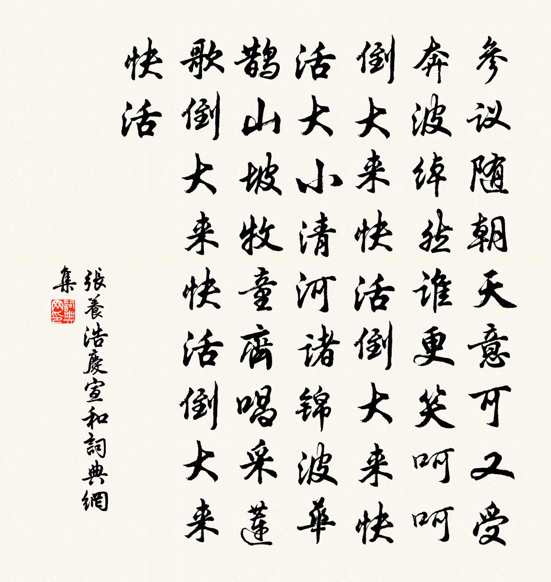 參議隨朝天意可,又受奔波,綽然誰更笑呵呵。倒大來快活,倒大來快活。大小清河諸錦波,華鵲山坡,牧童齊唱採蓮歌。倒大來快活,倒大來快活。