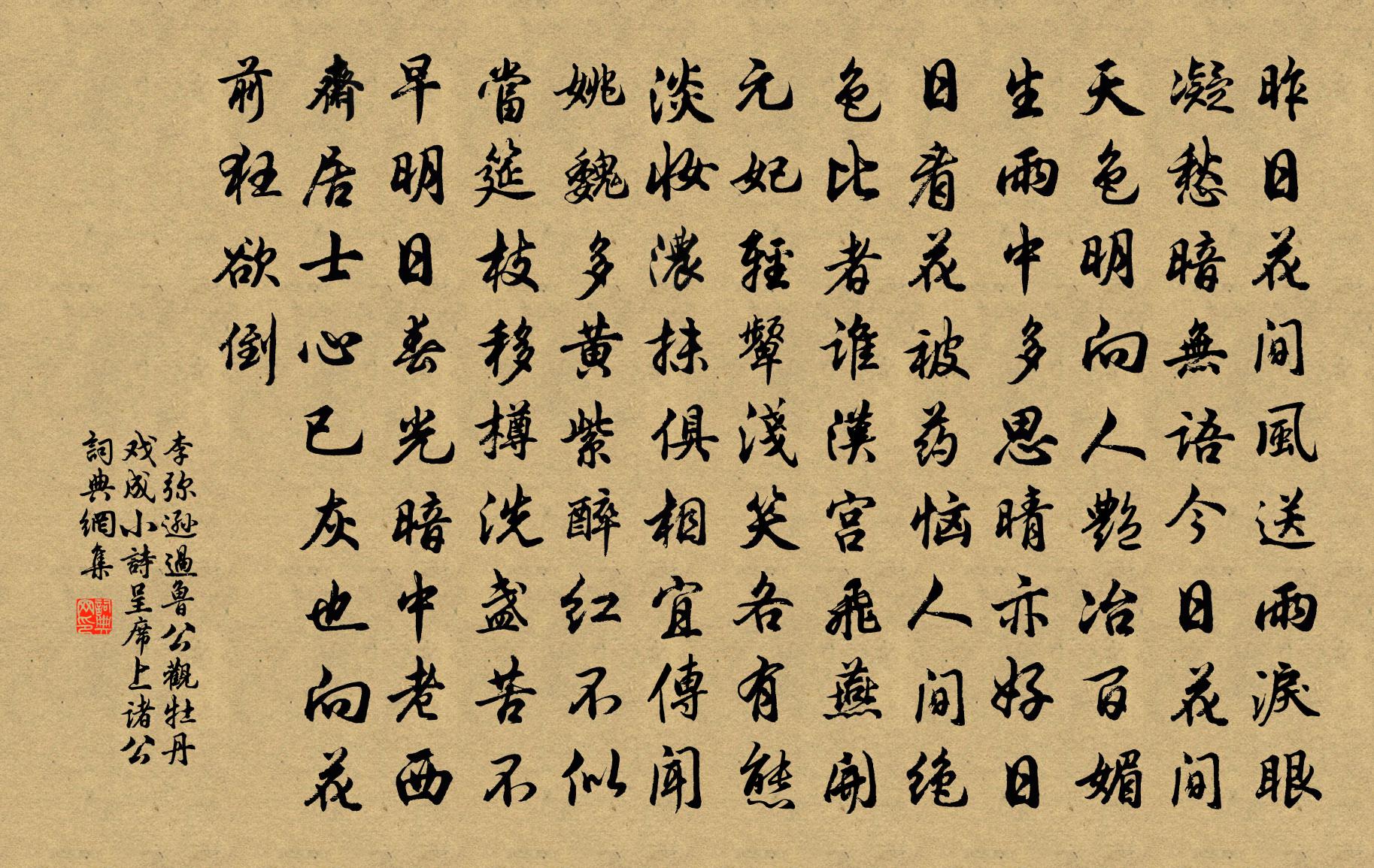 詩詞名句歷史字典書法欣賞書法字典國語詞典說文解字康熙字典古漢語字典標 題 作 者 詩 句 過魯公觀牡丹戲成小詩呈席上諸公作者:李彌遜 朝代:宋代原文昨日花間風送雨,淚眼凝愁暗無語。今日花間天色明,向人艷冶百媚生。雨中多思晴亦好,日日看花被藥惱。人間絕色比者誰,漢宮飛燕開元妃。輕顰淺笑各有態,淡妝濃抹俱相宜。傳聞姚魏多黃紫,醉紅不似當筵枝。移樽洗盞苦不早,明日春光暗中老。西齋居士心已灰,也向花前狂欲倒。詩詞問答問:《過魯公觀牡丹戲成小詩呈席上諸公》的作者是誰?答:李彌遜問:該詩寫於哪個朝代?答:宋代書法欣賞過魯公觀牡丹戲成小詩呈席上諸公書法作品詩詞推薦送顧渚茶與孔純老王之道〔宋代〕曉來飛雪似欺春,盡把群芳點綴勻。莫訝兩旗分顧渚,要令佳句斗清新。鷓鴣天周紫芝〔宋代〕年少登高意氣多。黃花壓帽醉嵯峨。如今滿眼看華發,強拈茱萸奈老何。千壘岫,萬重波。一時分付與秦娥。明年感秋宋祁〔宋代〕迴腸病骨兩驚秋,已作衰翁未白頭。天上有星寧免客,人間無地可埋憂。車翻落日何曾定,臂化鳴鴞豈易求。莫就均台辭二首陳與義〔宋代〕小桃借春春已來,平分和氣入均台。夜來台邊草環綠,今朝芒生滿三木。街頭拍手鬧千兒,齊唱中和宣布曲。使君紅樓夢十二曲——晚韶華曹雪芹〔清代〕鏡里恩情,更那堪夢裡功名!那美韶華去之何迅,再休提繡帳鴛衾。只這戴朱冠披鳳襖,也抵不了無常性命。雖說嚴衢道中朱繼芳〔宋代〕草白三丫路,苔青五里牌。長年畫馬客,幾兩利名鞋。斗糴隨時貴,方言到處乖。近山樵有主。童稚拾松釵。句楊蟠〔宋代〕三峽江聲流筆下,六朝山影滿樽前。水龍吟李孝光〔元代〕舉頭 * 明,五雲飄作天花雨。龜游蓮葉,鶴棲松頂,□□□露。阿母瑤池,瓊花新好,正逢初度。對碧梧翠竹送朱先輩尉廬陵徐鉉〔唐代〕我重朱夫子,依然見古人。成名無愧色,得祿及慈親。莫嘆官資屈,寧論活計貧。平生心氣在,終任靜邊塵。道山座主先生平章呂公輓歌辭五首方回〔宋代〕大別登秋興,南樓望戰塵。興亡元有數,生死不無神。將相名千古,兒孫近百人。生靈活億萬,報豈止公身。明州觀大閱劉過〔宋代〕書生燈窗困毛錐,說著刀劍何時持。忽聞殷殷金鼓震,驚起塊坐筋骸衰。國朝右武重秋獮,列郡敢不張其威。萬家齊天樂蔣捷〔宋代〕銀蟾飛到觚稜外。娟娟下窺龍尾。電紫鞘輕,雲紅筤曲,雕玉輿穿燈底。峰繒岫綺。沸一簇人聲,道隨竿媚。侍女自仙潭治歸舟呈王鷗盟楊冠卿〔宋代〕江村煙雨暗霏微,正是鷗盟得句時。雨後屏山展新綠,更煩摹寫送新詩。採桑子納蘭性德〔清代〕彤霞久絕飛瓊字,人在誰邊。人在誰邊,今夜玉清眠不眠。香銷被冷殘燈滅,靜數秋天。靜數秋天,又誤心期到下謹所之贈王氏子陳淳〔宋代〕我贈王氏子,作此謹所之。之子何所喜,喜有近道資。妙齡正弱冠,立志已不卑。與之語則解,知弗流俗隨。今聞句唐彥謙〔唐代〕獨來成悵望,不去泥欄乾。述懷釋行海〔宋代〕山郡人來水郡游,雁驚秋色向南州。日長意懶無消遣,醉劈芙蓉付水流。望江南/憶江南董乂〔宋代〕縹緲煙中漁父槳,坡陀山上使君衙。雜詩王令〔宋代〕一日不為田,百草已有根。況復閒三時,其穢何待論。豈不有錢鎛,徒羞慵借勤。歲晚憂不耕,何獨議鋤耘。南陽廣文欲於荊襄卜居因而有贈皮日休〔唐代〕地脈從來是福鄉,廣文高致更無雙。青精飯熟雲侵灶,白礻劫裘成雪濺窗。度日竹書千萬字,經冬朮煎兩三缸。鱸名句推薦池塘生春草,園柳變鳴禽。謝靈運《登池上樓》 諫爭輔拂之人,社稷之臣也,國君之寶也,明君之所尊厚也荀子《荀子·臣道》 縱被春風吹作雪,絕勝南陌碾成塵。王安石《北陂杏花》 因人成事,其功不難。魏徵《隋書·列傳·卷七》 凡兵有四機:一曰氣機,二曰地機,三曰事機,四曰力機。吳起《吳子·論將》 醉後滿身花影、倩人扶。晏幾道《虞美人·疏梅月下歌金縷》 雞肋,棄之如可惜,食之無所得陳壽《三國志·魏書·武帝紀》 一身虜雲外,萬里胡天西。岑參《早發焉耆懷終南別業》 試上超然台上看,半壕春水一城花。蘇軾《望江南·超然台作》 醉翁之意不在酒,在乎山水之間也。歐陽修《醉翁亭記》