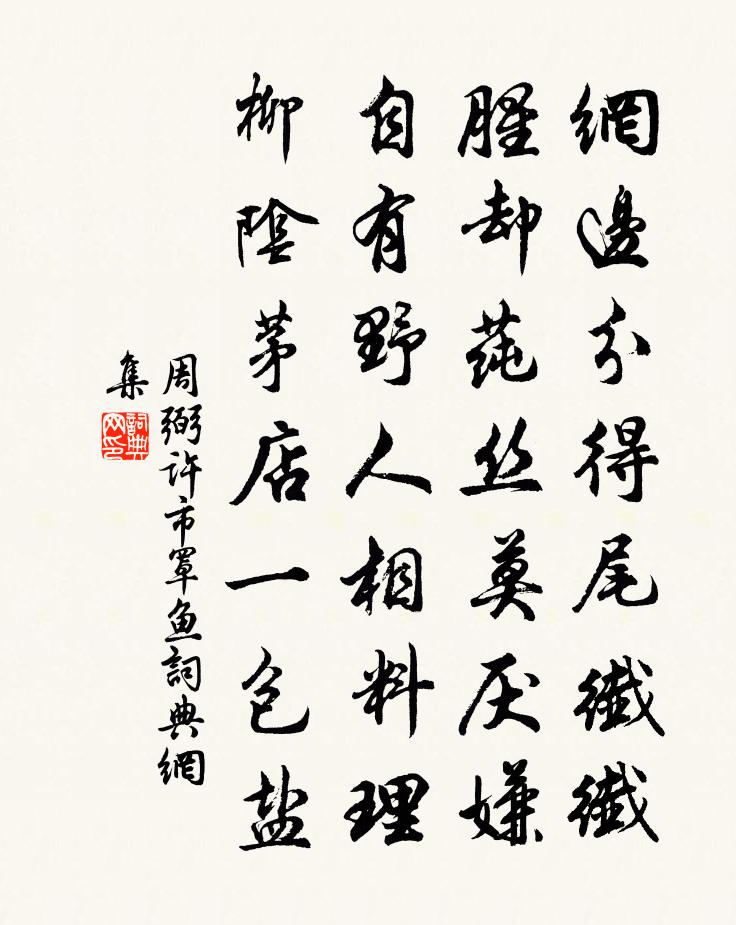 詩詞名句歷史字典書法欣賞書法字典國語詞典說文解字康熙字典古漢語字典標 題 作 者 詩 句 許市罩魚作者:周弼 朝代:宋代許市罩魚原文網邊分得尾纖纖,腥卻蓴絲莫厭嫌。自有野人相料理,柳陰茅店一包鹽。詩詞問答問:許市罩魚的作者是誰?答:周弼問:許市罩魚寫於哪個朝代?答:宋代周弼許市罩魚書法欣賞許市罩魚書法作品詩詞推薦春日思舊遊寄南徐從事劉三復許渾〔唐代〕風暖曲江花半開,忽思京口共銜杯。湘潭雲盡暮山出,巴蜀雪消春水來。懷玉尚悲迷楚塞,捧金猶羨樂燕台。薊門懷龔山人聖予方鳳〔宋代〕西北有傑閣,岧嶢切雲天。綺窗通四望,綽約流蘇懸。中有絕代人,端居方盛年。被服既殊眾,容采亦鮮妍。瑤床頌古一○一首釋子淳〔宋代〕瑞丱叢中懶欲眠,徐行處處迥翛然。披毛戴角人雖識,為報芒童不用鞭。菊花十二首史鑄〔宋代〕露裛幽花泠自香,藥 * 效不尋常。祛風偏重山泉嘖,胡廣隨緣卻壽長。和長兄席間書事廖行之〔宋代〕窮山二月無多樂,猶作春來料峭寒。常恐花枝暗蕭索,卻教詩句漫艱難。尋芳賴有城西角,泥飲休論日幾竿。他日踏莎行李朝卿〔宋代〕月掛瓊鉤,日添繡線。騎花翻浪重簾卷。風傳環珮曉珊珊,畫堂羯鼓催開宴。翠縷香凝,玉膏酒灩。仙翁莫訴玻璃出遊陸游〔宋代〕儘道衰翁嬾,乘閒亦出門。修琴來竹院,采藥宿山村。雪路鳴長耳,煙堤駕獨轅。殘年常自在,何以報君恩。寄滿子權王令〔宋代〕子權今謂何,又不治簡書。子素賜我多,豈以此遂疏。予亦如常時,病與貧相俱。冉冉草沒階,客腳不踏廬。貴者寄答周協律 來詩多敘蘇州舊遊。白居易〔唐代〕故人敘舊寄新篇,惆悵江南到眼前。暗想樓台萬餘里,不聞歌吹一周年。橋頭誰更看新月,池畔猶應泊舊船。最憶惡神行雨姚合〔唐代〕凶神扇其矢惡神行,洶湧挨排白霧生。風擊水凹波撲凸,雨漴山口地嵌坑。龍噴黑氣翻騰滾,鬼掣紅光劈劃揁。哮寄示兒孫翁承贊〔唐代〕力學燒丹二十年,辛勤方得遇真仙。便隨羽客歸三島,旋聽霓裳適九天。得路自能酬造化,立身何必戀林泉。予家重陽寄雪窗從叔樓鑰〔宋代〕秋意未教籬菊知,不妨烏帽著風吹。絕憐對酒君歸矣,更欲登高誰共之。風雨滿城千里夢,茱萸綴席一年期。君非滿江紅張昪〔宋代〕無利無名,無榮無辱,無煩無惱。夜燈前、獨歌獨酌,獨吟獨笑。況值群山初雪滿,又兼明月交光好。便假饒百歲臨江仙滕宗諒〔宋代〕湖水連天天連水,秋來分外澄清。君山自是小蓬瀛。氣蒸雲夢澤,波撼岳陽城。帝子有靈能鼓瑟,悽然依舊傷情。四安道中所見牟巘五〔宋代〕每羨向平婚嫁了,恣游五嶽可曾回。也應未斷塵緣在,依舊挑包科浙來。朱清之薛師石〔宋代〕漈水日夜白,之人信所宜。隱於陶令酒,甘謝郗詵枝。江渡月偏滿,家庭歲有規。不知君沒後,誰主菊花期。贈淨因臻長老蘇轍〔宋代〕十方老僧十年舊,燕坐繩床看奔走。遠遊新自濟南來,滿身自覺多塵垢。暖湯百斛勸我浴,驪山袞袞泉傾竇。明窗叢菊石延年〔宋代〕風勁香逾遠,天寒色更鮮。秋天買不斷,無意學金錢。和毛君新葺囷庵船齋蘇轍〔宋代〕厭居華屋住東庵,真味全勝食薺甘。多病維摩長隱几,無心彌勒便同龕。誤游田舍空成笑,謬入僧房即欲參。風霽秋風函谷應詔徐賢妃〔唐代〕秋風起函谷,勁氣動河山。偃松千嶺上,雜雨二陵間。低雲愁廣隰,落日慘重關。此時飄紫氣,應驗真人還。名句推薦楝花飄砌。蔌蔌清香細。謝逸《千秋歲·詠夏景》 凌晨過驪山,御榻在嵽嵲杜甫《自京赴奉先縣詠懷五百字》 玉容寂寞淚闌乾,梨花一枝春帶雨。白居易《長恨歌》 早歲那知世事艱,中原北望氣如山。陸游《書憤五首·其一》 謙尊而光,卑而不可逾,君子之終也。佚名《易傳·彖傳上·謙》 燈前目力雖非昔,猶課蠅頭二萬言。陸游《讀書》 如來說諸心皆為非心是名為心。鳩摩羅什譯《金剛經·一體同觀》 夜雨滴空階,孤館夢回,情緒蕭索。柳永《尾犯·夜雨滴空階》 霸圖今已矣,驅馬復歸來。陳子昂《燕昭王》 燕子巢方就,盆池小,新荷蔽。杜安世《鶴沖天·清明天氣》