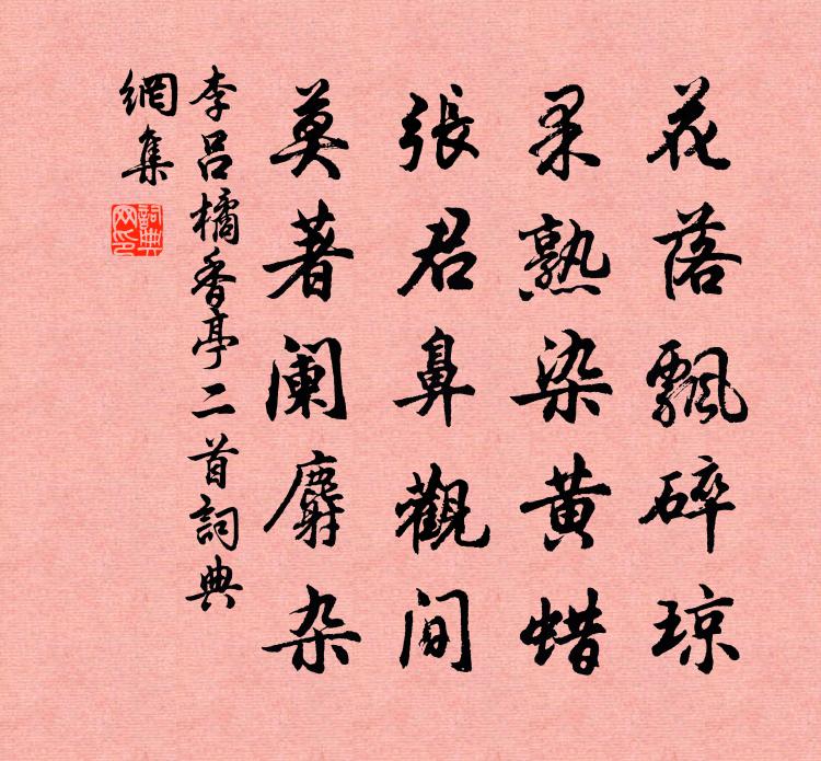 詩詞名句歷史字典書法欣賞書法字典國語詞典說文解字康熙字典古漢語字典標 題 作 者 詩 句 橘香亭二首作者:李呂 朝代:宋代橘香亭二首原文花落飄碎瓊,果熟染黃蠟。張君鼻觀間,莫著闌麝雜。詩詞問答問:橘香亭二首的作者是誰?答:李呂問:橘香亭二首寫於哪個朝代?答:宋代李呂橘香亭二首書法欣賞橘香亭二首書法作品詩詞推薦石竹張嵲〔宋代〕石竹為花品最微,當時曾入謫仙詩。新葩競發迷形似,紫蝶翩翾綴碧枝。梁文靖南安漳岩泉福三帖贊岳珂〔宋代〕詞真意浹,不屈不狎,端重有法。此近世名臣之帖。承平流風,尚或可接,予欲以此觀相業。太常引 鳴鶴餘音卷之四譚處端〔元代〕非僧非俗亦非仙。茅屋兩三椽。白石與清泉。更誰問、桃源洞天。一爐寶篆,一甌春雪,澆灌淨三田。閒想穀神篇陪五馬勸農岩山晚會桃花塢陳棣〔宋代〕晚參旌騎勸農回,賞遍郊原錦繡堆。掠面快風吹酒去,逼人疏雨送詩來。鳴鳩乳燕數聲好,艷粉夭桃一笑開。欲遣施崇寧寺馬蘇轍〔宋代〕南歸閉門萬事了,病臥常多起常少。未用田間下澤車,何須櫪上追風驃。鄉人記我少年日,滇馬為致風前鳥。三年白牙青賈似道〔宋代〕紫頭銀線項青毛,銀牙白腳絕倫高。可奈秋風消索處,自然勇力不相饒。室思徐幹〔魏晉〕浮云何洋洋,願因通我辭。飄搖不可寄,徙倚徒相思。人離皆復會,君獨無返期。自君之出矣,明鏡暗不治。思君紹興以後祀五方帝六十首佚名〔宋代〕惟時素秋,肇舉元祀。禮備樂作,降登有數。洋洋在上,神既來止。神之格思,錫我繁祉。宿南洲浦詩何遜〔南北朝〕幽棲多暇豫。從役知辛苦。解纜及朝風。落帆依暝浦。違鄉已信次。江月初三五。沉沉夜看流。淵淵朝聽鼓。霜洲送趙安仁之官上虞二首戴復古〔宋代〕遠庵家學在,持此去為官。冰雪吾身白,風霜吏膽寒。一心毋妄用,百姓自相安。賢者妙為政,誰言宰劇難。西園堂榭落成種植畢工偶成口號十首呈參政張周麟之〔宋代〕遁叟高眠石磴雲,鴟夷長泛五湖春。爭如晝錦延華萼,同作商山四老人。挽伯父二首洪咨夔〔宋代〕白髮兒隨母,蒼顏弟對兄。四休元易足,一笑更何營。論事絲弦直,存心鏡面平。德人今已矣,誰與嗣鄉評。題龍陽縣青草湖唐溫如〔唐代〕西風吹老洞庭波,一夜湘君白髮多。醉後不知天在水,滿船清夢壓星河。和僕射牛相公寓言二首劉禹錫〔唐代〕兩度竿頭立定夸,回眸舉袖拂青霞。盡拋今日貴人樣,復振前朝名相家。御史定來休直宿,尚書依舊趁參衙。具瞻晚次東亭獻鄭州宋使君文儲光羲〔唐代〕自初賓上國,乃到鄒人鄉。曾點與曾子,俱升闕里堂。武皇恢大略,逸翮思寥廓。三居清憲台,兩拜文昌閣。為道南中客舍對雨送故人歸北長孫佐輔〔唐代〕猿聲啾啾雁聲苦,捲簾相對愁不語。幾年客吳君在楚,況送君歸我猶阻。家書作得不忍封,北風吹斷階前雨。舟次吳興二首林景熙〔宋代〕釣舟遠隔菰蒲雨,酒幔輕飄菡萏風。彷佛層城鰲背上,萬家簾幕水晶宮。和劉後村梅花百詠方蒙仲〔宋代〕三的朝露借恩光,剩種江梅作洞房。待得百年俱玉雪,冷官亦自有甘棠。游西源喻良能〔宋代〕萬里西源路,秋風屐齒鳴。嶙峋千障碧,窈窕一川清。天柱雲霄迥,香爐霧靄輕。何當攜翠袖,重遣酒壺傾。句鄭清之〔宋代〕他年蒙渥澤,方玉帶圍赬。名句推薦盧家少婦鬱金堂,海燕雙棲玳瑁梁。沈佺期《古意呈補闕喬知之 / 古意 / 獨不見》 鴻雁在雲魚在水。惆悵此情難寄。晏殊《清平樂·紅箋小字》 晝短苦夜長,何不秉燭游!佚名《生年不滿百》 貨有高低三等價,客無遠近一般看吳承恩《西遊記·第八十四回》 天公見玉女,大笑億千場。李白《短歌行》 鳥向檐上飛,雲從窗里出。吳均《山中雜詩》 文章合為時而著,歌詩合為事而作。白居易《與元九書》 一日不見,如三月兮。佚名《子衿》 九月九日眺山川,歸心歸望積風煙。盧照鄰《九月九日玄武山旅眺》 若說沒奇緣,今生偏又遇著他,若說有奇緣,如何心事終虛化?曹雪芹《紅樓夢·第五回》