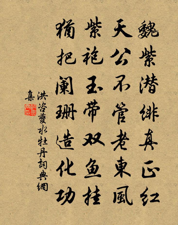 詩詞名句歷史字典書法欣賞書法字典國語詞典說文解字康熙字典古漢語字典標 題 作 者 詩 句 水牡丹作者:洪咨夔 朝代:宋代水牡丹原文魏紫潛緋真正紅,天公不管老東風。紫袍玉帶雙魚掛,猶把闌珊造化功。詩詞問答問:水牡丹的作者是誰?答:洪咨夔問:水牡丹寫於哪個朝代?答:宋代洪咨夔水牡丹書法欣賞水牡丹書法作品詩詞推薦畏人杜甫〔唐代〕早花隨處發,春鳥異方啼。萬里清江上,三年落日低。畏人成小築,褊性合幽棲。門徑從榛草,無心走馬蹄。宜樓晚望錢時〔宋代〕宜樓望芝山,淺淺平林出。芝山望宜樓,隱隱蒼龍脊。樓中妙景山不知,山外有山樓不宜。老眼西風沒疆界,一時初授拾遺白居易〔唐代〕奉詔登左掖,束帶參朝議。何言初命卑,且脫風塵吏。杜甫陳子昂,才名括天地。當時非不遇,尚無過斯位。況余曲廊張鎡〔宋代〕曲廊桐樹綠陰陰,檐佩風來奏玉琴。但有疎簾知獨立,更無塵事惱閒心。雪霜鬢畔誰能免,城府胸中枉自深。二六秋野即事釋文珦〔宋代〕深原草徑斜,煙際兩三家。老屋門無鑰,清溪底見沙。斷蟬嘶敗柳,孤蝶巒寒花。歷省曾游處,分明似若耶。樂隱君輓詩魏了翁〔宋代〕人畸天則偶,俗隘我常優。謾道蚿憐鱉,終成鵲避鳩。蹇驢花露曉,孤雁稻雲秋。想見招魂曲,人人說少游。與李潭州椿壽翁五首趙蕃〔宋代〕萬進沅湘路,千年賈屈文。跡同探禹穴,心每望堯雲。未說渺茫隱,長思矍鑠勛。不應迷出處,四十畏無聞。游翟園三首楊萬里〔宋代〕花枝劣相絓人衣,蜂子顛狂觸麵皮。一巷海棠千架錦,兩堤楊柳萬窩絲。舊作感懷宗澤〔宋代〕關中黃壤黑壤,大是邦家利源。古者畝收十一,誰興歲取十千。不用府無虛月,藏之斯民裕然。宿水閣許渾〔唐代〕野客從來不解愁,等閒乘月海西頭。未知南陌誰家子,夜半吹笙入水樓。舟中雨夜白居易〔唐代〕江雲暗悠悠,江風冷修修。夜雨滴船背,夜浪打船頭。船中有病客,左降向江州。續嘉陵驛詩獻武相國薛濤〔唐代〕蜀門西更上青天,強為公歌蜀國弦。卓氏長卿稱士女,錦江玉壘獻山川。自用前韻司馬光〔宋代〕耿耿官不成,迢迢夜未闋。良朋梅不留,負此當軒月。懷想空鬱陶,眺聽轉清絕。他時重見過,余樽猶可潔。偈頌一百一十七首釋紹曇〔宋代〕示大家身,為帝王母。與佛同生,福兼寰宇。萬國歡悰慶誕彌,蟠桃何止宴瑤池。秋日王銍〔宋代〕半落庭前葉,始知秋意新。風嚴柳疏細。霜薄水清勻。句裹存佳景,詩成題未有,翰墨伴清閒。送蜀僧周賀〔唐代〕萬里獨行無弟子,惟齎筇竹與檀龕。看經更向吳中老,應是山川似劍南。寄飛卿魚玄機〔唐代〕階砌亂蛩鳴,庭柯煙露清。月中鄰樂響,樓上遠山明。珍簟涼風著,瑤琴寄恨生。嵇君懶書札,底物慰秋情。答黃府女孫潘用中〔宋代〕一曲臨風值萬金,如何難買玉人心。君如解得相如意,比似金徽恨更深。減字木蘭花王觀〔宋代〕才鳴□鼓。曲奏仙音如樂府。美似梨園。一派簫韶列玳筵。使人清耳。滿塵賓朋皆歡喜。勸飲金荷。祝壽延長福更觀劉元忠小鬟舞梅堯臣〔宋代〕桃小未開春意濃,梢頭綠葉映微紅。君家歌管相催急,枝弱不勝花信風。名句推薦蔞蒿滿地蘆芽短,正是河豚欲上時。蘇軾《惠崇春江晚景 / 惠崇春江曉景》 自恨枝無葉,莫怨太陽偏。佚名《增廣賢文·上集》 為君憔悴盡,百花時。溫庭筠《南歌子·倭墮低梳髻》 松竹翠蘿寒,遲日江山暮。曹組《卜運算元·蘭》 眾中聞謦欬,未語知鄉里。蘇軾《送金山鄉僧歸蜀開堂》 好水好山看不足,馬蹄催趁月明歸。岳飛《池州翠微亭》 寒夜客來茶當酒,竹爐湯沸火初紅。杜耒《寒夜》 飄零疏酒盞,離別寬衣帶。秦觀《千秋歲·水邊沙外》 繁華事散逐香塵,流水無情草自春。杜牧《金谷園》 雙星良夜,耕慵織懶,應被群仙相妒。范成大《鵲橋仙·七夕》