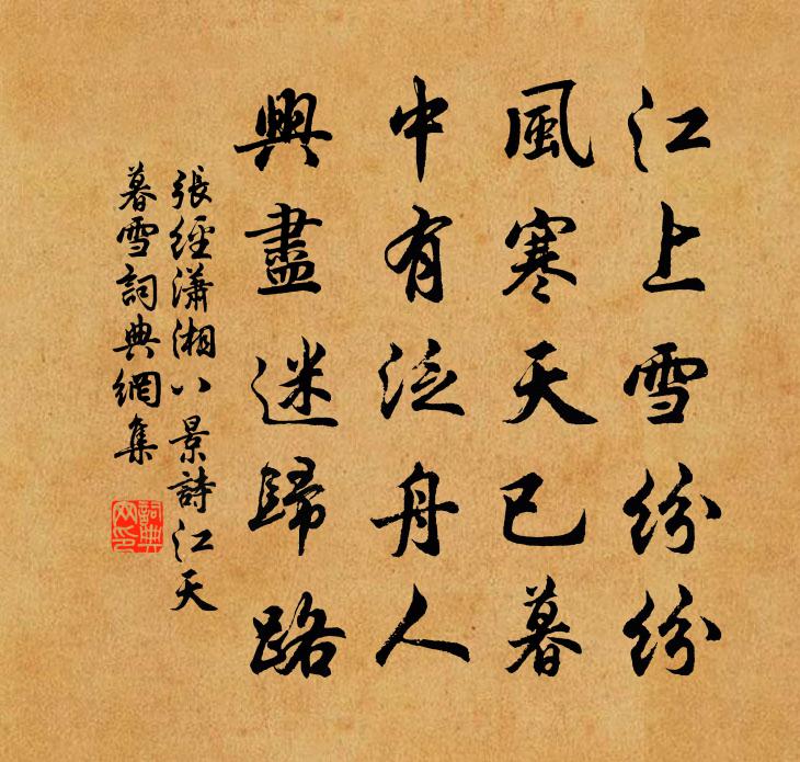 詩詞名句歷史字典書法欣賞書法字典國語詞典說文解字康熙字典古漢語字典標 題 作 者 詩 句 瀟湘八景詩江天暮雪作者:張經 朝代:宋代瀟湘八景詩江天暮雪原文江上雪紛紛,風寒天已暮。中有泛舟人,興盡迷歸路。詩詞問答問:瀟湘八景詩江天暮雪的作者是誰?答:張經問:瀟湘八景詩江天暮雪寫於哪個朝代?答:宋代張經瀟湘八景詩江天暮雪書法欣賞瀟湘八景詩江天暮雪書法作品詩詞推薦酬樂天嘆損傷見寄元稹〔唐代〕前途何在轉茫茫,漸老那能不自傷。病為怕風多睡月,起因花葯暫扶床。函關氣索迷真侶,峽水波翻礙故鄉。唯有小雪戴叔倫〔唐代〕花雪隨風不厭看,更多還肯失林巒。愁人正在書窗下,一片飛來一片寒。送劉燁大著移任龍門知縣魏野〔宋代〕天上書先夢裡傳,到施仁政減春寒。尚虛鰲嶺神仙任,暫作龍門父母官。愁悶豈惟增假寐,笑談直恐絕真歡。不緣阮郎歸吳潛〔宋代〕軟風輕靄弄晴暉。鵓鳩相應啼。畫堂人靜畫簾垂。闌乾獨倚時。閒拾句,困尋棋。沈吟心是非。荼開遍柳花飛。惜再用前韻答繼周丈二首王炎〔宋代〕士女春遊喜得晴,焚香燕坐太清生。繞枝烏鵲如要語,排闥青山不待迎。倦客琴書來寓處,前人杖屨昔經行。平生三秦民謠佚名〔先秦〕武功太白,去天三百。孤雲兩角,去天一握。山水險阻,黃金子午。蛇盤鳥櫳,勢與天通。賀權郡雨應禱陳宓〔宋代〕衡山開霽雨迴風,正直心期自感通。頓使沾濡千里足,都由精白寸誠中。誰知憂國丹心在,不與農夫喜色同。四海無盡藏齋王洋〔宋代〕矯首層霄俯翠巒,虛空不住骨毛寒。古今等是無窮境,風月何嫌取意看,巢寄一枝惟自足。風摶九萬豈知難,與君失調名蘇軾〔宋代〕揭起裙兒,一陣油鹽醬醋香。偈頌二十四首釋智遇〔宋代〕人間無,天上有,往往無人脫窠臼。四海娟娟洗玉魂,九野茫茫白兔走。寒山子,不關口,也落馬駒群隊後。秋浦歌十七首李白〔唐代〕秋浦長似秋,蕭條使人愁。客愁不可度,行上東大樓。正西望長安,下見江水流。寄言向江水,汝意憶儂不。遙傳仙跡岩辛棄疾〔宋代〕地秘岩藏骨,谿靈膝印痕。虛床惟太姥,別席盡曾孫。披牒秦朝遠,遺壇漢祀存。何時幔亭側,重複見幢幡。仙塘茅舍利登〔宋代〕莫言賓客少,幽僻長莓苔。也有樵人到,唯無詩士來。山風花落盡,溪雨燕飛回。又覺年光暮,庭陰滿綠槐。冬夜宿仙遊寺南涼堂,呈謙道人岑參〔唐代〕太乙宮連太白,宮兩山知幾宮重。路盤宮石門窄,匹馬行才通。日西倒山寺,林下逢支公。昨夜山北時,星星聞此送孟湘虞部赴闕祖無擇〔宋代〕科名拾芥職三虞,落落雄才與眾殊。為政人驚今遂霸,論兵自比古孫吳。倚廬已見因心著,結綬還陪辯色趨。不似嘲父陸子〔唐代〕陸餘慶,筆頭無力觜頭硬。一朝受辭訟,十日判不竟。滿江紅佚名〔宋代〕雪意垂垂,算天為、風流醞釀。便催得、蕊宮仙子,隊移仙仗。明月珠連湘浦合,清風佩過秦樓響。帶天香、鬱郁歷陽十詠之八百福寺賀鑄〔宋代〕文昌西郭居,修竹閉環堵。琴樽不復存,青蓮開梵宇。塵紛晦遺像,粉繪才可睹。拜莫愧無言,長喔君樂府。自述(一作王建宮詞)元稹〔唐代〕延英引對碧衣郎,江硯宣毫各別床。天子下簾親考試,宮人手裡過茶湯。蔬食示舍弟禹圭並嘉佑王禹偁〔宋代〕吾為士大夫,汝為隸子弟。身未列官常,庶人亦何異。無故不食珍,禮文明所記。況非膏粱家,左宦乏貲費。商山名句推薦驟雨過,珍珠亂撒,打遍新荷。元好問《驟雨打新荷》 我自中宵成轉側,忍聽湘弦重理。納蘭性德《金縷曲·亡婦忌日有感》 莫唱當年長恨歌,人間亦自有銀河。袁枚《馬嵬》 欲安時興化,不先富而教之,其道無由。房玄齡《晉書·列傳·第三章》 殘月出門時,美人和淚辭。韋莊《菩薩蠻·紅樓別夜堪惆悵》 朗月清風,濃煙暗雨,天教憔悴度芳姿。李清照《多麗·詠白菊》 兵者兇器,將者危任,是以器剛則缺,任重則危。諸葛亮《將苑·卷一·將志》 春風旍旗擁萬夫,幕下諸將思草枯。黃庭堅《送范德孺知慶州》 他鄉生白髮,舊國見青山。司空曙《賊平後送人北歸》 萬里秋光客興賒,同人九日惜年華。沈輅《九日登高台寺》