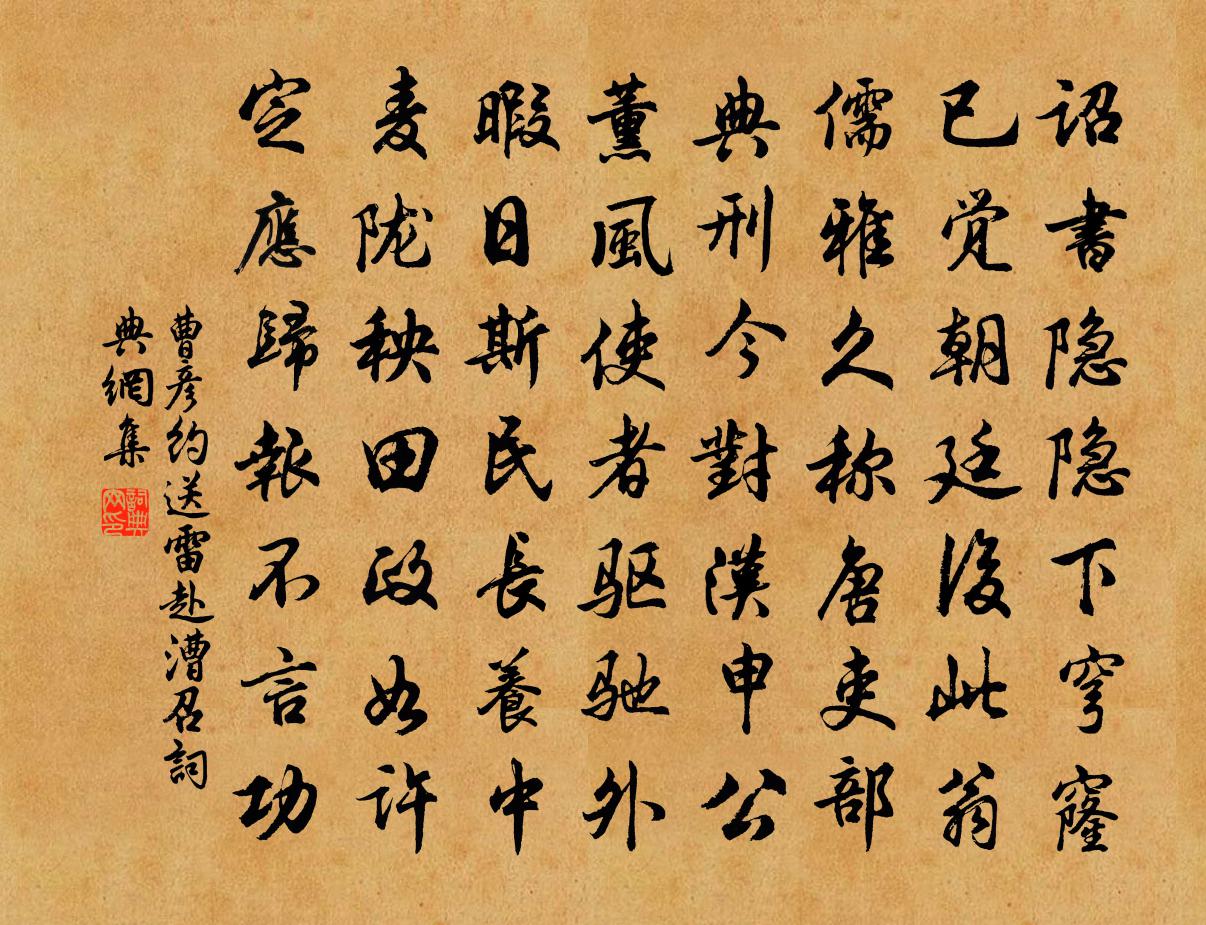 詩詞名句歷史字典書法欣賞書法字典國語詞典說文解字康熙字典古漢語字典標 題 作 者 詩 句 送雷赴漕召作者:曹彥約 朝代:宋代送雷赴漕召原文詔書隱隱下穹窿,已覺朝廷後此翁。儒雅久稱唐吏部,典刑今對漢申公。薰風使者驅馳外,暇日斯民長養中。麥隴秧田政如許,定應歸報不言功。詩詞問答問:送雷赴漕召的作者是誰?答:曹彥約問:送雷赴漕召寫於哪個朝代?答:宋代曹彥約送雷赴漕召書法欣賞送雷赴漕召書法作品詩詞推薦留寄黃檗山妙湛禪師張元乾〔宋代〕晨發薌城越數峰,我來師出失從容。白雲遮日蔽秋寺,青嶂聞猿驚暮鍾。世亂可無閒地隱,山深偏覺老僧慵。他年大唐鐘山進士歌楊維楨〔元代〕睛如貓,須如茅,烏靴白簡鴨色袍。元是鐘山老馗唐進土,感君之賜何以酬君勞。雖生不得祿,誓死為鬼豪。老馗陪西山游鼓山一首劉克莊〔宋代〕先生廊廟姿,非直藩翰才。南州彩旗留,北闕丹詔催。重臣方暑行,停驂小裴回。客中載枚鄒,物外尋宗雷,遂窮過南鄰花園雍陶〔唐代〕莫怪頻過有酒家,多情長是惜年華。春風堪賞還堪恨,才見開花又落花。陪德孺游徐氏園池李處權〔宋代〕禽魚花竹靜相參,溪雪融春青出籃。月下辭歸休秉燭,要將清夢過江南。九懷東山高似孫〔宋代〕若有人兮山要,樂莫樂兮在薖。絜余佩兮有蘭,愜余裳兮有蘿。凌八荒兮騁望,悵山河兮悲壯。倒天漢兮濯江淮,九日思杭州舊遊寄周判官及諸客白居易〔唐代〕忽憶郡南山頂上,昔時同醉是今辰。笙歌委曲聲延耳,金翠動搖光照身。風景不隨宮相去,歡娛應逐使君新。江山早夏遊平泉回白居易〔唐代〕夏早日初長,南風草木香。肩輿頗平穩,澗路甚清涼。紫蕨行看采,青梅旋摘嘗。療飢兼解渴,一盞冷雲漿。滿江紅(稅官之揚州任)邵桂子〔宋代〕離卻京華,到這裡、二千八百。窮醋大、齊齊整整,豈無貸揭。隨地平章花與柳,為天評品風和月。只留得、一管送萬耕道帥瓊管樓鑰〔宋代〕黎山千仞摩蒼穹,顓顓獨在大海中。自從漢武置兩郡,黎人始與南州通。歷歷更革不勝計,唐設五筦如容邕。皇朝早行李彌遜〔宋代〕飛鳴屋上鳥,入我夢中聽。遲明月方昃,平曉風更靜。游雲四山幕,止水萬象鏡。身如走空塵,南北了不定。三將軍歌並序張維屏〔清代〕三將軍,一姓葛,兩姓陳,捐軀報國皆忠臣。英夷犯粵寇氛惡,將軍奉檄守沙角。奮前擊賊賊稍卻,公奮無如兵力荊州新秋病起雜題一十五首病起見閒雲齊己〔唐代〕病起見閒雲,空中聚又分。滯留堪笑我,舒捲不如君。觸石終無跡,從風或有聞。仙山足鸞鳳,歸去自同群。醉中偶成劉過〔宋代〕小院蒲萄月架東,舞腰忙趁鼓聲雄。詩成彩筆分題後,人在金釵財令中。秋葉冷吟風浩蕩,晚林烘透日玲瓏。腰間掛金索佚名〔宋代〕無憂慮。孤雲野鶴無拘束。草庵內、閒看金書。窗外林泉,隈山傍水竹。明月清風,堪為伴侶。趙令畤德麟作襄陽從事丁丑季冬出行南山三邑李廌〔宋代〕鄒湛葛疆往過此,幕中佐曹畏簡書。習池峴首自今古,故寺悲喜成空虛。越王之孫府從事,惡人亦作俗吏呼。日從菊花新葛長庚〔宋代〕念我東皇大帝兒。是操觚弄翰之職。飛落塵寰,似此度,算應希。向這裡。安能便、策景御氣。灰頭土面、千河水寄趙紫芝張弋〔宋代〕獨游非一事,書札故應遲。江上逢春月,湖邊憶醉時。有云為我伴,終日誦君詩。百鳥鳴花樹,聲聲在遠思。汴河雨後呈同行馬秘書梅堯臣〔宋代〕雨霽晚虹收,河堤淨如掃。清陰拂人樹,翠色垂流草。漢漕走王都,華言雜夷獠。時方同馬生,野泊聊論道。貧女吟四首文天祥〔宋代〕竹扇掩紅顏,辛苦紉白苧。人間羅雪香,白苧汗如雨。名句推薦山河風景元無異,城郭人民半已非。文天祥《金陵驛二首·其一》 觀書老眼明如鏡,論事驚人膽滿軀辛棄疾《送湖南部曲》 心似已灰之木,身如不系之舟。蘇軾《自題金山畫像》 籬落疏疏一徑深,樹頭花落未成陰。楊萬里《宿新市徐公店》 今宵酒醒何處?楊柳岸,曉風殘月。柳永《雨霖鈴·寒蟬淒切》 人皆有不忍人之心。孟子《孟子·公孫丑章句上·第六節》 北風吹雪四更初,嘉瑞天教及歲除。陸游《除夜雪》 女媧鍊石補天處,石破天驚逗秋雨。李賀《李憑箜篌引》 憑欄久,黃蘆苦竹,擬泛九江船。周邦彥《滿庭芳·夏日溧水無想山作》 山際見來煙,竹中窺落日。吳均《山中雜詩》
