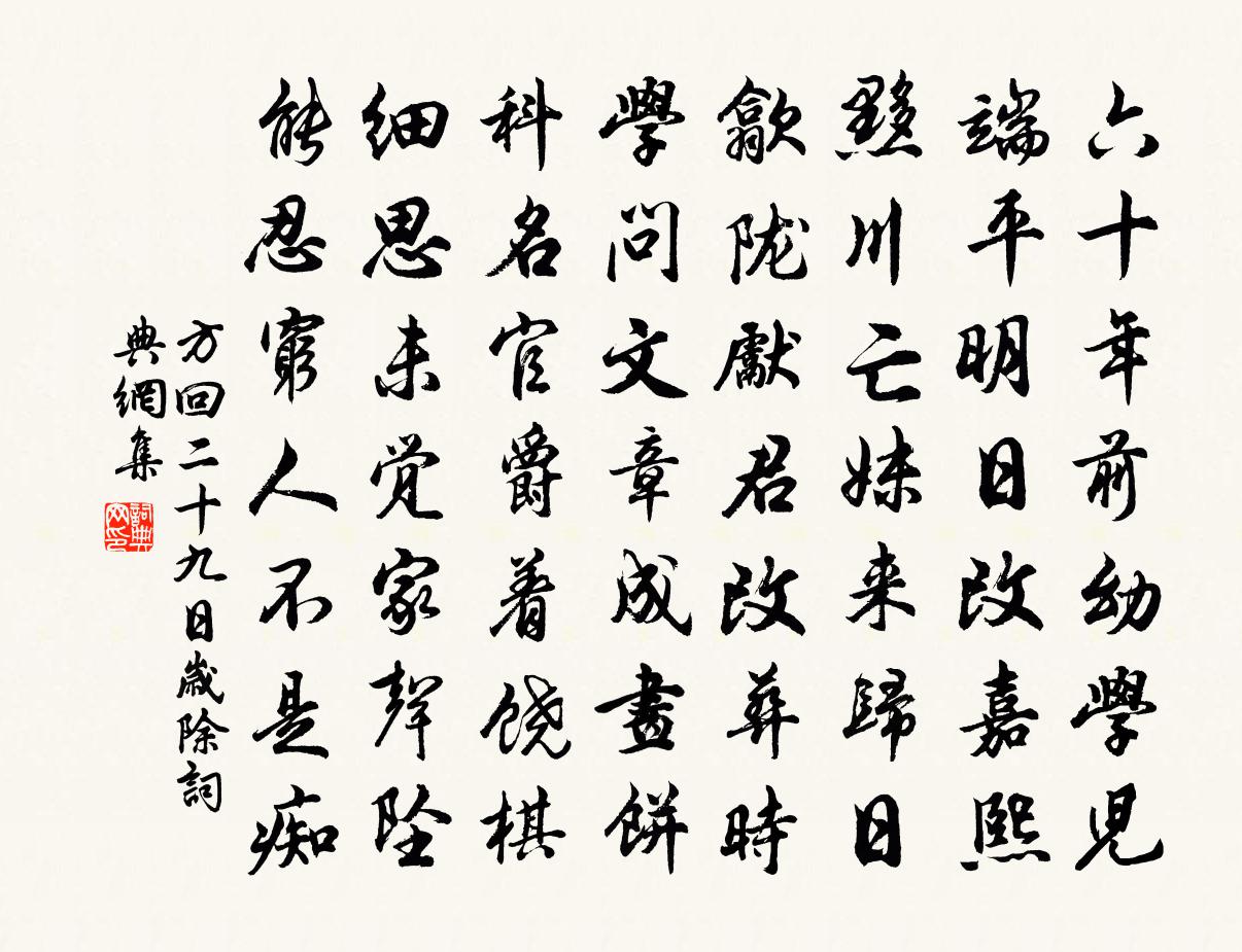 詩詞名句歷史字典書法欣賞書法字典國語詞典說文解字康熙字典古漢語字典標 題 作 者 詩 句 二十九日歲除作者:方回 朝代:宋代二十九日歲除原文六十年前幼學兒,端平明日改嘉熙。黟川亡妹來歸日,歙隴先君改葬時。學問文章成畫餅,科名官爵著饒棋。細思未覺家聲墜,能忍窮人不是痴。詩詞問答問:二十九日歲除的作者是誰?答:方回問:二十九日歲除寫於哪個朝代?答:宋代方回二十九日歲除書法欣賞二十九日歲除書法作品詩詞推薦送金陵胡撫乾仲芳劉過〔宋代〕共醉百斛酒,千金一笑傾。寄情桃葉渡,弔古石頭城。戰守籌雄地,更番出戍兵。瓮天留不住,圖略遂西征。不赴拾遺召費冠卿〔唐代〕君親同是先王道,何如骨肉一處老。也知臣子合佐時,自古榮華誰可保。祭灶詞范成大〔宋代〕古傅臘月二十四,灶君朝天欲言事。雲車風馬小留連,家有杯盤豐典祀。豬頭爛熱雙魚鮮,豆沙甘松粉餌團。男兒依韻四和正仲梅堯臣〔宋代〕四和還如九酘醅,更醇更美未嫌來。相逢莫作兩般眼,一飲不辭三百杯。嵇阮當時無俗慮,山王雖貴亦能陪。如今和韋使君秋夜見寄丘丹〔唐代〕露滴梧葉鳴,秋風桂花發。中有學仙侶, * 弄山月。次韻張仲謀過酺池寺齋黃庭堅〔宋代〕十年醉錦幄,酴醾照金沙。攲眠春風底,不去留君家。是時應門兒,紫蘭茁其芽。只今將弟妹,嬉戲牽羊車。忽書賀新郎丁幾仲〔宋代〕喜溢蟾宮夢。起推衣、平章寶桂,濕鴉飛動。果報佳音傳絡秀,丹穴雛生彩鳳。想孔釋、親來抱送。不羨徐卿秋水上宋使君貫休〔唐代〕折桂文如錦,分憂力若春。位高空倚命,詩妙古無人。有感禾爭熟,無私吏盡貧。野人如有幸,應得見陶鈞。天目和尚贊松源和尚像永長讀贊釋如珙〔宋代〕我祖之真,是真非真。我父之贊,是贊非贊。非是是真,非贊是贊。塞破虛空,斷楊岐旨,滅臨濟宗。分付寂靜水韓魏公生日三首強至〔宋代〕玉勒雙牽名騕褭,錦章輕疊瑞麒麟。三朝丞相迎恩賜,萬歲君王寵誕辰。將命彩衣宣漢禮,拜嘉香案望堯仁。太平發楊港渡入交石夾四首楊萬里〔宋代〕荻岸何時了,松舟幾日停。波來全蜀白,樹去兩淮青。柔櫓殊清響,征人自厭聽。不知誰子醉,垂手瞰江亭。阮郎歸 舟中賦所見陸文圭〔元代〕風吹一捻柳腰輕。春柔力未勝。眉兒喜學遠山青。終朝畫不成。嬌滴滴,笑盈盈。雛鶯葉底聲。花梢雨過夕陽明。鶴嘆蘇軾〔宋代〕園中有鶴馴可呼,我欲呼之立坐隅。鶴有難色側睨予,豈欲臆對如鵩乎。我生如寄良畸孤,三尺長脛閣瘦軀。俯啄梅花陸游〔宋代〕五年作竹梢,十年作梅枝。九泉子廉子,此語今誰知?贈李司空妓劉禹錫〔唐代〕高髻雲鬟宮樣妝,春風一曲杜韋娘。司空見慣渾閒事,斷盡蘇州刺史腸。庚辛二月二十二日宿齋省中卷剛中〔宋代〕齋所深嚴客過難,逼人書債未須還。檐遮暖日桃夭瘦,鳥踏風枝竹影閒。細細乳花新茗碗,霏霏香霧小爐山。滿庭傷故人歌妓長孫佐輔〔唐代〕愁臉無紅衣滿塵,萬家門戶不容身。曾將一笑君前去,誤殺幾多回顧人。惜花成彥雄〔唐代〕忘餐為戀滿枝紅,錦障頻移護晚風。客散酒酣歸未得,欄邊獨立月明中。峴山懷古李白〔唐代〕訪古登峴首,憑高眺襄中。天清遠峰出,水落寒沙空。弄珠見游女,醉酒懷山公。感嘆發秋興,長松鳴夜風。句何希之〔宋代〕諸公錯落陽和調,贏得林間自在翁。名句推薦悵望千秋一灑淚,蕭條異代不同時。杜甫《詠懷古蹟五首·其二》 興國在於務農。陳壽《三國志·魏書·辛毗楊阜高堂隆傳》 謙謙君子,卑以自牧佚名《易傳·象傳上·謙》 謾道愁須殢酒,酒未醒、愁已先回秦觀《滿庭芳·碧水驚秋》 終然獨不見,流淚空自知。李白《獨不見》 彼竊鉤者誅,竊國者為諸侯,諸侯之門而仁義存焉莊子《莊子·外篇·胠篋》 察己則可以知人,察今則可以知古。呂不韋《呂氏春秋·覽·慎大覽》 波瀾誓不起,妾心古井水。孟郊《列女操 / 烈女操》 人歸落雁後,思發在花前。薛道衡《人日思歸》 君子之言寡而實,小人之言多而虛。劉向《說苑·談叢》