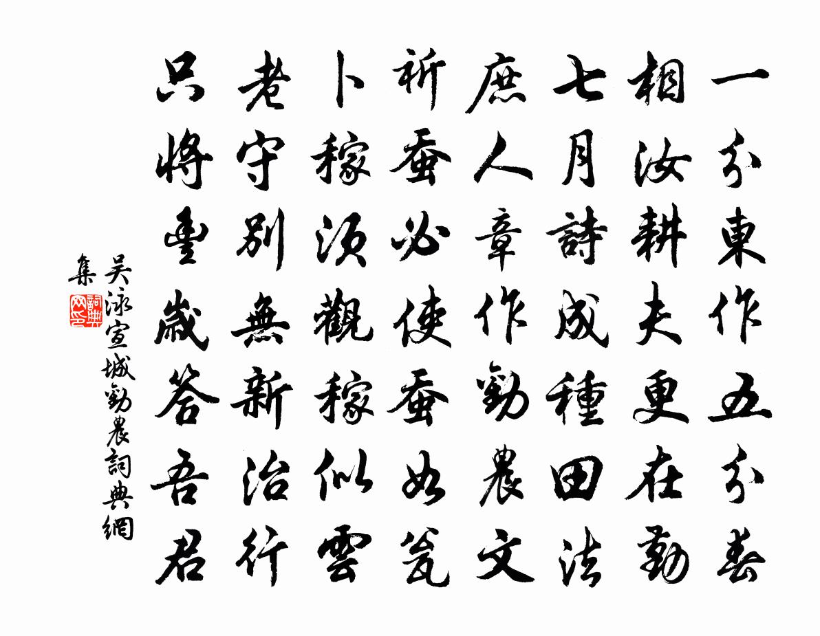 詩詞名句歷史字典書法欣賞書法字典國語詞典說文解字康熙字典古漢語字典標 題 作 者 詩 句 宣城勸農作者:吳泳 朝代:宋代宣城勸農原文一分東作五分春,相汝耕夫更在勤。七月詩成種田法,庶人章作勸農文。祈蠶必使蠶如瓮,卜稼須觀稼似雲。老守別無新治行,只將豐歲答吾君。詩詞問答問:宣城勸農的作者是誰?答:吳泳問:宣城勸農寫於哪個朝代?答:宋代吳泳宣城勸農書法欣賞宣城勸農書法作品詩詞推薦西陂宋庠〔宋代〕歲晏西陂好,澄波共夕陽。戲魚來有暈,驚鶩去無行。荇葉疏猶碧,蘭苕老更香。裴回歸鞅晚,併為似滄浪。和陶郭主簿二首蘇軾〔宋代〕雀{彀弓換成鳥}含淳音,竹萌抱靜節。誦我先君詩,肝肺為澄澈。猶如鳴鶴和,未作獲麟絕。願因騎鯨李,追此復病三首蘇轍〔宋代〕病作日短至,病消秋氣初。山深足氛瘴,俗儉少餚蔬。藥亂曾何補,心安當自除。朝廷閔流落,已是脫遷居。寒作為妻作生日寄意李郢〔唐代〕謝家生日好風煙,柳暖花春二月天。金鳳對翹雙翡翠,蜀琴初上七絲弦。鴛鴦交頸期千歲,琴瑟諧和願百年。應恨楊公蘊之華亭宰梅堯臣〔宋代〕月徑千里大,中有神娥宮。宮旁種玉桂,柯葉垂瓏瓏。蝦蟆穴其根,出輒氣墨蒙。光魄縱復吐,血赤如頑銅。不知麥穗兩岐鄭畋〔唐代〕聖慮憂千畝,嘉苗薦兩岐。如雲方表盛,成穗忽標奇。瑞露縱橫滴,祥風左右吹。謳歌連上苑,化日遍平陂。史冊偈頌一百零二首釋紹曇〔宋代〕秘魔擎叉,俱胝豎指。邪法難扶,如何得是。山僧冷地思量,不覺吞聲飽氣。攻乎異端,斯害也矣。大中祥符封禪十首真宗〔宋代〕坤德直方,博厚無疆。秉險得一,靜而有常。實藏以發,乃育百昌。肅祗禪祭,錫祉穰穰。良月十六日以祈晴宿齋郊壇寺僧拉登梅岩讀高程公許〔宋代〕祝冊頌九重,郊丘以晴禱。小臣職駿奔,腳踏車倦塗潦,崇阜逾巘崿,層壇敷千藁右興念經始,面勢若天造。濤雲日七弟示詩後又改緣字為川字因再次韻蘇頌〔宋代〕幽棲新得地,朴飾敢求全。一畝真儒有,三年近道邊。鋤荒還見舊,革陋遂成妍。棟宇依岩畔,煙雲入檻前。人非歲菊艾性夫〔宋代〕不逐登高老孟嘉,同來守歲阿戎家。能將秋圃風霜骨,直作寒梅輩行花。香稱屠蘇浮臘蟻,色侵幡勝插雲鴉。老夫偈頌二十五釋智遇〔宋代〕杜宇不如歸,竹雞泥滑滑。深山岩中,誰道無佛法。有佛法,衲僧只有三隻襪。亨仲家兄擢居諫省詩以賀之李處權〔宋代〕除書喜動薦紳顏,穩上天池刷羽翰。詩似少陵多教化,文從太史有波瀾。王庭看折朱雲檻,儒巷聞彈貢禹冠。兄弟居厚弟和七十四吟再賦劉克莊〔宋代〕用世文章莫太高,空言詎有補絲毫。呼來誰遣批黃敕,謫去何須著錦袍。齒耋自應陪九老,詩低不足列三豪。仆家望月宋祁〔宋代〕早月始娟娟,西南寥泬天。魄中藏暗樹,輪外上虛弦。傍漢含銀淺,過雲漏葉鮮。遙知今夜鵲,猶得穩枝眠。喜雨汪炎昶〔宋代〕窗竹斂晚影,雲起天冥冥。一雨輪微涼,收盡蚊蚋聲。生意落原野,焦黃返新青。滂沱更三日,端可□年登。呼兒崇恩演福禪增偈賈似道〔宋代〕靈山一別幾經春,今日重來喜見君。佛法一肩擔荷卻,黃鶴樓前第一尊。臘茶並三詩送李元誠陳造〔宋代〕向來袞袞論風期,百年心事多好違。君如荊石尚衷璞,我似野馬初受羈。射陽廣陽水雲屋,襄城郵城塵土衣。挽眉石竺山二十詠劉克莊〔宋代〕嗒然蒙一衲,趺坐不知年。處處神通現,何須海岸邊。送張生歐陽修〔宋代〕一別相逢十七春,頹顏衰發互相詢。江湖我再為遷客,道路君猶困旅人。老驥骨奇心尚壯,青松歲久色逾新。山城名句推薦書痴者文必工,藝痴者技必良。蒲松齡《聊齋志異·卷二·阿寶》 遙知未眠月,鄉思在漁歌。杜荀鶴《送人游吳》 生生死死,非物非我,皆命也,智之所無柰何。列子及其弟子《列子·力命》 死別已吞聲,生別常惻惻。杜甫《夢李白二首·其一》 自聞穎師彈,起坐在一旁。韓愈《聽穎師彈琴》 蓋鍾子期死,伯牙終身不復鼓琴。班固《漢書·傳·司馬遷傳》 灞橋煙柳,曲江池館,應待人來。陸游《秋波媚·七月十六日晚登高興亭望長安南山》 日色已盡花含煙,月明欲素愁不眠。李白《長相思三首·其二》 蜂兒不解知人苦,燕兒不解說人愁。程垓《最高樓·舊時心事》 置冠服,有定位。勿亂頓,致污穢。李毓秀《弟子規·謹》