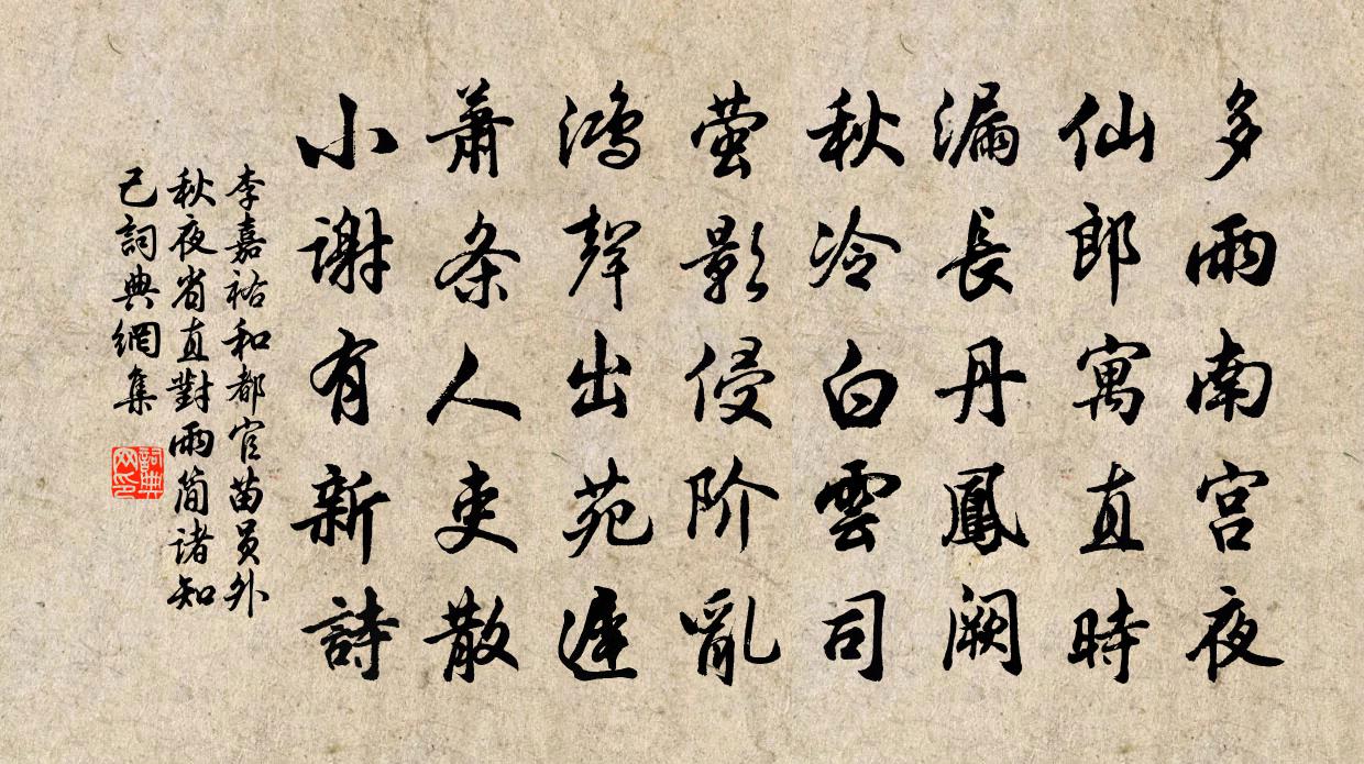 詩詞名句歷史字典書法欣賞書法字典國語詞典說文解字康熙字典古漢語字典標 題 作 者 詩 句 和都官苗員外秋夜省直對雨簡諸知己作者:李嘉祐 朝代:唐代原文多雨南宮夜,仙郎寓直時。漏長丹鳳闕,秋冷白雲司。螢影侵階亂,鴻聲出苑遲。蕭條人吏散,小謝有新詩。詩詞問答問:《和都官苗員外秋夜省直對雨簡諸知己》的作者是誰?答:李嘉祐問:該詩寫於哪個朝代?答:唐代書法欣賞和都官苗員外秋夜省直對雨簡諸知己書法作品注釋全唐詩:卷206_49詩詞推薦嚴陵釣台錢聞詩〔宋代〕無復塵勞夢,猶蒙故舊知。寧辭萬鍾祿,不負一綸絲。和蔡副樞賀平戎慶捷王安石〔宋代〕城郭名王據兩陲,軍前一日送降旗。羌兵自此無傳箭,漢甲如今不解累。幕府上功聯舊伐,朝廷稱慶具新儀。周家得長春兩株植之窗前陳與義〔宋代〕鄉邑已無路,僧廬今是家。聊乘數點雨,自種兩叢花。籬落失秋序,風煙添歲華。衰翁病不飲,獨立到棲鴉。次韻王適落日江上二首蘇轍〔宋代〕稍息南市喧,初上東山月。潛魚忽驚踴,飢雁時斷絕。落葉誤投簽,繁霜疑積雪。苦寒良難久,愛此元氣潔。獅子相觀音贊釋智朋〔宋代〕獅子國中,隨類度生。盤石海潮,呵吼不停。要見真獅子兒,於斯觀其音聲。歌贈葉季質陳長方〔宋代〕葉子喔詩風雨寒,時時和墨搖筆端。江山萬里入寸紙,杳靄孤鴻殘照閒。滄洲散發徑欲往,已覺置我江之乾。一身賀新郎葛長庚〔宋代〕一別蓬萊館。看桑田成海,又見松枯石爛。目斷虛皇無極處,安得殿頭宣喚。指歸路、鈞天早晚。此去罡風三萬里次坦之韻吳則禮〔宋代〕隱侯天下士,早從北山游。至今華屋處,淚眥嬰西州。予實老且病,聞螘類鬥牛。力不任毛潁,況能佩吳鉤。蟲鳴念奴嬌(菊)王炎〔宋代〕小妝朱檻,護秋英千點,金鈿如簇。黃葉白苹朝露冷,只有孤芳幽馥。華發蒼頭,宦情羈思,來伴花幽獨。巡檐無九吟詩飛玉吳昌裔〔宋代〕誰擘岩扉石竇開,中流玉水潄蒼苔。有時卷雪從天下,端是源頭蓄得來。寄題蔣灣效堯夫體吳泳〔宋代〕剛把西湖賣與鄰,卜園新得蔣灣春。半荒亭樹景偏老,欲壓溪橋花更真。漫賦莫教詩過好,淺斟時要酒輕醇。若能王十二兄與畏之員外相訪見招小飲…以悼亡日近不去因寄李商隱〔唐代〕謝傅門庭舊末行,今朝歌管屬檀郎。更無人處簾垂地,欲拂塵時簟竟床。嵇氏 * 猶可憫,左家嬌女豈能忘。秋霖送客往洞庭楊凝〔唐代〕九江歸路遠,萬里客舟還。若過巴江水,湘東滿碧煙。游棲霞寺皮日休〔唐代〕不見明居士,空山但寂寥。白蓮吟次缺,青靄坐來銷。泉冷無三伏,松枯有六朝。何時石上月,相對論逍遙。自悼張嵲〔宋代〕銀山卷浪萬雷鳴,渚水諸灘險永清。平日垂堂猶自戒,年來輕作二江行。野色范仲淹〔宋代〕非煙亦非霧,羃羃映樓台。白鳥忽點破,夕陽還照開。肯隨芳草歇,疑逐遠帆來。誰謂山公意,登高醉始回。寒食孟雲卿〔唐代〕二月江南花滿枝,他鄉寒食遠堪悲。貧居往往無煙火,不獨明朝為子推。夏日過隱不湖居釋文珦〔宋代〕軒窗臨水開,潔瑩如冰鏡。含風柳千絲,清暑荷萬柄。近結鷗鷺盟,遠寄江湖興。吾亦愛君廬,為發滄浪詠。山齋史堯弼〔宋代〕禱公一邱壑,何似東山起。可憐丹青手,置之岩石里。答劉琨詩二首 一盧諶〔魏晉〕隨寶產漢濱。摛此夜光真。不待卞和顯。自為命世珍。名句推薦野臣潛隨擊壤老,日下鼓腹歌可封。鮑防《元日早朝行》 知人者智,自知者明。老子《老子·道經·第三十三章》 江送巴南水,山橫塞北雲王勃《江亭夜月送別二首》 一樹梨花一溪月,不知今夜屬何人?佚名《雜詩·舊山雖在不關身》 兵者詭道,善因事變。房玄齡《晉書·帝紀·第一章》 天階夜色涼如水,臥看牽牛織女星。杜牧《秋夕》 桃今百餘尺,花落成枯枝。李白《獨不見》 蘇小門前柳萬條,毿毿金線拂平橋。溫庭筠《楊柳八首·其三》 芝蘭生於深林,不以無人而不芳,君子修道立德,不謂窮困而改節。佚名《孔子家語·在厄》 不以規矩,不能成方圓孟子《孟子·離婁章句上·第一節》