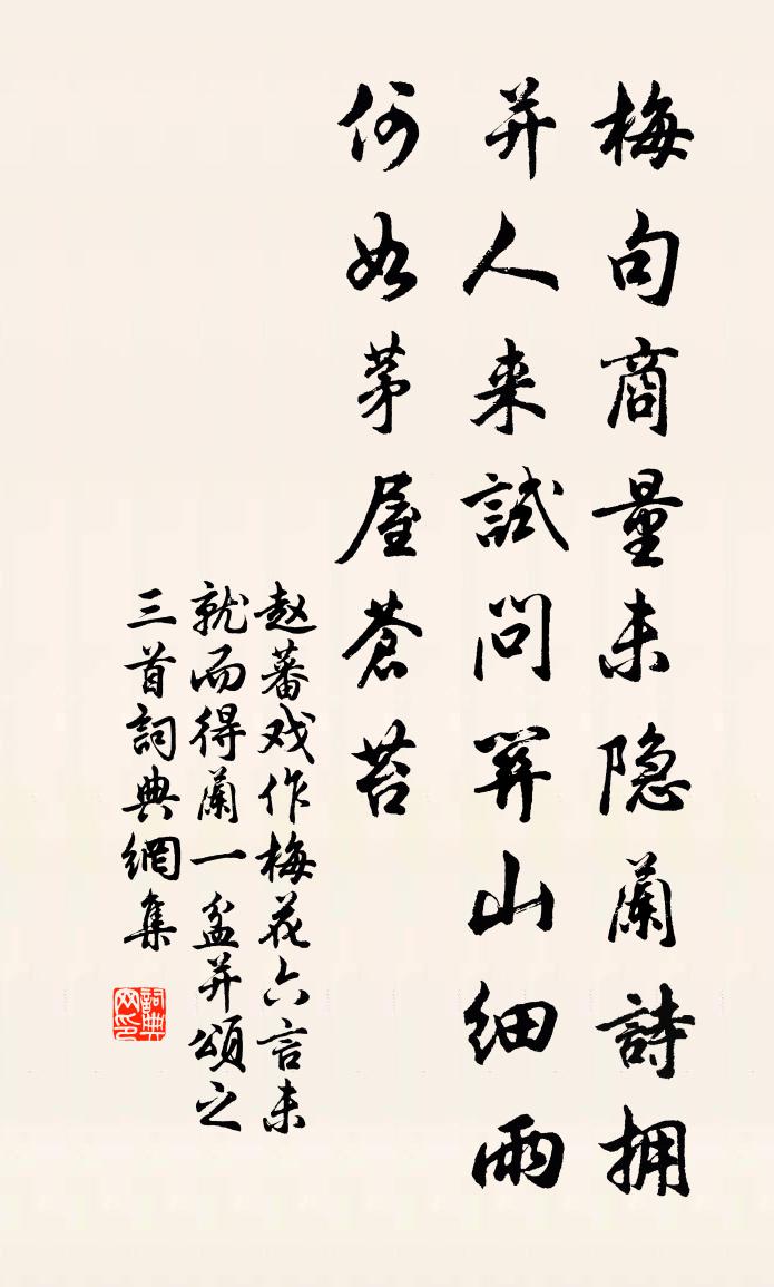 詩詞名句歷史字典書法欣賞書法字典國語詞典說文解字康熙字典古漢語字典標 題 作 者 詩 句 戲作梅花六言未就而得蘭一盆並頌之三首作者:趙蕃 朝代:宋代原文梅句商量未隱,蘭詩擁並人來。試問關山細雨,何如茅屋蒼苔。詩詞問答問:《戲作梅花六言未就而得蘭一盆並頌之三首》的作者是誰?答:趙蕃問:該詩寫於哪個朝代?答:宋代書法欣賞戲作梅花六言未就而得蘭一盆並頌之三首書法作品詩詞推薦淡紫賈似道〔宋代〕名為淡紫遍身明,項如青靛齒紫紅。頭上三尖腰要闊,戰得場中不敢逢。失調名竇夫人〔宋代〕去時梅蕊全然少。三月三十日郊外即事黃公度〔宋代〕雨積稻畦白,晴添麥壠黃。野橋排雁齒,山路轉羊腸。鳥語有時好,田家隨事忙。一年春盡日,身跡更他鄉。行香子張翥〔元代〕水遠天低。雪意垂垂。火爐頭、煨芋燃萁。 * 穩坐,紙帳低圍。且放些慵,補些拙,學些痴。休惹群兒。唱起銅寄丘三公詩江淹〔南北朝〕昔我學冠劍。逢君在三川。何意風雨激。一訣異東西。菊秀空應奪。蘭芳幾時堅。常恐握手畢。黯如光絕天。安得江北羅隱〔唐代〕廢宮荒苑莫閒愁,成敗終須要徹頭。一種風流一種死,朝歌爭得似揚州。臨水坐白居易〔唐代〕昔為東掖垣中客,今作西方社內人。手把楊枝臨水坐,閒思往事似前身。泊廬江縣界幾遭寇掠董嗣杲〔宋代〕酒興那如歸興濃,此行誰信破囊空。扁舟小艤廬江外,雨夜深埋虎穴中。獨客痛心無可說,何人料事偶相同。昏時予自長沙還植蘭竹於東西軒調官京師逾年而歸楊時〔宋代〕柴桑衰晚愛吾廬,三徑歸來手自鋤。但得叔卿長飽飯,不妨孝若老談書。蘭因采佩枝先瘁,竹為凌霜葉自疏。留骨導引佚名〔宋代〕駕斑龍。忽催金母轉仙仗、去瑤宮。絳闕深沈杳無蹤。漸塵空。絲網瓊林,花似怨東風。垂清露啼紅。猶想舊春中寄題舒州宿松知縣戴在伯重新紫霄亭二首楊萬里〔宋代〕一代名臣張右丞,玉山頭作紫霄亭。如今再得戴安道,拈出舊時山色青。和劉後村梅花百詠方蒙仲〔宋代〕凜凜冰清岩壑氣,亭亭玉立廟廊身。從前誤把瑤姬比,雌了梅花俗了人。飲方君舍晚歸韓維〔宋代〕慘澹秋原思,歸鞍暮向城。野風吹酒散,寒日上衣明。躑躅樵兒聚,喧呼獵騎輕。村醪處處熟,準擬數來行。【正宮】白鶴子關漢卿〔元代〕花邊停駿馬,柳外纜輕舟。湖內畫船交,湖上驊騮驟。午夜登嶓山范成大〔宋代〕癉暑嚴夜裝,乘涼躡危嶠。猿依黑林號,鬼閃青炬嘯。驚鳥動危葉,吟蟲滿荒草。泉聲遠相隨,山色近如杳。夢猶隱居鳳山清明寺二首樓淳〔宋代〕日上鍾未鳴,老僧睡猶熟。誰是山中人,長享清明福。觀鬥雞(一作雞斗)偶作韓偓〔唐代〕何曾解報稻粱恩,金距花冠氣遏雲。白日梟鳴無意問,唯將芥羽害同群。詠史下諸葛誕陳普〔宋代〕義旗照日映淮流,不為曹孤為夏侯。麾下諸君底心性,海中五百又揚州。南鄉子(壽廿一弟)韓元吉〔宋代〕新筍旋成林。梅子枝頭雨更深。織就彩絲猶十日,登臨。人似江心百鍊金。功業會相尋。好挹薰風和舜琴。鶴住千過陳行之飲晁公溯〔宋代〕陳郎見我江陽城,自起喚婦親庖烹。執勤纖手為袒割,始飲一杯和且平。一杯已盡催進酒,平頭奴子皆傳聲。幾州名句推薦何期今日酒,忽對故園花。文森《九日》 但使情親千里近,須信。無情對面是山河。辛棄疾《定風波·席上送范廓之游建康》 翠華想像空山里,玉殿虛無野寺中。杜甫《詠懷古蹟五首·其四》 賊是小人,智過君子。佚名《增廣賢文·上集》 尋常一樣窗前月,才有梅花便不同。杜耒《寒夜》 一夜雨聲涼到夢,萬荷葉上送秋來。陳文述《夏日雜詩》 欲買桂花同載酒,終不似,少年游。劉過《唐多令·蘆葉滿汀洲》 南渡君臣輕社稷,中原父老望旌旗。趙孟頫《岳鄂王墓》 飛光飛光,勸爾一杯酒。李賀《苦晝短》 相思黃葉落,白露濕青苔。李白《長相思三首》