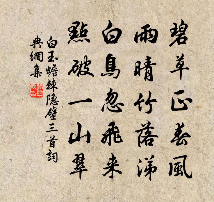 詩詞名句歷史字典書法欣賞書法字典國語詞典說文解字康熙字典古漢語字典標 題 作 者 詩 句 棘隱壁三首作者:白玉蟾 朝代:宋代棘隱壁三首原文碧草正春風,雨晴竹落涕。白鳥忽飛來,點破一山翠。詩詞問答問:棘隱壁三首的作者是誰?答:白玉蟾問:棘隱壁三首寫於哪個朝代?答:宋代問:棘隱壁三首是什麼體裁?答:五絕白玉蟾棘隱壁三首書法欣賞棘隱壁三首書法作品詩詞推薦江上陸游〔宋代〕江上霜寒透客衣,閉窗羸臥不支持。羈孤形影真相吊,衰颯頭顱已可知。潦縮穩經行雨峽,竹疏剩見掛猿枝。清樽南昌城蔡沈〔宋代〕巍城十八里,雄壯稱洪都。北郭勢迤邐,南浦形縈紆。連亘控西江,囊括盡東湖。灌侯遺故址,李相規舊模。改築古遊俠呈軍中諸將(一作遊俠篇)崔顥〔唐代〕少年負膽氣,好勇復知機。仗劍出門去,孤城逢合圍。 * 遼水上,走馬漁陽歸。錯落金鎖甲,蒙茸貂鼠衣。還家和穎上人南徐十詠其九甘露寺梅堯臣〔宋代〕山頭百畝宮,庭下千年樹。在昔甘露霏,嘗疑神物護。陰連殿閣寒,聲撼雷霆怒。瞻影衛公堂,英魂想來去。和主司王起(一作和主司酬周侍郎)李潛〔唐代〕文學宗師心秤平,無私三用佐貞明。恩波舊是仙舟客,德宇新添月桂名。蘭署崇資金色重,蓮峰高唱玉音清。羽毛一盌泉張知退〔宋代〕泉形如盌水波圓,一勺之多可悟全。試看靈湫輕灑處,甘霖頃刻遍秦川。六月十四日大雨少頃月如晝李流謙〔宋代〕火雲忽改色,大雨捲地來。淝水萬貔貅,一戰山嶽摧。須臾天宇霽,刮掃無纖埃。佳月流清輝,瓊瑤碎六街。薄泥於潛僧綠筠軒蘇軾〔宋代〕可使食無肉,不可居無竹。無肉令人瘦,無竹令人俗。人瘦尚可肥,士俗不可醫。旁人笑此言,似高還似痴。若對句鄭周卿〔宋代〕鶴歸空有恨,雲散本無心。老叟趙希邁〔宋代〕鬢髮如霜心未灰,尚營活計待將來。嶺頭盡日敲松子,猶向山園空處栽。小女李覯〔宋代〕惜汝今何恃,言來淚滿襟。死生雖分定,襁褓累人心。飢買鄰家乳,寒勞祖母針。豈知泉路隔,時發繐帷尋。九日三首蘇轍〔宋代〕瓢尊空掛壁,九日若為歡。白髮逃無計,黃花開已闌。酒慳慚對客,風起任飄冠。賴有陶翁伴,貧居得自寬。夔冬暖雪不到地唯山高處盡白它皆霏雨而已宋肇〔宋代〕密下斜飛片片愁,不堪飄泊向西州。思家對雪誠何味,只與群山斗白頭。潼關道中鄭谷〔唐代〕白道曉霜迷,離燈照馬嘶。秋風滿關樹,殘月隔河雞。來往非無倦,窮通豈易齊。何年歸故社,披雨剪春畦。詠麻溪在歷陽西一里李聰〔唐代〕泠泠一帶清溪水,遠派來通曆陽市。涓涓出自碧湖中,流入楚江煙霧裡。頌古一百首釋智愚〔宋代〕白石鑒鑒,韞爾美璞。君子道晦,君子斯樂。赴官武康投宿客邸作林仰〔宋代〕巾子山頭一枕風,皇華亭下水連空。山靈不用回俗駕,儻有田園吾欲東。太皇太后閣六首蘇軾〔宋代〕令節陳詩歲歲新,從官何以壽吾君。願儲醫國三年艾,不作沉湘九辯文。鄞塘田家戴表元〔宋代〕經秋心事轉衰頹,客舍山村病眼開。識路牛羊緣板過,通家燕雀下檐來。飢從野榼分蔬飯,渴指鄰簾貰黍醅。世事雀丘葵〔宋代〕雀在在屋上,雀在在屋下。邊啾各有聲,食息同晨夜。所以異者何,仁義非外假。雲胡不自養。乃至為物化。嗟余名句推薦往年同在鸞橋上,見倚朱闌詠柳綿。韓偓《寒食日重遊李氏園亭有懷》 請君看取東流水,方識人間別意長。嚴仁《鷓鴣天·惜別》 故人何處。帶我離愁江外去。呂本中《減字木蘭花·去年今夜》 樓上幾日春寒,簾垂四面,玉闌乾慵倚。李清照《念奴嬌·春情》 得百姓之力者富,得百姓之死者強,得百姓之譽者榮。荀子《荀子·王霸》 淮水東邊舊時月,夜深還過女牆來。劉禹錫《金陵五題·石頭城》 福輕乎羽,莫之知載;禍重乎地,莫之知避。莊子《莊子·內篇·人間世》 有三秋桂子,十里荷花。柳永《望海潮·東南形勝》 蛇無頭而不行,鳥無翅而不飛。施耐庵《水滸傳·第六十回》 蠟淚惱東風,舊壘眠新燕。納蘭性德《生查子·鞭影落春堤》