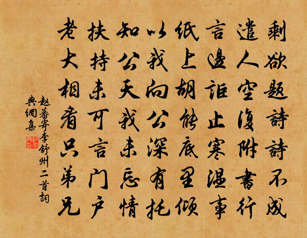 詩詞名句歷史字典書法欣賞書法字典國語詞典說文解字康熙字典古漢語字典標 題 作 者 詩 句 寄李舒州二首作者:趙蕃 朝代:宋代寄李舒州二首原文剩欲題詩詩不成,遣人空復附書行。言邊詎止寒溫事,紙上胡能底里傾。以我向公深有托,知公天我未忘情。扶持未可言門戶,老大相看只弟兄。詩詞問答問:寄李舒州二首的作者是誰?答:趙蕃問:寄李舒州二首寫於哪個朝代?答:宋代趙蕃寄李舒州二首書法欣賞寄李舒州二首書法作品詩詞推薦和陳正言讜題尊賢堂二首譚景先〔宋代〕孰識東坡第一仙,謫來儋耳久悠然。潛心學易忘憂患,築屋閒居度歲年。興遣不為哀屈事,情高嘗見和陶篇。拜公喜劉伯宣尚書至五首方回〔宋代〕湖濱文字飲,一別五年余。未死須重見,將詩屢當書。事元無可說,意自不能疏。近日知來信,頑軀百病除。偈頌一百零二首釋紹曇〔宋代〕大康山,楊浮山。撞頭搕額,共打鄉談。其中切腳無人會,一大藏教,華梵重翻。淮陰書懷寄王宗成 (一作王宗城 )李白〔唐代〕沙墩至梁苑,二十五長亭。大舶夾雙櫓,中流鵝鸛鳴。雲天掃空碧,川岳涵餘清。飛鳧從西來,適與佳興並。眷言偈頌六十八首釋法薰〔宋代〕九十日已過半,那事畢竟如何。直饒窮到底,終是涉風波。人日聚星堂燕集探韻得豐字歐陽修〔宋代〕污池以其下,眾流之所鍾。尺水無長瀾,蛟龍豈其容。顧予誠鄙薄,群俊枉高蹤。得一不為少,雖多肯辭豈。譬如梅谷周文璞〔宋代〕蚝焰雲頭玉雪身,緩行微詠岸烏巾。始從谷里看修行,卻向水濱逢麗人。客子去時方得月,嶺猿啼後便無春。鳳凰送湖南張倉解官還建昌九首廖行之〔宋代〕見說龍門不可攀,自驚容易得承顏。從今洗眼湘江上,看取功成鬢未斑。和博古直五首蒲壽宬〔宋代〕曠茲歷億劫,矧此浮雲身。桑樞弗言病,駟馬休笑貧。棲棲魯中叟,救世誠艱辛。鳥獸豈同群,由也徒問津。人世柳梢青(建康作)袁去華〔宋代〕白鷺洲前,烏衣巷口,江上城郭。萬古豪華,六朝興廢,潮生潮落。信流一葉飄泊。嘆問米、東遊計錯。老眼昏花陋居一首蘇籀〔宋代〕平生瓮牖蔀茆菁,江左那無雨土寧。遊宦飄然紆幕燕,陋居粗有讀書螢。浮生佛腳須當抱,亂世儒衣便欲停。天定題令宣和尚院貫休〔唐代〕軒窗領嵐翠,師得世情忘。惟愛談諸祖,曾經宿大荒。泉聲淹臥榻,雲片犯爐香。寄語題門者,看經在上方。征東至淇門答宋十一參軍之問陳子昂〔唐代〕南星中大火。將子涉清淇。西林改微月。征旆空自持。碧潭去已遠。瑤華折遺誰。若問遼陽戍。悠悠天際旗。察使姜公鄭思肖〔宋代〕殺氣盤空白書陰,始終不變似精金。直疑碧落三更月,來作將軍一片心。清平樂(木犀)陳與義〔宋代〕黃衫相倚。翠葆層層底。八月江南風日美。弄影山腰水尾。楚人未識孤妍。離騷遺恨千年。無住庵中新事,一枝喚江上寄山陰崔少府國輔孟浩然〔唐代〕春堤楊柳發,憶與故人期。草木本無意,榮枯自有時。山陰定遠近,江上日相思。不及蘭亭會,空吟祓禊詩。杏花天慢(杏花)曹勛〔宋代〕桃蕊初謝,雙燕來後,枝上嫩苞時節。絳萼滋浩露,照曉景、裁翦冰綃禁格。煙傳靚質。似淡拂、妝成香頰。看暖書石壁王氏〔宋代〕何事潘郎戀別筵,歡情未斷妾心懸。汰王灘下相思處,猿叫山山月滿船。樓樞密輓詞二首蘇籀〔宋代〕岳鎮巍峩幕府雄,紫青頤旨稟趨風。布宣條目都無擾,求瘼慈祥概所蒙。賓位樽罍人事改,影娥花月畫堂空。諸方擬楚詞李廌〔宋代〕匠執斤兮道周,稱百尋以弗用兮谷之幽。屈輪囷以為杯兮,孰謂賢於杞柳。揉吾性以矯真兮。寧全天以為壽。樂吾名句推薦可憐處處巢居室,何異飄飄托此身。杜甫《燕子來舟中作》 晚雲都變露,新月初學扇,塞鴻一字來如線。周德清《塞鴻秋·潯陽即景》 當時相候赤欄橋,今日獨尋黃葉路。周邦彥《玉樓春·桃溪不作從容住》 君子無入而不自得焉。子思《中庸·第十四章》 俯皇都之宏麗兮,瞰雲霞之浮動。曹植《銅雀台賦》 一曲陽關,斷腸聲盡,獨自憑蘭橈柳永《少年游·參差煙樹灞陵橋》 晚來風起花如雪,飛入宮牆不見人。劉禹錫《楊柳枝詞九首》 常恐秋節至,焜黃華葉衰。佚名《長歌行》 花謝花飛花滿天,紅消香斷有誰憐。曹雪芹《紅樓夢·第二十七回》 天明登前途,獨與老翁別。杜甫《石壕吏》