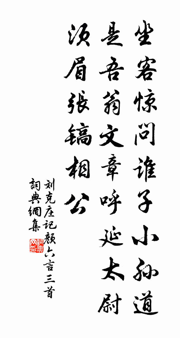詩詞名句歷史字典書法欣賞書法字典國語詞典說文解字康熙字典古漢語字典標 題 作 者 詩 句 記顏六言三首作者:劉克莊 朝代:宋代記顏六言三首原文坐客驚問誰子,小孫道是吾翁。文章呼延太尉,鬚眉張鎬相公。詩詞問答問:記顏六言三首的作者是誰?答:劉克莊問:記顏六言三首寫於哪個朝代?答:宋代問:劉克莊的名句有哪些?答:劉克莊名句大全劉克莊記顏六言三首書法欣賞記顏六言三首書法作品詩詞推薦漁家傲侯善淵〔元代〕混沌杳冥經寰宇。彩霞散盡明玉兔。西落鹹池復回顧。心開悟。凝魂晦魄金烏趣。美盼扶彝寒光露。氤氳三色淳清贈別離陳陶〔唐代〕碧玉飛天星墜地,玉劍分風交合水。楊柳聽歌莫向隅,雞鳴一石留髡醉。蹄輪送客溝水東,月娥揮手崦嵫峰。蠻天游沖虛觀蔡襄〔宋代〕真人玉骨輕,御氣升瑤台。俯首視下方,萬落腥塵埃。香火久寂寞,山川空徘徊。舊樹絡青蔓,虛壇生紫苔。宴坐韓公堆寄元九白居易〔唐代〕韓公堆北澗西頭,冷雨涼風拂面秋。努力南行少惆悵,江州猶似勝通州。端午帖子太上皇帝閣周必大〔宋代〕此日天中節,它年赤伏符。只因昭火德,不為記荊吳。賦魏相之所收花光老小景吳則禮〔宋代〕湖北湖南天水寬,道人付此一毫端。魏郎得之不自供,要遣西山老眼看。秋夜有懷醉書十韻王琮〔宋代〕秋風從何來,颯颯入窗牖。殘鐙耿不寐,照我客顏厚。故園豈不佳,亦頗興懷否。黃金桂百樹,碧玉池十畝。猿鶴嵩山十志十首。樾館盧鴻一〔唐代〕樾館者,蓋即林取材,基顛柘,架茅茨,居不期逸,為不至勞,清談娛賓,斯為尚矣。及盪者鄙其隘闃,苟事宏湎句錢惟濟〔宋代〕庭下焚香連宿霧,林間鳴佩起棲鸞。阻風劉子翬〔宋代〕晚歲多悲風,江湖浪崢嶸。扁舟渺無依,日暮猶孤征。重崗擁滯協,迥隰飄浮霙。繫舟古岸邊,纜斷舟復橫。天寒鷓鴣天辛棄疾〔宋代〕石壁虛雲積漸高。溪聲繞屋幾周遭。自從一雨花零亂,卻愛微風草動搖。呼玉友,薦溪毛。殷勤野老苦相邀。杖藜寄題宋職方翠樓余靖〔宋代〕層樓幽趣稱登臨,望遠憑高豁素襟。棋酒等閒忘世慮,溪山最樂是家林。松聲帶雨千峰外,潭影涵虛落照深。此景短歌王貞白〔唐代〕物候來相續,新蟬送晚鶯。百年休倚賴,一夢甚分明。金鼎神仙隱,銅壺晝夜傾。不如早立德,萬古有其名。酬張十八訪宿見贈(自此後詩為贊善大夫時所作)白居易〔唐代〕昔我為近臣,君常稀到門。今我官職冷,君君來往頻。我受狷介性,立為頑拙身。平生雖寡合,合即無緇磷。況君題扇面六言黃復之〔宋代〕峽束天圍漸小,林穿日腳微明。竹居有徑誰掃,水礁無人自鳴。贈退齋同年貢舉吳語溪〔宋代〕看花攜手鬢俱青,一轉頭來昨夢驚。四海同年今有幾,相逢此日得無情。著書君已名千載,廢學吾方悔半生。離合怡怡軒贈王次翁晃沖之〔宋代〕先生骨老勁如松,柴米辛勤只自供。每笑燃萁何太急,應憐舂粟不相容。雖能有弟同斯樂,忍使無兒繼此蹤。月歐陽修〔宋代〕天高月影浸長江,江闊風微水面涼。天水相連為一色,更無纖靄隔清光。人日出遊湖上十首楊萬里〔宋代〕城中雪一尺,山中雪一丈。地上都巳消,卻在松梢上。杏花厲文翁〔宋代〕杏花菖葉漸爛斑,率屬劭農入祖關。昔日郎君方彩袖,今朝太守已蒼顏。名句推薦日落謝家池館,柳絲金縷斷。韋莊《歸國遙·春欲晚》 予獨愛蓮之出淤泥而不染,濯清漣而不妖周敦頤《愛蓮說》 林中有奇鳥,自言是鳳凰。阮籍《詠懷八十二首·其七十九》 鹿車何日駕,歸去潁東田。歐陽修《秋懷》 無冥冥之志者,無昭昭之明;無惛惛之事者,無赫赫之功。荀子《荀子·勸學》 教民禮順,莫善於悌。孔子及其弟子《孝經·廣要道》 哀哀父母,生我勞瘁。佚名《蓼莪》 欲知方寸,共有幾許清愁,芭蕉不展丁香結。賀鑄《石州引·薄雨初寒》 故木受繩則直,金就礪則利,君子博學而日參省乎己,則知明而行無過矣。荀子《荀子·勸學》 偶然值林叟,談笑無還期。王維《終南別業 / 初至山中 / 入山寄城中故人》