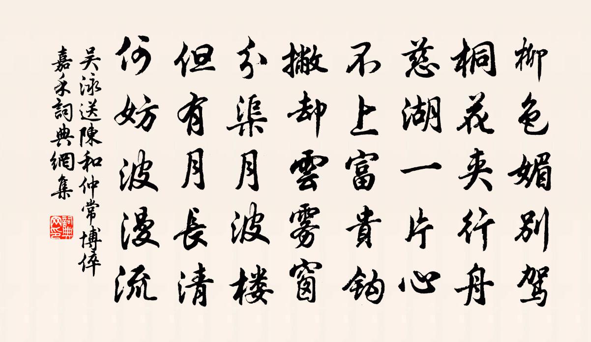 詩詞名句歷史字典書法欣賞書法字典國語詞典說文解字康熙字典古漢語字典標 題 作 者 詩 句 送陳和仲常博倅嘉禾作者:吳泳 朝代:宋代送陳和仲常博倅嘉禾原文柳色媚別駕,桐花夾行舟。慈湖一片心,不上富貴鉤。撇卻雲霧窗,分渠月波樓。但有月長清,何妨波漫流。詩詞問答問:送陳和仲常博倅嘉禾的作者是誰?答:吳泳問:送陳和仲常博倅嘉禾寫於哪個朝代?答:宋代吳泳送陳和仲常博倅嘉禾書法欣賞送陳和仲常博倅嘉禾書法作品詩詞推薦歲晚雜興王同祖〔宋代〕時勢危棋局轉低,丈夫有志意何為。優遊輸與田家樂,問看朝廷事不知。琴歌嵇康〔兩漢〕凌扶搖兮憩瀛洲。要列子兮為好仇。餐沆瀣兮帶朝霞。眇翩翩兮薄天游。齊萬物兮超自得。委性命兮任去留。章樞密輓詩虞儔〔宋代〕引年歸老十星霜,養素遺榮道愈光。可但蒼生思謝傅,未應白首愧馮唐。龍光方慶千齡遇,鳳誥俄嗟一鑒亡。前輩句吳璋〔宋代〕各自芬芳花默默,兩相呼喚鳥津津。省中當直書懷呈諸同舍楊億〔宋代〕太微西掖鳳池邊,阿閣凌空瓦起煙。彩筆時批尺一詔,直廬深在九重天。早朝螭陛爐香近,書寢難人漏唱傳。祇恐再過宜興舟中見芍藥數枝憶淮鄉花之盛為之悵仲並〔宋代〕卻是溪頭訊息真,故園十載漫風塵。如今不問黃樓子,淺白輕紅自可人。禪人並化主寫真求贊釋正覺〔宋代〕祖祖家傳,心心印全。混沌未受鑿,威音不得專。蕉雷文象齒之所以,桂月暈犀角之能然。水自竹來兮綠非假借,【中呂】快活三過朝天子_偕程令尹游張可久〔元代〕偕程令尹游煙蘿洞農成耒耜功,吏散簿書叢。一樽還許野人同,郊外聯飛鞚。二公,意濃,破五日淵明俸。梅邊醉邊思劉滄〔唐代〕漢將邊方背轆轤,受降城北是單于。黃河晚凍雪風急,野火遠燒山木枯。偷號甲兵沖塞色,銜枚戰馬踏寒蕪。蛾眉永王東巡歌·其七李白〔唐代〕王出三山按五湖,樓船跨海次陪都。戰艦森森羅虎士,征帆一一引龍駒。叔父惠鉢三首陳師道〔宋代〕 * 未有祖師意,洗鉢何曾識趙州。萬里空歸君解否,老胡端為我能留。四安舟上董嗣杲〔宋代〕復添三嘆處,回泊四安時。野市人言獷,官坊酒味醨。聚船要價重,滌釜待糧遲。客況那通遣,終身厭路岐。秋風嘆四首吳潛〔宋代〕誰將訟風伯,謂天懲雨師。天閽幾萬里,聵聵安得知。和朱純臣兵部上巳錫宴蘇頌〔宋代〕故事修春禊,恩筵啟鳳林。風光來莽蒼,和氣動幽沈。六豆分餚貴,千鍾酌醴深。執蘭游洧水,忘味聽韶音。鳧藻雨霽幽興寄張欽夫楊萬里〔宋代〕大官有重荷,豐廩無薄憂。草茹我豈腴,飽亦與彼侔。積雨久自霽,曙光清以幽。欣然出荊扉,不出旬已周。初意題柴言山水陸游〔宋代〕陰陰山木合,幽處著柴荊。喧中有靜意,水車終日鳴。和傅寺丞竹穩之什清風陳宓〔宋代〕暑氣人間盛,煩襟此地開。拂雲千個竹,不礙晚風來。浣溪沙王哲〔元代〕大道無名似有名。達磨麵壁九年清。釋迦坐雪六年精。奪得真空真妙用,一通門裡出圓明。大羅天上聚圓成。懷李仲明李流謙〔宋代〕斜暉放船好,晚好得涼多。星斗窺深酌,魚龍答浩歌。乾坤身半老,湖海意如何。夙昔紉蘭約,遲君肯重過。呈余伯皋翁卷〔宋代〕木犀香殘菊花拆,多少秋風吹隴陌。我行欲遍江西州,最後方作筠陽客。筠陽之州水中隔,古來稱是神仙宅。今君名句推薦遠送從此別,青山空復情。杜甫《奉濟驛重送嚴公四韻》 遮莫圓明似前度,不知誰續廣寒游。慧霖《閏中秋玩月》 白水明田外,碧峰出山後。王維《新晴野望》 前村後壟桑柘深,東鄰西舍無相侵。貫休《春晚書山家屋壁二首》 誰念遷客歸來,老大傷名節。李綱《六么令·次韻和賀方回金陵懷古鄱陽席上作》 妾身悔作商人婦,妾命當逢薄倖夫。徐再思《陽春曲·閨怨》 丈夫為志,窮當益堅,老當益壯。范曄《後漢書·列傳·馬援列傳》 海燕歲微渺,乘春亦暫來。張九齡《歸燕詩》 雲盡月如練,水涼風似秋。歐陽詹《荊南夏夜水樓懷昭丘直上人云夢李莘》 舉賢任能,不時日而事利。尉繚《尉繚子·戰威》
