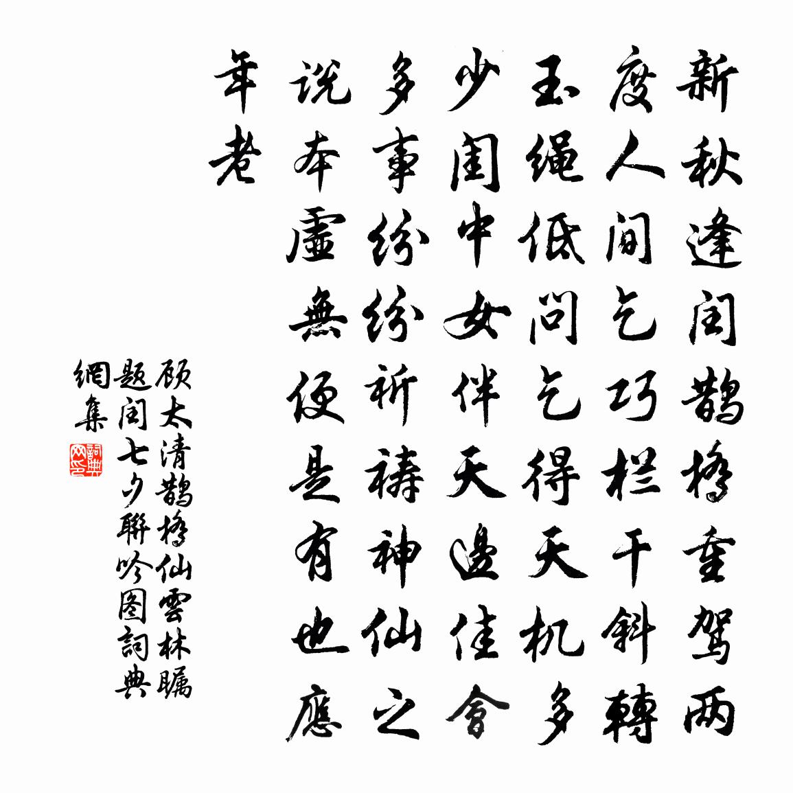 這是一首題畫詞,畫為雲林所繪《閏七夕聯吟圖》的仕女圖。七夕聯吟的是畫的主題,所以詞人從七夕寫起。七月七日是牛郎織女相會的佳期,銀河的鵲橋架起來了。因為作畫之時時逢閏七月,有了兩個佳期,橋也再次“重駕”,而人間也有了兩次乞巧活動,女子們希望乞得終生幸福,找到一位如意郎君的機會也有兩次。詞人問,她們在斗轉星移,星光也在移動的夜晚,不知乞得了多少天機。詞人對此提出了疑問。因為年年有七巧節,也年年有乞巧活動,但婦女們也未必總是幸福,原因是世間總是“多事紛紛”。神話故事,本來“虛無”,“便是有”,牛郎織女“也應年老”了。詞人對於男女婚姻愛情的幸福的追求寄予同情,但又做出疑惑的結論,這是現實生活的反映。這幅仕女圖,住在表現女性美,其中也包括了畫中她們所表現出來的內心美。詞人捨棄了歷來對於這種美的歌頌,而別出機杼地引導出了一個富有哲理性的命題,即美麗的願望,在人間常常是難以如願的。它啟發人思考,同時也深化了詞的思想主題。