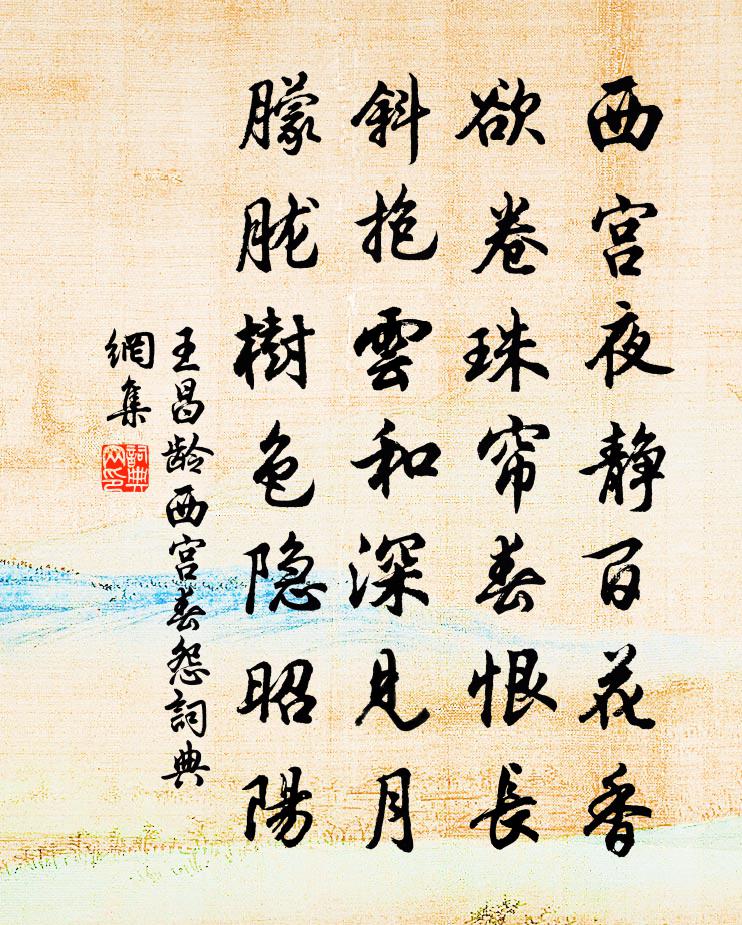 詩的末句交待了她在月下凝望的是什麼,又望到了什麼。“朦朧樹色隱昭陽”,就是她隔簾望見的景色。這一句,既是以景結情,又是景中見情。句 * 別值得玩味的是點出了皇帝所在的昭陽宮。這與作者另一首《長信秋詞》的結尾“臥聽南宮清漏長”句中點出南宮的意義是相同的。它暗示詩中人所凝望的是皇帝的居處,而這正是她的怨情所指。但是,禁閉著大批宮人的西宮與昭陽殿之間隔著重重門戶,距離本來就很遙遠,更何況又在夜幕籠罩之中,詩中人所能望見的只是一片朦朦朧朧的樹影而已。這時透過一層、深入一步的寫法,寫詩中人想把怨情傾注向昭陽宮,而這個昭陽宮卻望都望不見,這就加倍說明了她的處境之可憐。