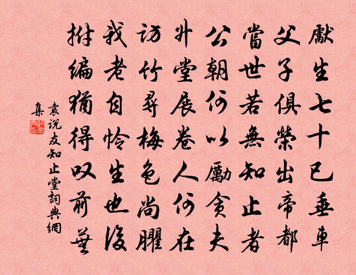 詩詞名句歷史字典書法欣賞書法字典國語詞典說文解字康熙字典古漢語字典標 題 作 者 詩 句 知止堂作者:袁說友 朝代:宋代知止堂原文先生七十已垂車,父子俱榮出帝都。當世若無知止者,公朝何以勵貪夫。升堂展卷人何在,訪竹尋梅色尚臞。我老自憐生也後,拊編猶得嘆前蕪。詩詞問答問:知止堂的作者是誰?答:袁說友問:知止堂寫於哪個朝代?答:宋代袁說友知止堂書法欣賞知止堂書法作品詩詞推薦送聖徙入京兼呈紀常子進范祖禹〔宋代〕二年隔京洛,思見亦已久。驪駒將戒行,姑共一杯酒。君來買園林,山川既富有。顧我猶旅人。安排臥林藪。不意滿江紅晦庵〔宋代〕膠擾勞生,待足後、何時是足。據見定、隨家豐儉,便堪龜縮。得意濃時休進步,須知世事多翻覆。漫教人、白了正月十日夜大雷震范成大〔宋代〕人言有物司鼓,春到揚桴發聲。但要蟄蟲啟戶,何須一許震驚?送高適(一作道非)弟耽歸臨淮作王維〔唐代〕(冊4 卷125 頁1243c)〔坐上作〕少年客淮泗。落魂居下邳。遨遊向燕趙。結客過臨淄。山東諸侯國山居雜詩九十首曹勛〔宋代〕隔歲種成麥,起麥秧稻田。晚禾亦云竟,冬菜碧相連。收割不閒手,壠畝無空阡。家蓄千指客,始知常有年。太上皇帝靈駕發引輓歌詞六首范成大〔宋代〕傳聖家人禮,凝神象帝先。勛華今歷數,汾社古山川。眾父尊歸父,中天更有天。壽宮何所厭,亟上白雲仙。次韻徐庭珍春日雜言十首陳棣〔宋代〕燕雀經營競短檐,未容蝶夢到花前。吾生幾閱春榮謝,自嘆如蠶已再眠。歸田劉子翬〔宋代〕聲色家有阱,軒裳仕之囚。冥行不知迷,今將返吾輈。愛慕洗余習,清虛樂孤游。亭亭隱仙岩,迎人入雙眸。稻色橫溪回道中作強至〔宋代〕赤雲蔽層霄,旱日作炎酷。解帶蔭廣廈,膚汗發如沐。世無廣寒宮,何地避蒸溽。嗟嗟尚未已,里胥報甚速。雲有清平樂(送賈耘老、盛德常還郡。時飲官酒於東堂,二君許復過此)毛滂〔宋代〕杏花時候。庭下雙梅瘦。天上流霞凝碧袖。起舞與君為壽。兩橋風月同來。東堂且沒塵埃。煙艇何時重理,更憑風杳杳寒山道寒山〔唐代〕杳杳寒山道,落落冷澗濱。啾啾常有鳥,寂寂更無人。淅淅風吹面,紛紛雪積身。朝朝不見日,歲歲不知春。解瞌睡頌黃庭堅〔宋代〕文殊吐酒臥,觀音被杻械。普賢盜鑄錢,釋迦扇爐韝。范上座殺牛,黃魯直害癩。與潘仲達二首張耒〔宋代〕淮陽牡丹花,盛不數京洛。姚黃一枝開,眾艷氣如削。亭亭風塵表,獨立朝萬萼。誰知臨老眼,更復美葵藿。立春杜甫〔唐代〕春日春盤細生菜,忽憶兩京梅發時。盤出高門行白玉,菜傳縴手送青絲。巫峽寒江那對眼,杜陵遠客不勝悲。此身偈頌一百二十三首釋普度〔宋代〕手指天,腳踏地。目顧四方,真少兒戲。自言惟我獨尊,天上人間誹誹。高宗祀明堂前朝享太廟二十一首真宗〔宋代〕明哲煌煌,照臨無疆。丕承先志,嘉靖多方。朝延尊榮,民庶樂康。珍符來應,錫茲重光。即事陳宓〔宋代〕黠鼠同奸吏,貪狡勝勇兵。盆翻施計巧,血戰視身輕。拙笑龜怡患,飢憐螢獨清。貂蟬何物者,冠晚得光榮。都下送辛大之鄂孟浩然〔唐代〕南國辛居士,言歸舊竹林。未逢調鼎用,徒有濟川心。余亦忘機者,田園在漢陰。因君故鄉去,遙寄式微吟。送懷安林知丞之官仍謝佳句陳宓〔宋代〕劍津初筮著能名,大府今看佐屬城。愧我贈行無好語,只將戒懼與明誠。古宮詞十首劉克莊〔宋代〕繐帳渾如舊,何曾奏伎來。君王不終惠,留妾在空台。名句推薦朔吹飄夜香,繁霜滋曉白。柳宗元《早梅》 江上小堂巢翡翠,苑邊高冢臥麒麟。杜甫《曲江二首》 子用私道者家必亂,臣用私義者國必危。劉向《戰國策·趙二·趙燕後胡服》 羈鳥戀舊林,池魚思故淵。陶淵明《歸園田居·其一》 滄海客歸珠有淚,章台人去骨遺香。宋祁《落花》 秋草六朝寒,花雨空壇。朱彝尊《賣花聲·雨花台》 五原春色舊來遲,二月垂楊未掛絲。張敬忠《邊詞》 三年遇寒食,盡在洛陽城。白居易《洛橋寒食日作十韻》 春夢隨雲散,飛花逐水流,寄言眾兒女,何必覓閒愁。曹雪芹《紅樓夢·第五回》 零落江南不自由。兩綢繆。料得吟鸞夜夜愁。姜夔《憶王孫·番陽彭氏小樓作》
