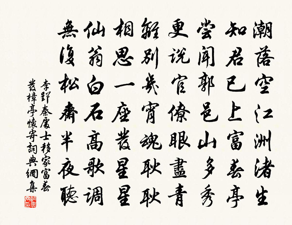 詩詞名句歷史字典書法欣賞書法字典國語詞典說文解字康熙字典古漢語字典標 題 作 者 詩 句 秦處士移家富春發樟亭懷寄作者:李郢 朝代:唐代秦處士移家富春發樟亭懷寄原文潮落空江洲渚生,知君已上富春亭。嘗聞郭邑山多秀,更說官僚眼盡青。離別幾宵魂耿耿,相思一座發星星。仙翁白石高歌調,無復松齋半夜聽。詩詞問答問:秦處士移家富春發樟亭懷寄的作者是誰?答:李郢問:秦處士移家富春發樟亭懷寄寫於哪個朝代?答:唐代問:秦處士移家富春發樟亭懷寄是什麼體裁?答:七律李郢秦處士移家富春發樟亭懷寄書法欣賞秦處士移家富春發樟亭懷寄書法作品注釋全唐詩:卷590-25詩詞推薦守居園池雜題野人廬文同〔宋代〕蕭條野人廬,籬巷雜蓬葦。每一過衡門,歸心為之起。海邊亭為浩然賦張斛〔金代〕夙有滄州趣,雲扃夢幾回。臨深疑地盡,望遠覺天開。月涌冰輪出,濤翻雪陣來。無機同海客,鷗鳥莫相猜。西江月辛棄疾〔宋代〕堂上謀臣帷幄,邊頭猛將干戈。天時地利與人和。燕可伐與曰可。此日樓台鼎鼐,他時劍履山河。都人齊和大風歌春日訪李十四處士溫庭筠〔唐代〕花深橋轉水潺潺,甪里先生自閉關。看竹已知行處好,望雲空得暫時閒。誰言有策堪經世,自是無錢可買山。一局詠才德魯訔〔宋代〕韻如風蟬蛻塵垢,氣如春容在楊柳。風流翰墨俱細事,自是吾家道門友。對雪二首再用前韻王之道〔宋代〕我笑袁司徒,閉戶雪中市。高眠罷炊爨,冰榻對瑤砌。豈如王孝伯,鶴氅斗清媚。隨負楊柳花,縱橫撲襟袂。冬溫贈蜀醫鍾正甫文天祥〔宋代〕炎皇鑒從草,異種多西州。為君望岷峨,使我雙淚流。向來秦越人,朝洛夕邯鄲。子持鵲經來,自西亦徂南。江南至南京道中尚有鶯聲吳則禮〔宋代〕投老長亭更短亭,翩翩楚柁正關情。黃鸝要是知人意,猶作他時求友聲。更漏子·秋張淑芳〔宋代〕墨痕香,紅蠟淚。點點愁人離思。桐葉落,蓼花殘。雁聲天外寒。五雲嶺,九溪塢。待到秋來更苦。風淅淅,水淙和豫章公黃梅二首陳師道〔宋代〕色輕花更艷,體弱香自永。玉質金作裳,山明風弄影。秋日山居好十首舒岳祥〔宋代〕秋日山居好,新涼及早興。玉餐陽塢米,冰嚼下洪菱。海錯來蒲港,溪鮮出石屏。欲從逋客逝,為此未之能。慈恩寺石磬歌盧綸〔唐代〕靈山石磬生海西,海濤平處與山齊。長眉老僧同佛力,咒使鮫人往求得。珠穴沈成綠浪痕,天衣拂盡蒼苔色。星漢三疊劉克莊〔宋代〕濡墨先愁染素衣,和鉛亦恐浼冰肌。後村老子無聲畫,壓倒花光與補之。題廬山白蓮社十八賢圖方回〔宋代〕六老臞儒十二僧,柴桑醉士肯為朋。葫蘆自與葫蘆纏,更要閒人纏葛藤。合流遇潘子真,出斯文相示,因置酒。子真,李之儀〔宋代〕山谷老子久不見,豫章詩人何許來?章江未覺清澈骨,西山一帶寒煙開。文章明鏡現諸相,句律蟄戶驚春雷。紅爐陳文懿公輓詞樓鑰〔宋代〕一別屢經歲,歸舟已及門。方期情話悅,空訝語音存。善行傳千載,蕪詞愧九原。傷心歌楚些,無地可招魂。宿王闢宅與王專洎用晦上人因成聯句王闢〔宋代〕夜淺月未生,春寒雪猶在。吳僧攜古琴,來與山人會。詩心有是非,禪話無慷慨。高鴻自冥冥,弋者復何害。簡唐英同年四首袁說友〔宋代〕早起孤舟掀浪中,自憐老大要飄蓬。風前索酒輕寒殺,夢裡尋詩始意窮。帆飽急隨山腳去,櫓回強趁水頭東。明朝廣鑒大師觀上人為靈芝數百眾故乞從檀施乞米毛滂〔宋代〕靈芝有良田,歲比萬戶侯。平生有力耕,以德作耡耰。不許倉箱豐,但知缽盂秋。木魚一呼飯,千屐如水流。靈芝喜晴釋文珦〔宋代〕經旬雨不斷,今日喜新霽。杖策東皋行,桑柘陰翳翳。蠶老欲登箔,菜麥亦可刈。田園足生理,外此盡誤計。父老名句推薦漢女輸橦布,巴人訟芋田。王維《送梓州李使君》 善作者,不必善成;善始者,不必善終。劉向《戰國策·燕二·昌國君樂毅為燕昭王合五國之兵而攻齊》 客從遠方來,遺我雙鯉魚。佚名《飲馬長城窟行》 豪華盡成春夢,留下古今愁。康與之《訴衷情令·長安懷古》 壯別天涯未許愁,盡將離恨付東流李大釗《口占一絕(壯別天涯未許愁)》 鳥下綠蕪秦苑夕,蟬鳴黃葉漢宮秋。許渾《鹹陽城東樓 / 鹹陽城西樓晚眺 / 西門》 春田龜坼苗不滋,猶賴立春三日雪。王士禎《春不雨》 三極彝訓,訓深稽古。致化歸一,分教斯五。劉勰《文心雕龍·宗經》 福在積善,禍在積惡。黃石公《素書·安禮》 絕頂茅庵里,老衲正孤吟。納蘭性德《水調歌頭·題西山秋爽圖》