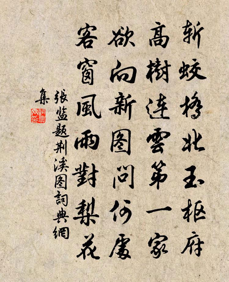 詩詞名句歷史字典書法欣賞書法字典國語詞典說文解字康熙字典古漢語字典標 題 作 者 詩 句 題荊溪圖作者:張監 朝代:宋代題荊溪圖原文斬蛟橋北玉樞府,高樹連雲第一家。欲向新圖問何處,客窗風雨對梨花。詩詞問答問:題荊溪圖的作者是誰?答:張監問:題荊溪圖寫於哪個朝代?答:宋代張監題荊溪圖書法欣賞題荊溪圖書法作品詩詞推薦太液黃鵠歌漢始元元年春二月,黃鵠下建章宮陸游〔宋代〕建章宮裡春風寒,太液水生池面寬。中人馳奏黃鵠下,龍旗豹尾臨池看。芹香藻暖鵠得意,左右從官呼萬歲;須臾剔銀燈(途次南京憶營妓張溫卿)沈邈〔宋代〕一夜隋河風勁。霜濕水天如鏡。古柳堤長,寒煙不起,波上月無流影。那堪頻聽。疏星外、離鴻相應。須信道、情奉同中道鎖宿南宮思寶奎殿前花樹子韓維〔宋代〕曾見芳春二月時,弱枝繁萼動輝輝。難忘絕艷驚心麗,重惜良游與意違。好事幾人能載酒,感時今日為沾衣。南宮書玻璃泉壁曹勛〔宋代〕秋夕淮天不肯明,壯懷沖斗若為情。臥聞隔水吹三弄,又喜孤城報五更。句梁周翰〔宋代〕百花將盡牡丹坼,十雨初晴主液春。次韻寄陳主管陳造〔宋代〕軺軿七十曉相追,記得張園敘拜時。香襯蕙蘭來北里,雲隨笙鶴燕仇池。朋簪重蓋寧人力,貧仕居卑聽化兒。只冀丹鳳吟陳允平〔宋代〕暗柳花煙深何處花,翡翠花櫳,鴛鴦樓閣。芹泥融潤,飛燕競穿珠幕。鞦韆倦倚,還思少年,襪步塵輕,衫裁羅薄冬夜吳龍翰〔宋代〕一屋白雲無鎖鑰,酒酣要摘梅花嚼。相逢石鼎老彌明,吟罷松梢月欲落。剔銀燈王哲〔元代〕今與重添惺惺。只是那亘初元性。急急修持,盈盈圓滿,子細剔開周正。通玄傳令。煉鍛出、自然清靜。一顆明珠西江月向滈〔宋代〕別後千思萬想,眼前一日三秋。小街欄檻記追游。料得新妝依舊。自笑非常蒂殢,為他無限閒愁。莫將離恨寄鄜州養疴丘葵〔宋代〕八尺空床坐養疴,老來真是病維摩。虛皇大道無為爾,造物小兒如我何。許大乾坤無處著,這些軀累人多。何當飛洞庭秋月王之道〔宋代〕扁舟夜泊蒹葭側,湖外雲間見明月。月光搖水制金蛇,坐想騷人賦秋色。舉杯向天屬姮娥,君當照坐吾當歌。全勝春閨陳允平〔宋代〕終日懷人倚翠闌,別長愁寬釧金寬。顰眉鈿葉拋鴛甃,彈淚燈花落鳳盤。梅粉有香供夜雨,柳絲無力受春寒。階前隗囂宮晚望許棠〔唐代〕西顧伊蘭近,方驚滯極邊。水隨空谷轉,山向夕陽偏。磧鳥多依地,胡云不滿天。秋風動衰草,只覺犬羊膻。方竹杖朱翌〔宋代〕此君骨相一成矩,氣稟坤爻六二全。運用四方隨手轉,操持一節比松堅。玉雕界尺疑同樣,金作觚稜笑削圓。見寄雜詩李復〔宋代〕權利為禍根,苟合非純士。嗟哉憑軾生,行見烹齊市。晴鳩不逐婦,猛虎不食子。魏國將樂羊,齊人疑吳起,兇險秦樓月 以上六首見中州樂府趙秉文〔金代〕簫聲苦。簫聲吹斷夷山雨。夷山雨。人空不見,吹台歌舞。危亭目極傷平楚。斷霞落日懷千古。懷千古。一杯還酹題桃花夫人廟徐照〔宋代〕一樹桃花發,桃花即是君。空祠臨野水,何處覓行雲。事跡樵人說,爐香過客焚。雨添碑上蘚,難讀古時文。對雨贈濟陰馬少府考城蔣少府兼獻成武五兄南華二兄劉長卿〔唐代〕繁雲兼家思,彌望連濟北。日暮微雨中,州城帶秋色。蕭條主人靜,落葉飛不息。鄉夢寒更頻,蟲聲夜相逼。二賢頌十玄談演教釋印肅〔宋代〕三世如來共所宣,至今不斷少人傳。塞鴻非是人驚起,風擊蘆鳴寫碧天。名句推薦積土成山,風雨興焉;積水成淵,蛟龍生焉;荀子《勸學》 不患無位,患所以立;不患莫已知,求為可知也。孔子弟子《論語·里仁篇》 裳裳者華,其葉湑兮。佚名《裳裳者華》 待約個梅魂,黃昏月淡,與伊深憐低語。柳如是《金明池·詠寒柳》 明眸皓齒誰復見,只有丹青余淚痕。蘇軾《虢國夫人夜遊圖》 從此信音稀,嶺南無雁飛。李師中《菩薩蠻·子規啼破城樓月》 小來思報國,不是愛封侯。岑參《送人赴安西》 君人者,愛民而安,好士而榮,兩者無一焉而亡。荀子《荀子·君道》 樓台處處迷芳草,風雨年年怨落花。曾棨《維揚懷古》 白草黃沙。月照孤村三兩家。蔣氏女《減字木蘭花·題雄州驛》